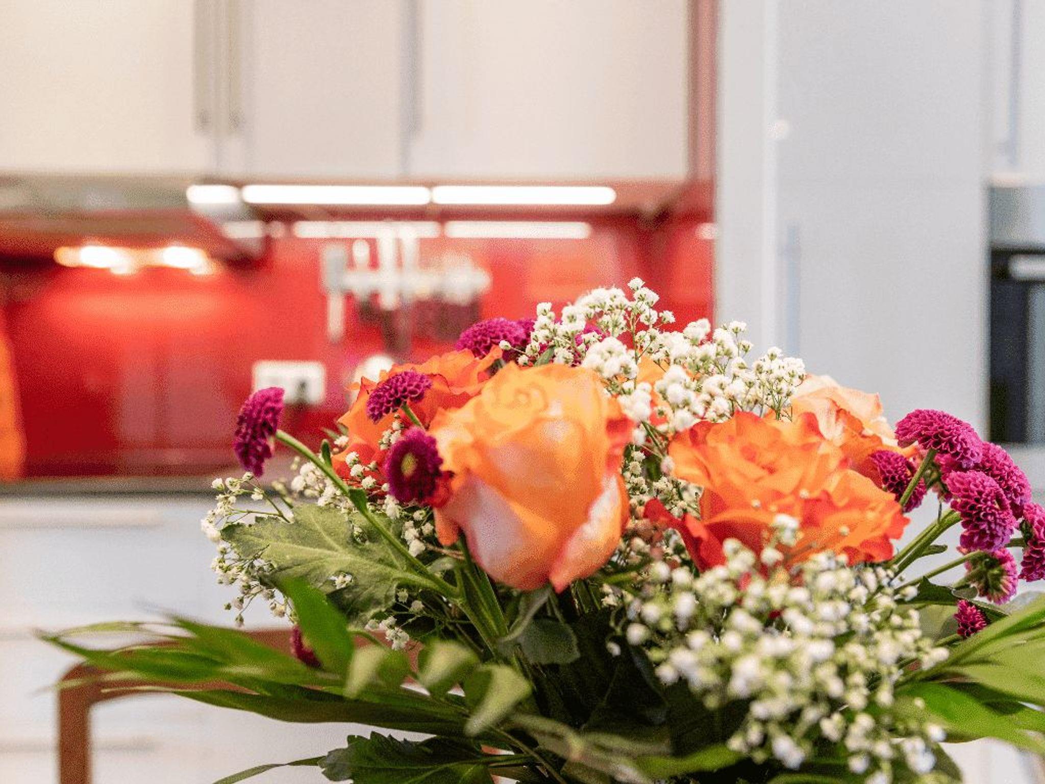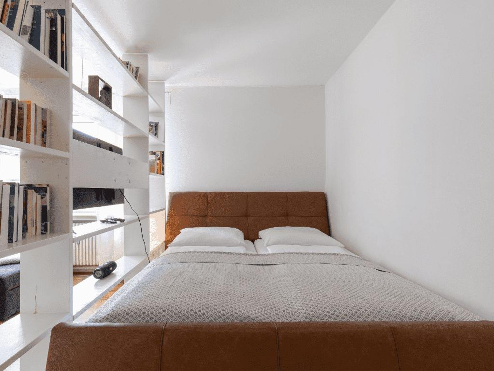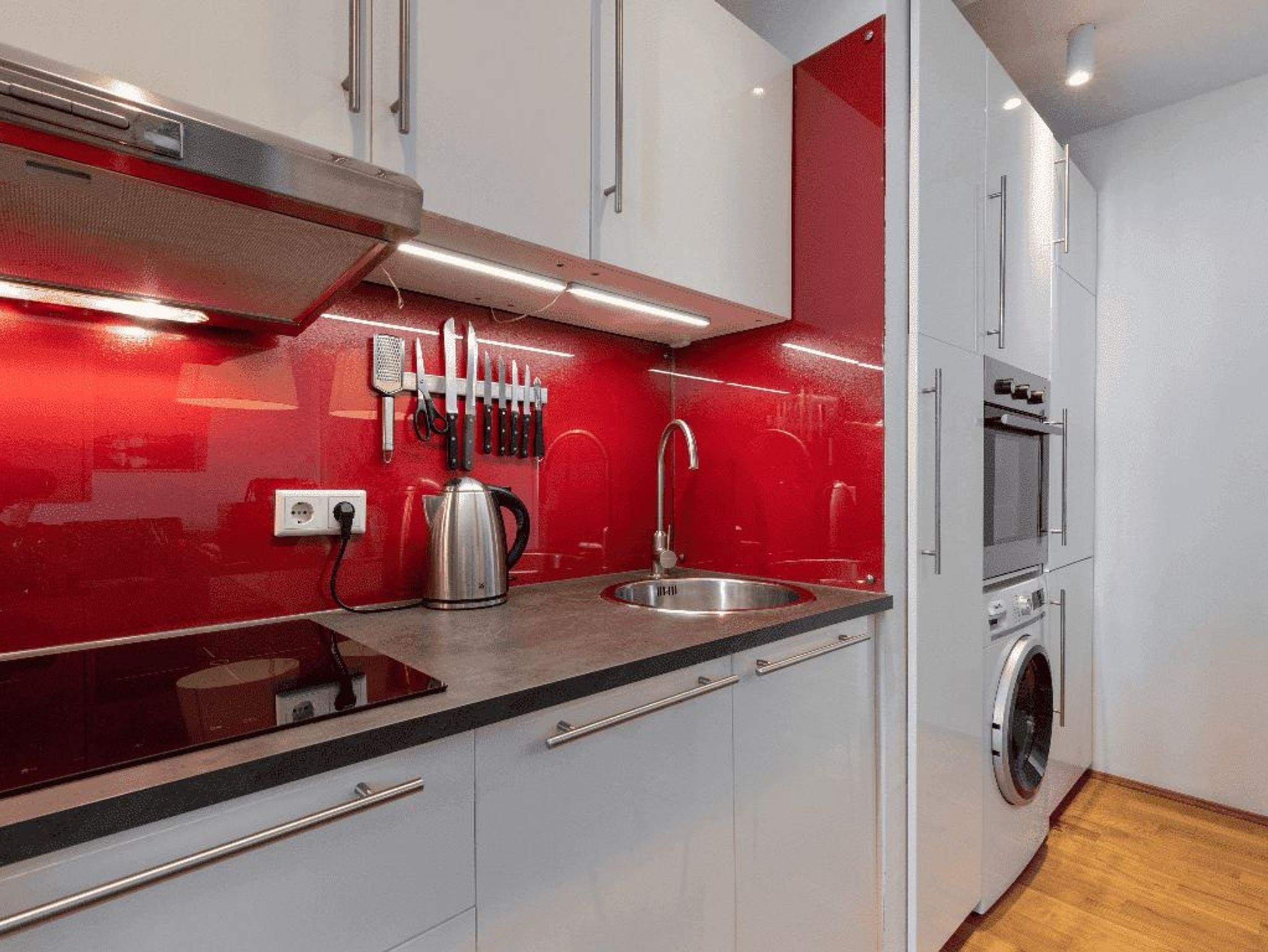 Bewundere antike Möbel und alte Truhen in diesem leuchtenden Refugium, das nur einen Steinwurf vom Geschehen entfernt liegt. Klare Linien, ganz in Weiß gehaltenes Dekor und glänzende Hartholzböden bilden den Hintergrund für eine tiefblaue Wand und eine rubinrote Küchenrückwand.