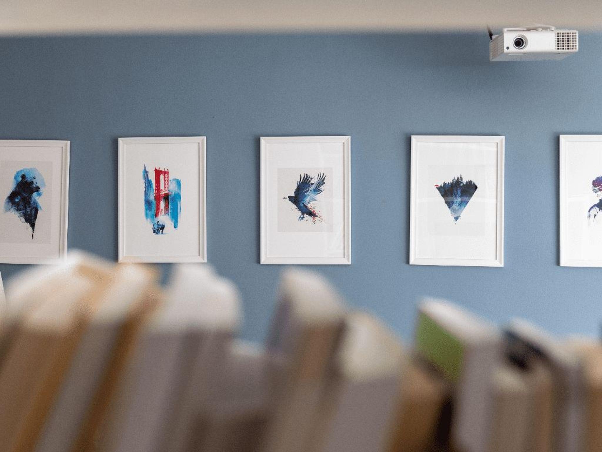 Klare Linien, ganz in Weiß gehaltenes Dekor und glänzende Hartholzböden bilden den Hintergrund für eine tiefblaue Wand und eine rubinrote Küchenrückwand.