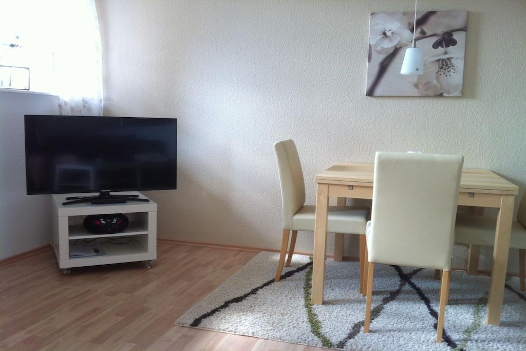 Wir heißen Sie herzlich Willkommen in der Burgwaldregion. Beschaulich und optimal geeignet für 2 Erwachsene. (mit Kind) auf einer Wohnfläche von 58m². Unsere Ferienwohnung, die im Jahr 2013, 2016 und 2020 vom DTV mit 3 Sternen klassifiziert wurde, liegt im Untergeschoss unseres Einfamilienhauses am Ortsrand von Niederasphe mit einer schönen Terrasse die nach Süd-Westen zeigt sowie Garten der über einen Zaun rundum gesichert ist. Sie verfügt über ein separates Schlafzimmer mit Doppelbett (bei Anreise bezogen und zusätzlichen Kopfkissen) und Babybett sowie einer Ess-, Wohnküche. Das Bad ist mit Fussbodenheizung, Regenschauerdusche, Handtücher, Handseife, Fön etc. ausgestattet. Die Küche ist mit allem ausgestattet was man zum Leben benötigt: Spülmaschine, Toaster, Eierkocher, Senseopadmaschine, Kaffeemaschine, Elektro-Herd mit Backofen, Gefrier-Kühl-Kombination. Das Ess-, Wohnzimmer beinhaltet eine gemütliche Schlafcouch (für Kinder) mit Esstisch und Satelitenfernsehen mit großem LED Flachbildschirm sowie CD-Radio-Anlage. Eine Internetverbindung über WLAN ist natürlich ebenso vorhanden. Auf der Terrasse mit Holzboden und Biergartengarnitur kann man das Abendessen bei untergehender Sonne genießen. Die Wohnung bietet natürlich einen eigenen PKW-Parkplatz sowie einen abschließbaren Fahrradabstellplatz. Ein Einkaufsladen mit eigenem Bäcker befindet sich direkt nebenan, 50m Fussweg.