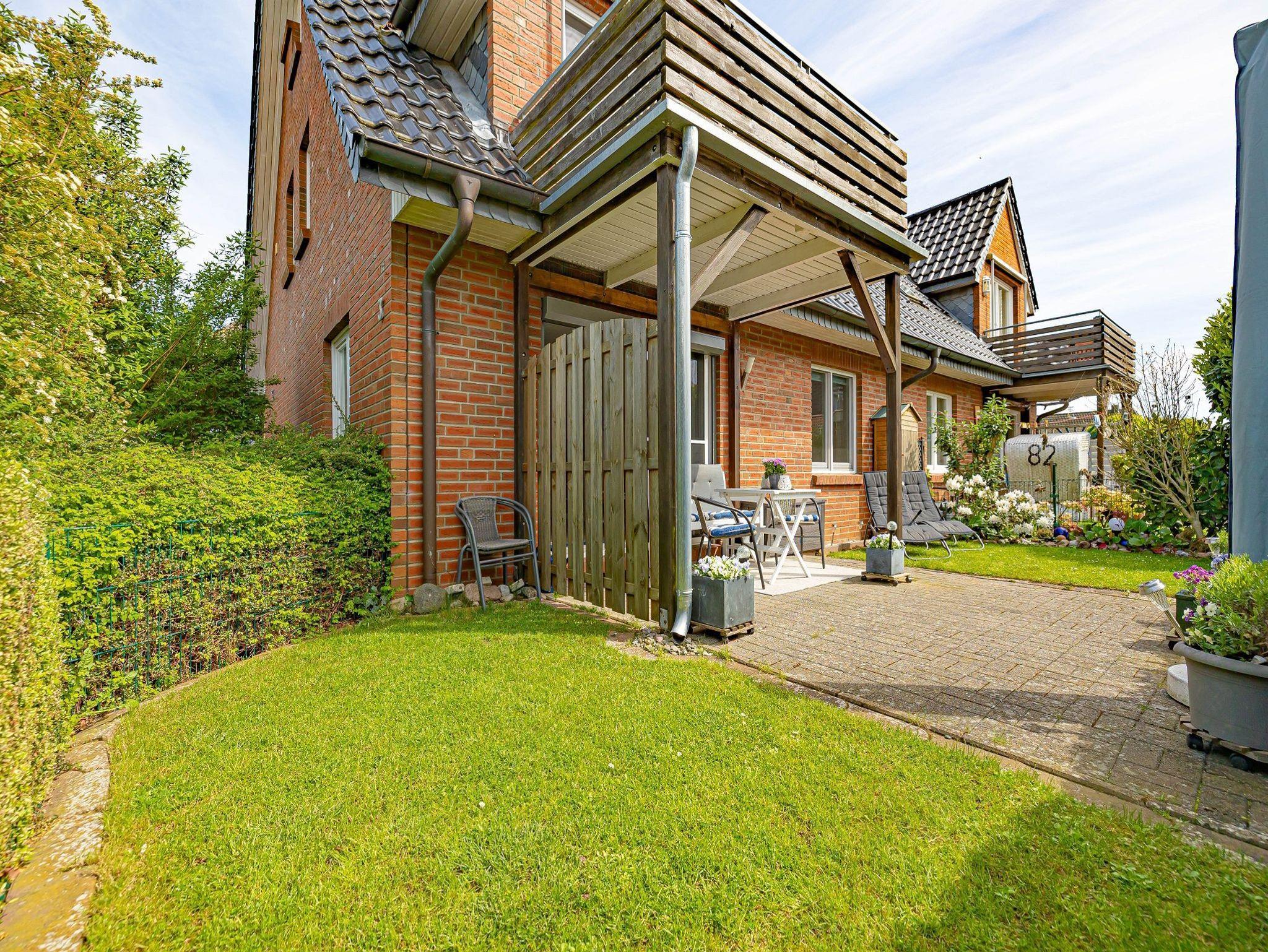Überdachte Terrasse mit Möbel, Sonnenschutz, Gartenliegen und umzäuntes kleines Grundstück