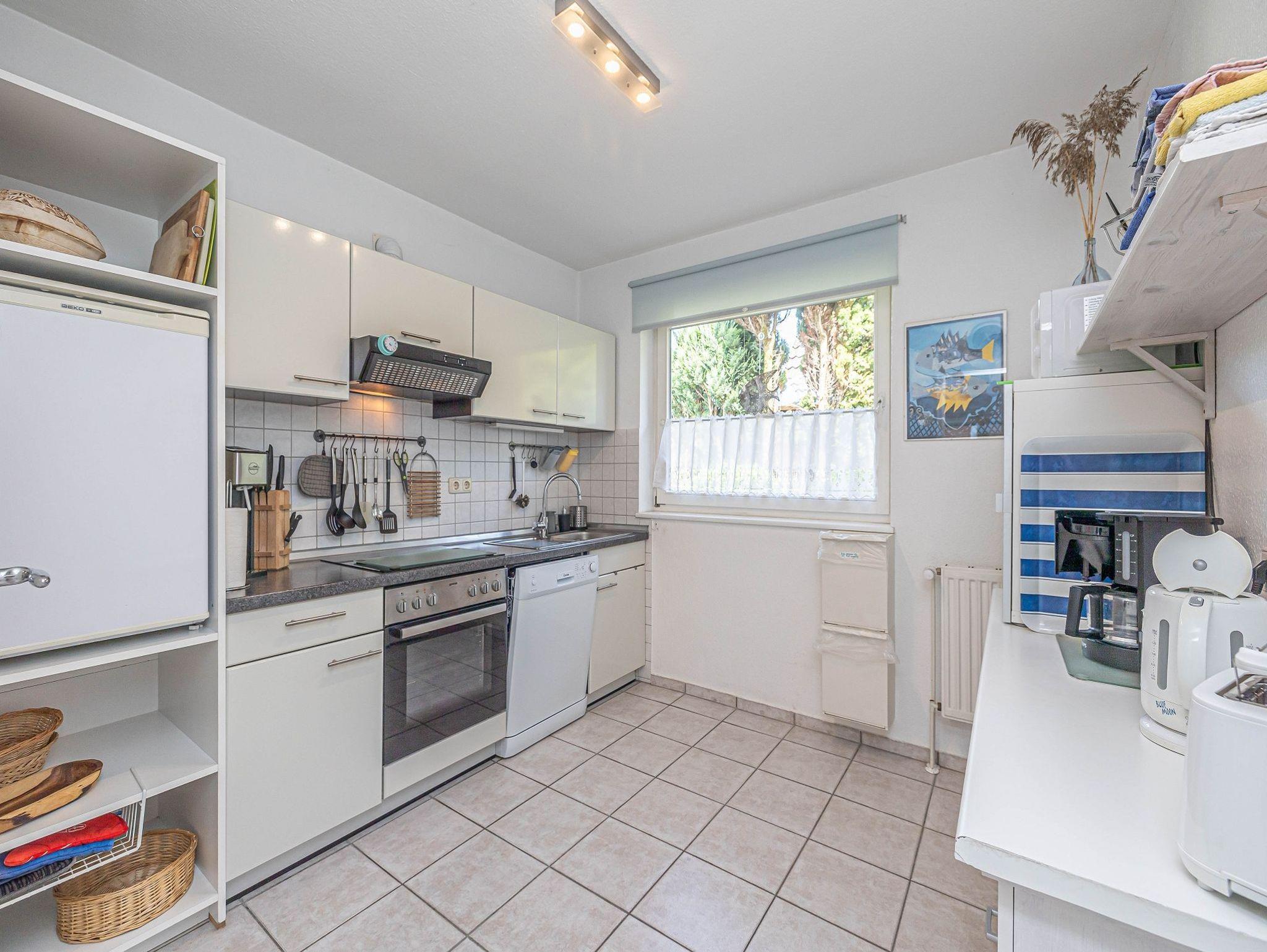 - komplett eingerichtete Küche (Kühlschrank, Gefrierfach, Geschirrspüler, Mikrowelle, Ceran-Kochfeld mit Backofen usw.
