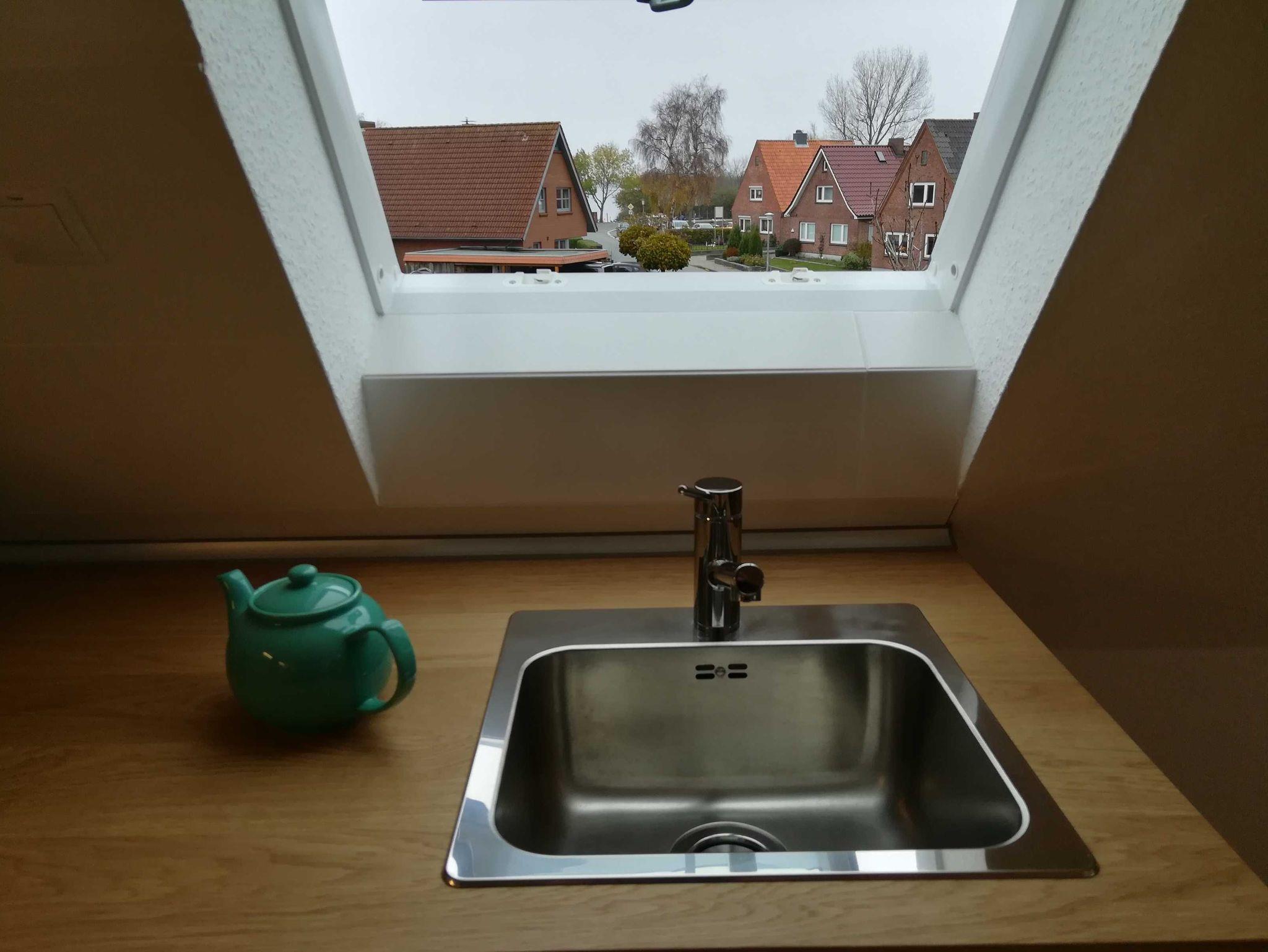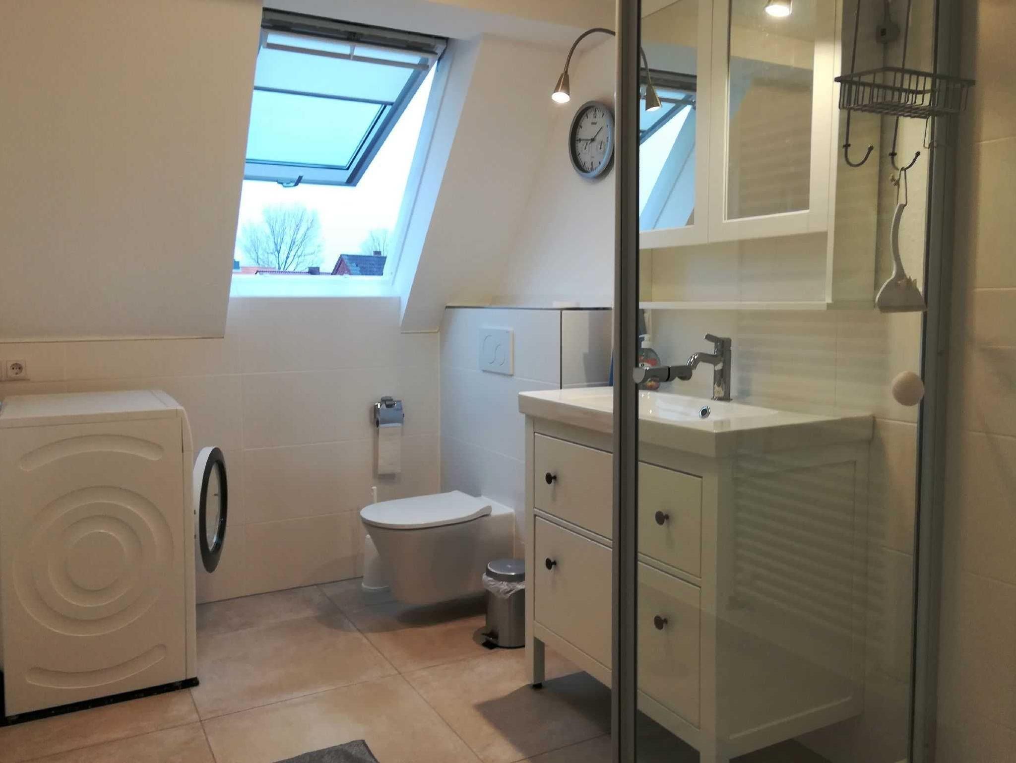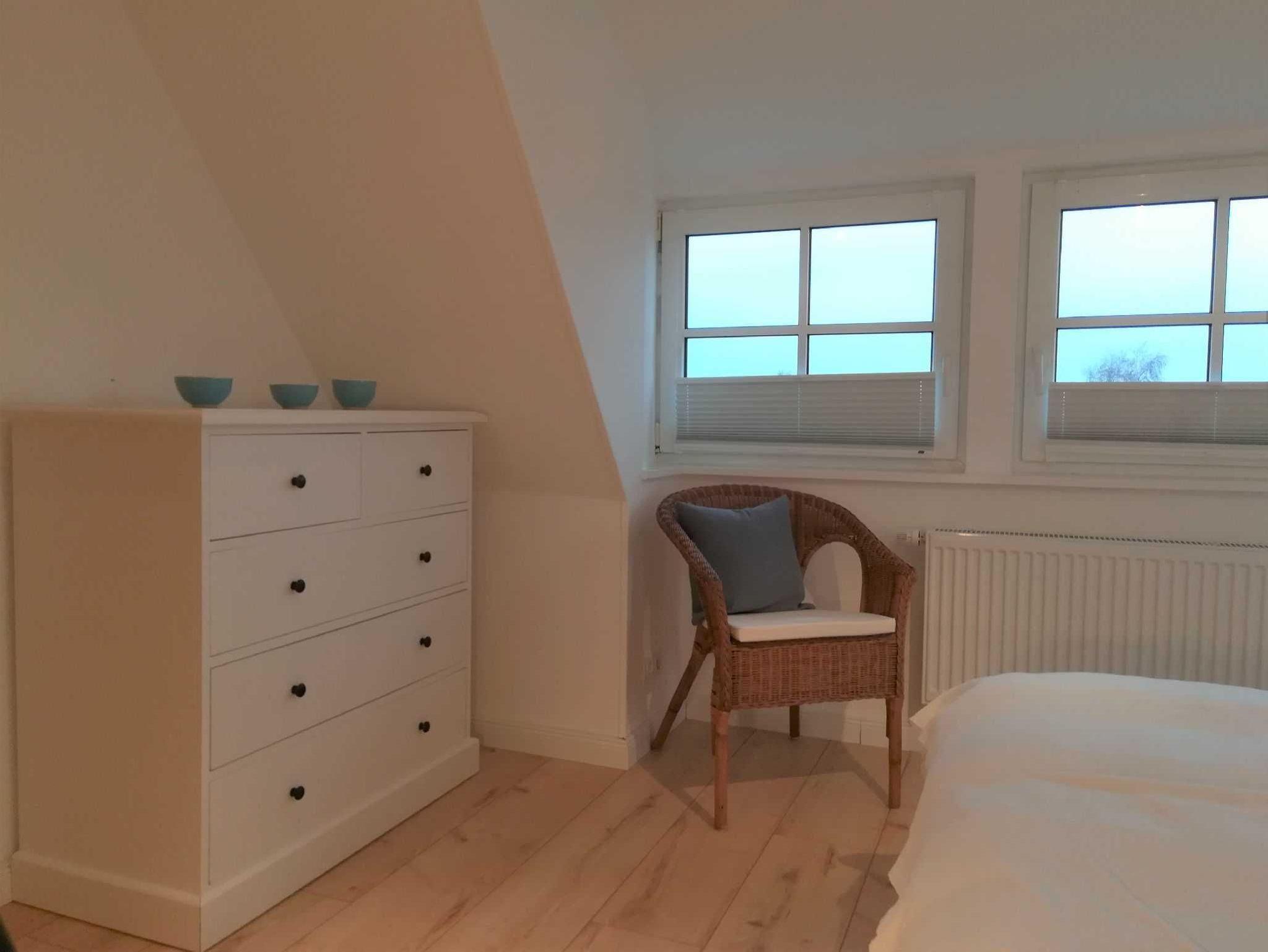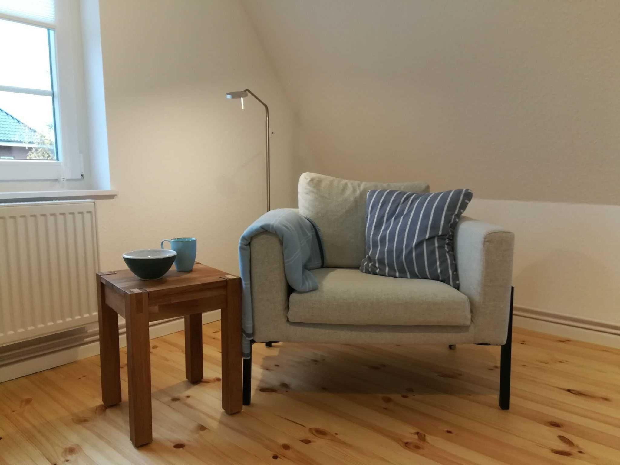 Durch einen ruhigen, umzäunten, mit Rosen bewachsenen Garten vorbei an der Terrasse betreten Sie den unteren Flur mit der Garderobe. Wohnküche, Bad und ein Schlafzimmer liegen im ersten Stock, ein zweites Schlafzimmer im Spitzboden. In beiden Schlafzimmern stehen Doppelbetten (1,80 m bzw. 1,60 m mit jeweils 2 Einzelmatratzen). Die Holztreppe vom Erdgeschoß in die Wohnetage ist etwas steil. Küche und Bad sind komfortabel ausgestattet. Unsere Wohnung ist maritim eingerichtet und in beruhigenden Naturfarben und -Materialien gehalten. In der Wohnetage verbreiten Holzböden und Fliesen Wohnlichkeit. Das Schlafzimmer im Spitzboden ist mit einem Bioboden ausgelegt. Die Deckenhöhe beträgt wie bei alten Häusern häufig etwa 2,10 m. Die Wohnung ist durch viele Fenster lichtdurchflutet. Sie ist eine Nichtraucherwohnung und für Haustiere nicht geeignet. Da die Erdgeschosswohnung vermietet ist, überlegen Sie bitte, ob sie bei mehr als zwei kleinen Kindern passend ist. Treppenschutzgitter für kleine Kinder und ein Kinderbett stehen zur Verfügung.