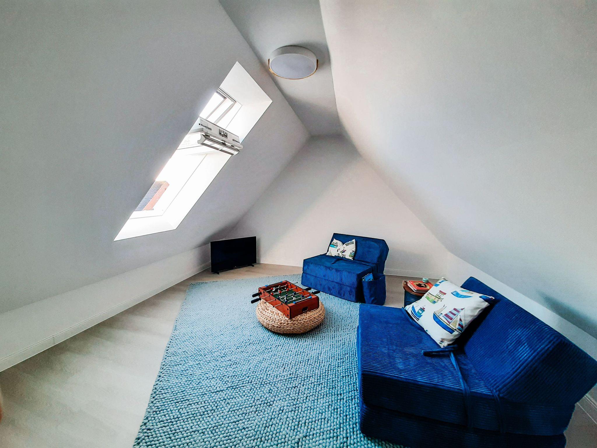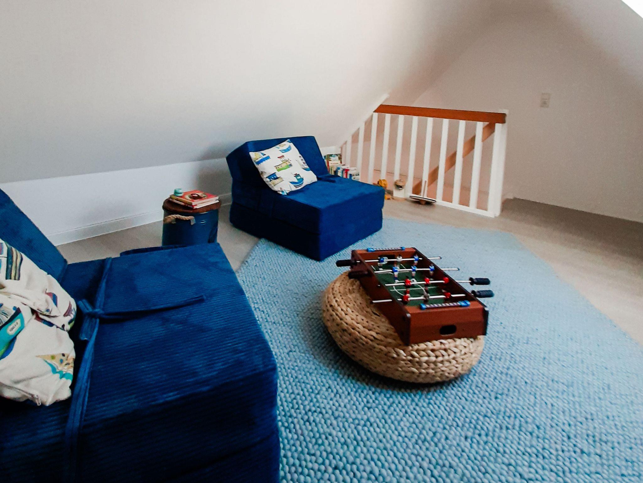 - über eine Treppe gelangt man in den offenen Spitzboden, der mit modernen Schlafsesseln ausgestattet ist. Von hier oben hat man einen traumhaften Blick auf den Hafen und das Meer.