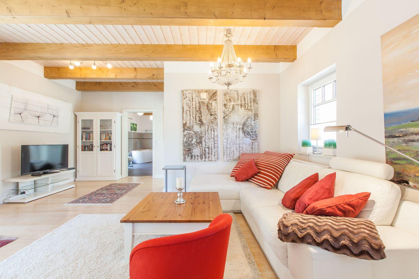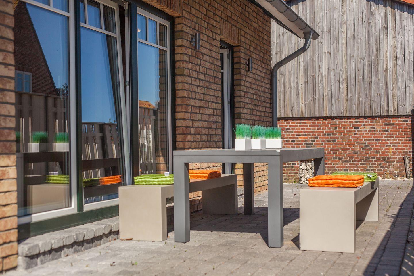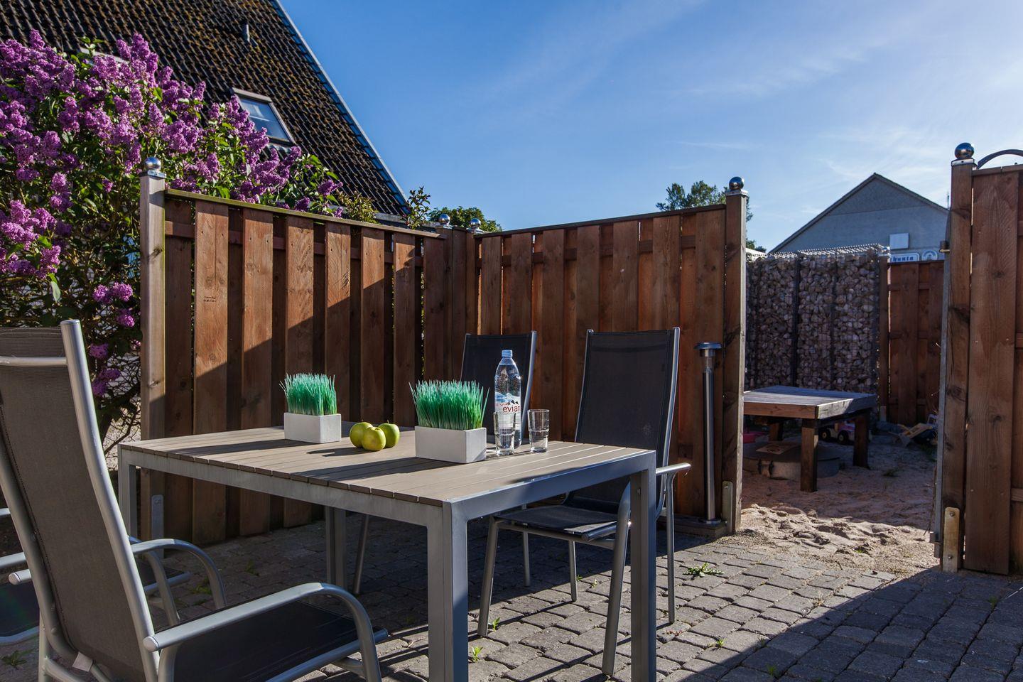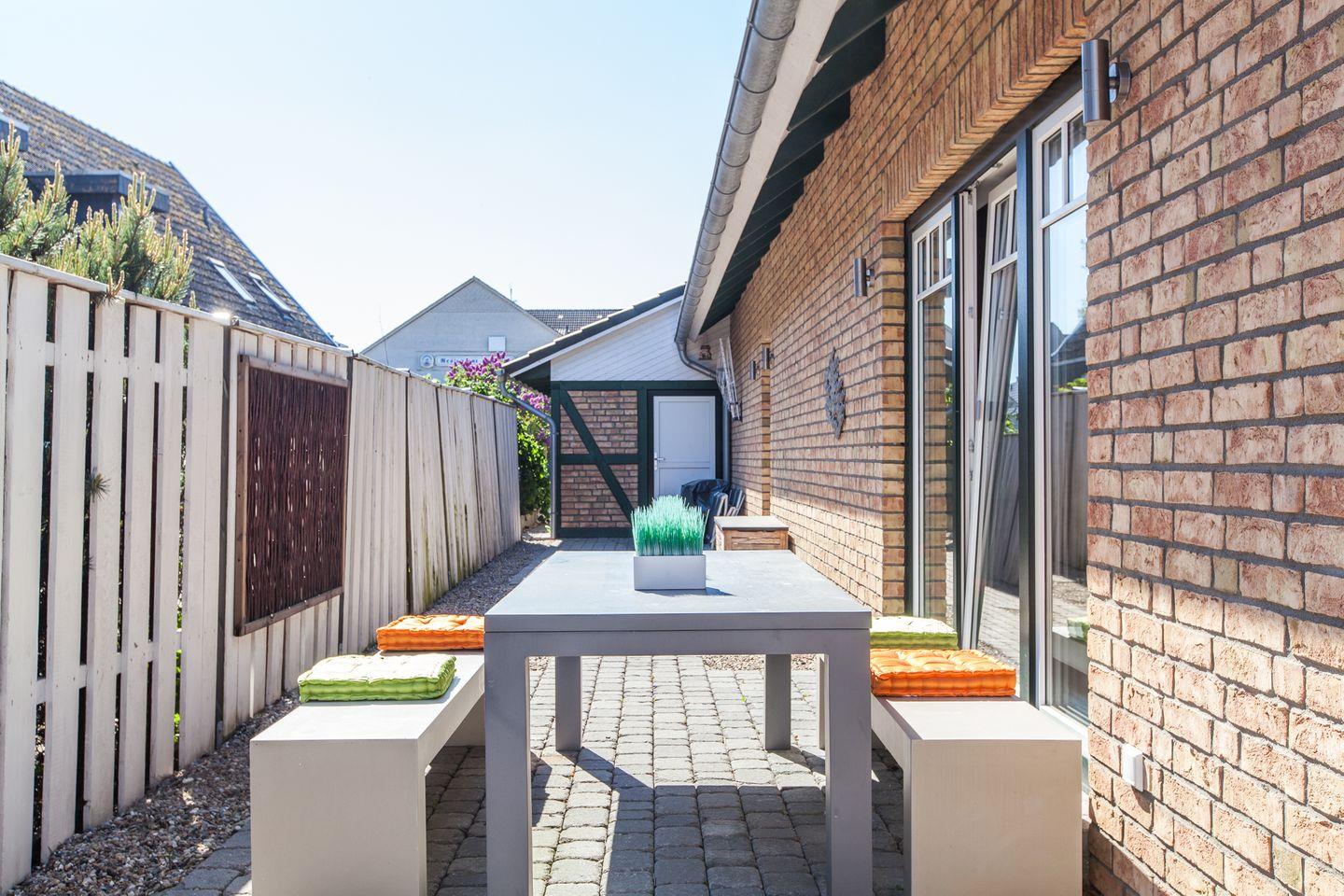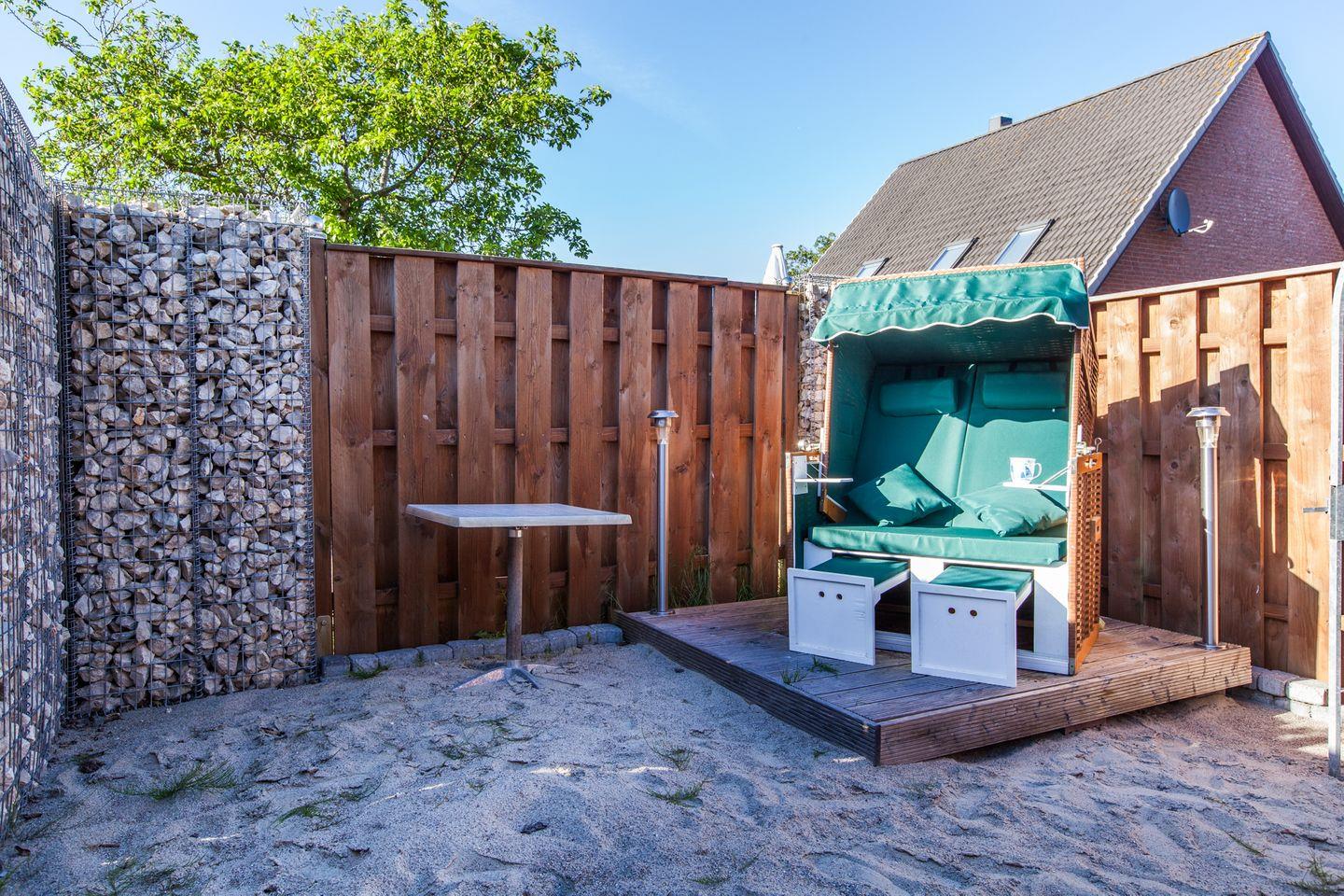 Im Außenbereich sind eigene PKW-Stellplätze, 2 herrliche Terrassen und ein Strand/Sandgarten mit Strandkorb und Sonnenliegen.