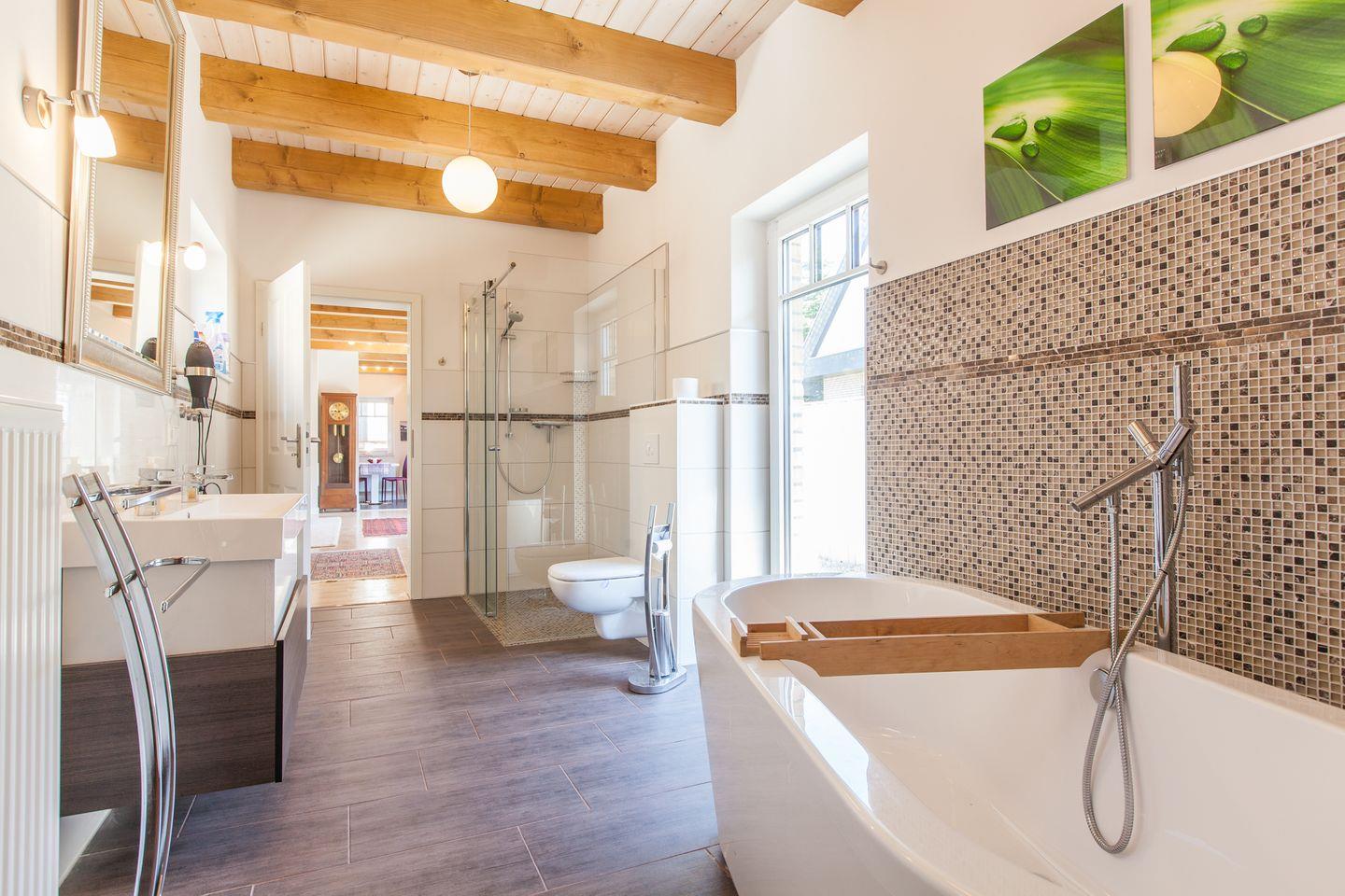 Das wunderschöne Tageslichtbad mit Wanne, bodengleicher Dusche, Infrarot-Sauna und Terrassenzugang lässt keine Wünsche offen.