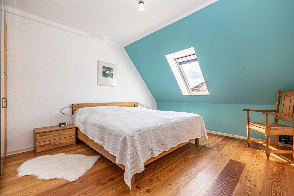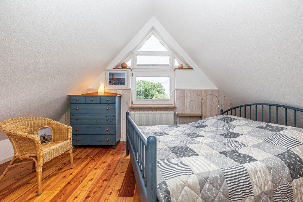 Das Bett im Schlafzimmer des Obergeschosses hat ein Bett der Maße 2x 90x200 cm, außerdem befindet sich dort ein Kleiderschrank.
