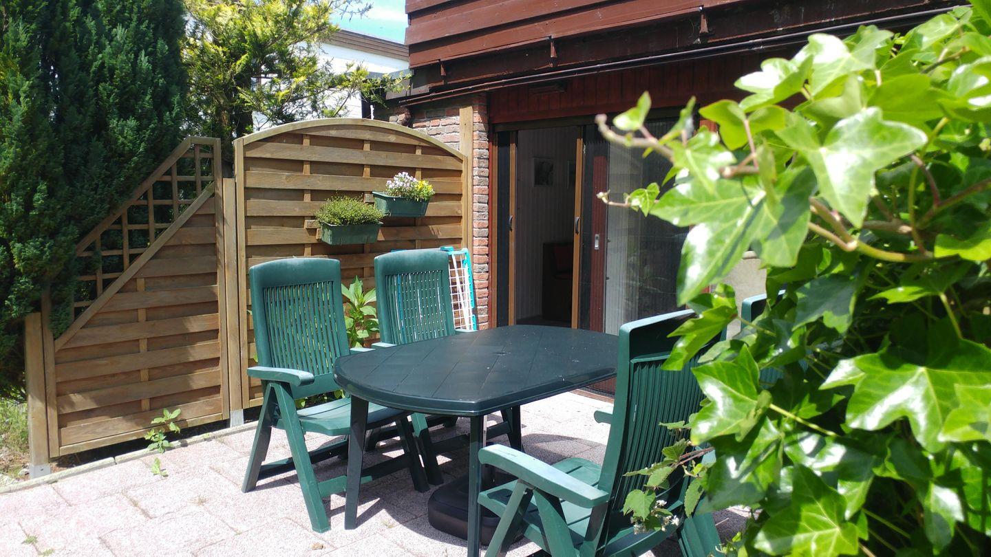 Mit einem Blick auf das angrenzende Wäldchen können Sie schon in der Morgensonne Ihr Frühstück auf der, an das Wohnzimmer angrenzenden Terrasse genießen und den Tag dort auch bei einem Grillabend und einem Glas Wein ausklingen lassen.