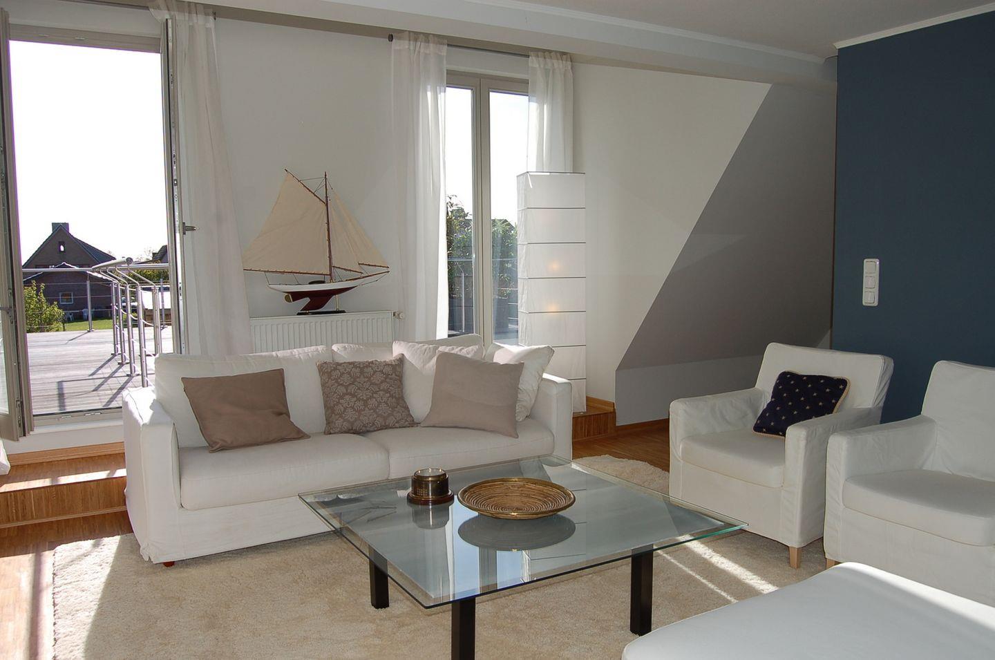 Die helle und sehr komfortabel eingerichtete Ferienwohnung eines Dreiparteien-Ferienhauses befindet sich im Obergeschoss des Hauses. Zur Ausstattung gehört eine kleine Küche, ein modernes Badezimmer mit Jacuzzi-Whirlpool, ein weiteres Duschbad und ein kombiniertes Wohn-Esszimmer mit Kaminofen sowie eine Schlafgalerie mit Blick zur einen Seite auf die Ostsee und zur anderen Seite auf die Schlei.