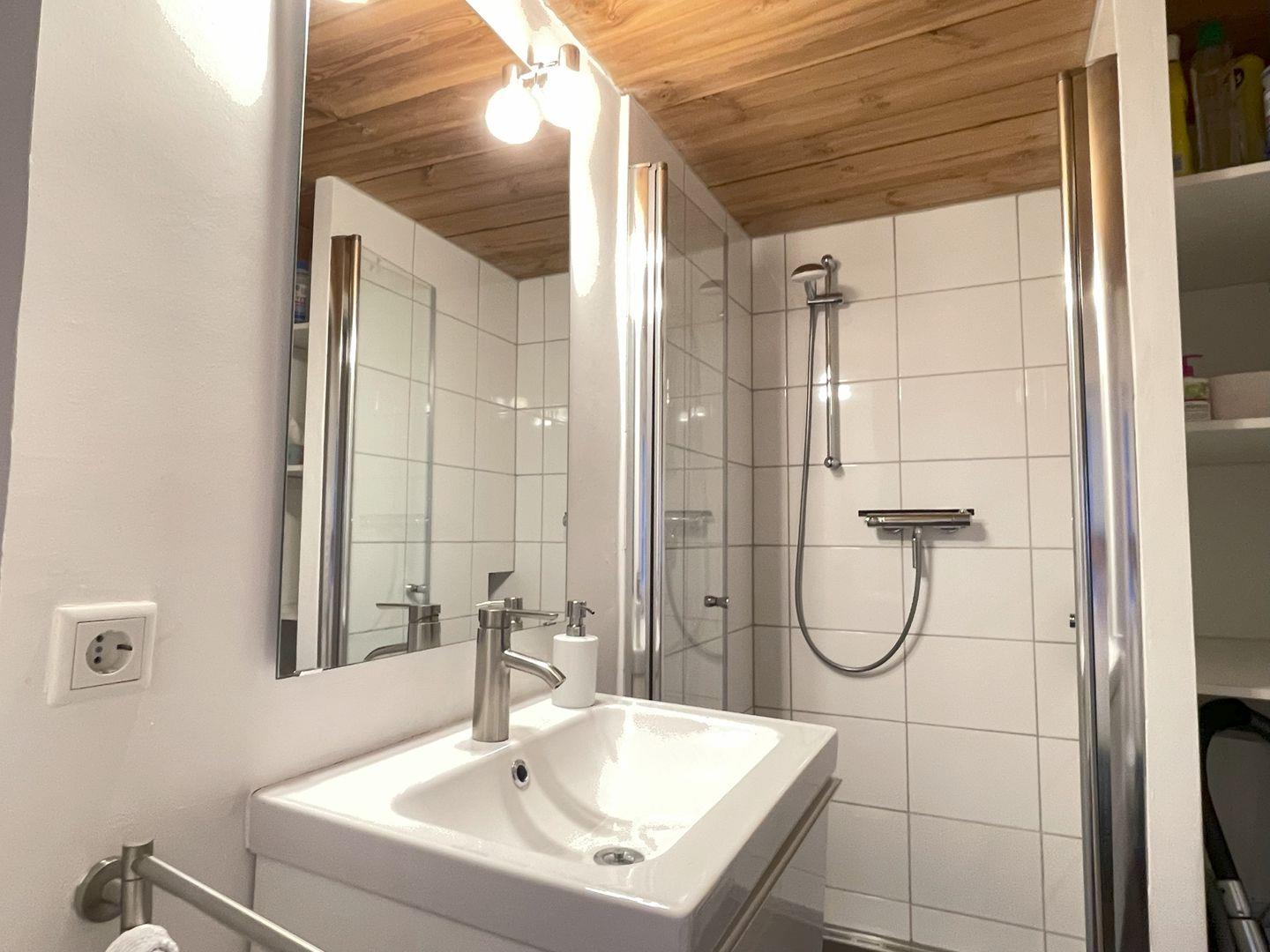 Das moderne Badezimmer mit ebenerdiger Dusche grenzt direkt an den Wohnbereich.