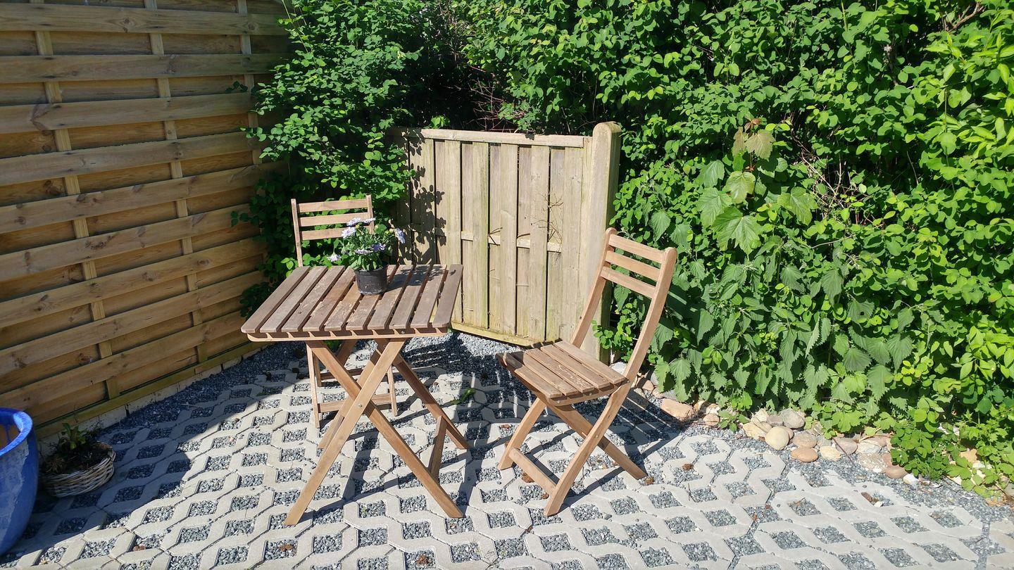 Das Wohn-und Esszimmer mit integrierter, voll ausgestatteter Küchenzeile ist funktional und doch gemütlich eingerichtet und verfügt über einen Ausgang zur wohnungseigenen großen Nordwest-Terrasse mit kleiner Pforte in den vollständig eingezäunten,mit der Nachbarwohnung gemeinschaftlich genutzten Garten, sodass unsere Gäste mit Hund sich entspannt zurücklehnen können und nicht befürchten müssen, dass sich Ihr Vierbeiner eigenständig in der Nachbarschaft umschaut.