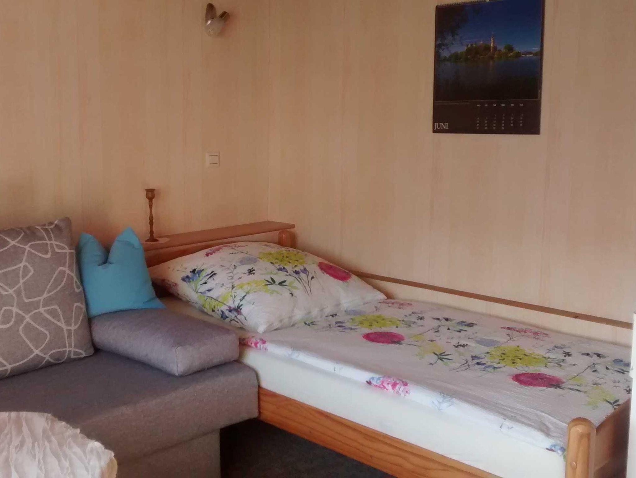 Das Zimmer Links ist gemütlich und praktisch eingerichtet mit Blick auf den Hof und einen Teil des Gartens. So gehören zur Ausstattung auch ein Radio, TV, Geschirr, Kaffeemaschine, Toaster und ein Kühlschrank. Auf Anfrage kann gegebenenfalls eine Aufbettung erfolgen. Das Zimmer ist mit Zimmer Rechts durch einen Flur verbunden und teilt sich das Bad mit Dusche und WC. Beide Zimmer sind separat voneinander buchbar, werden gern auch gemeinsam gebucht. 2024 wurden beide Zimmer frisch renoviert.