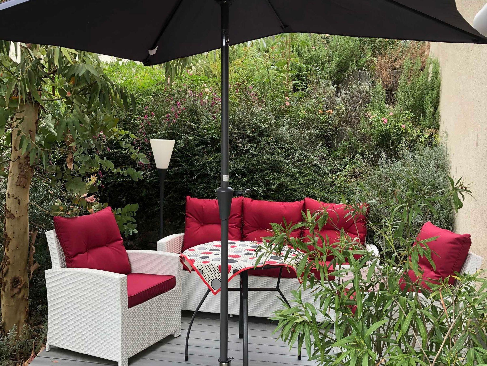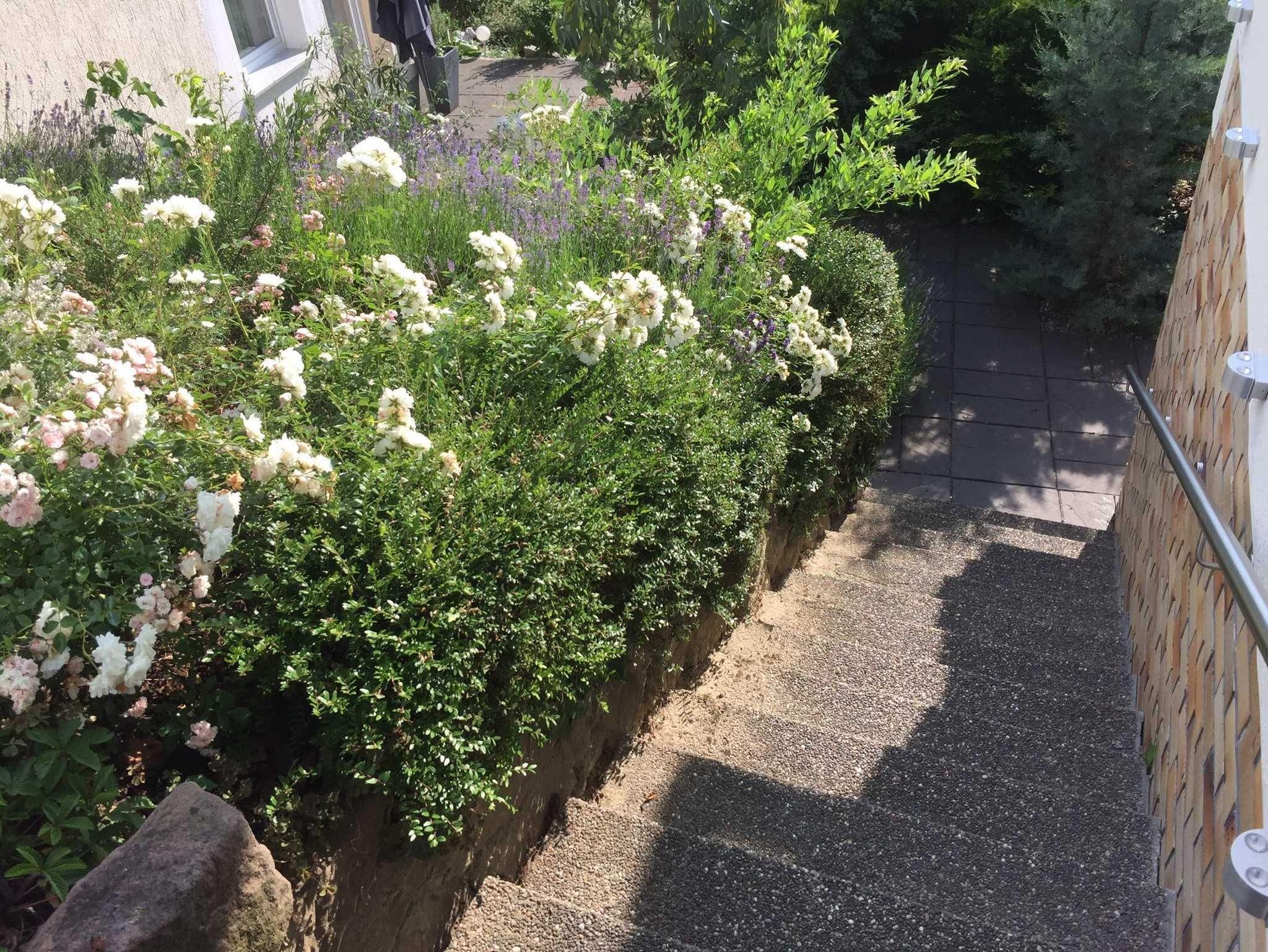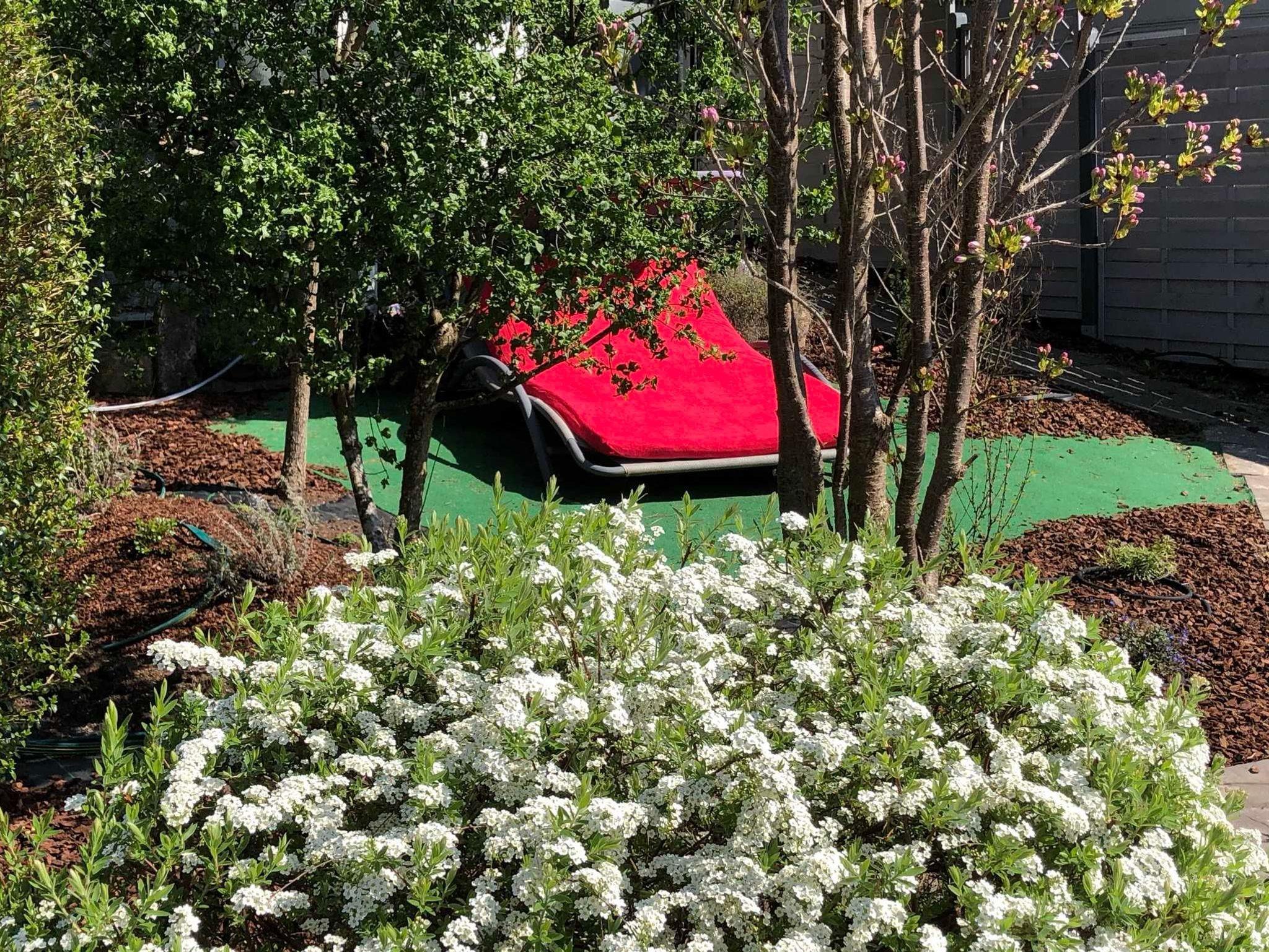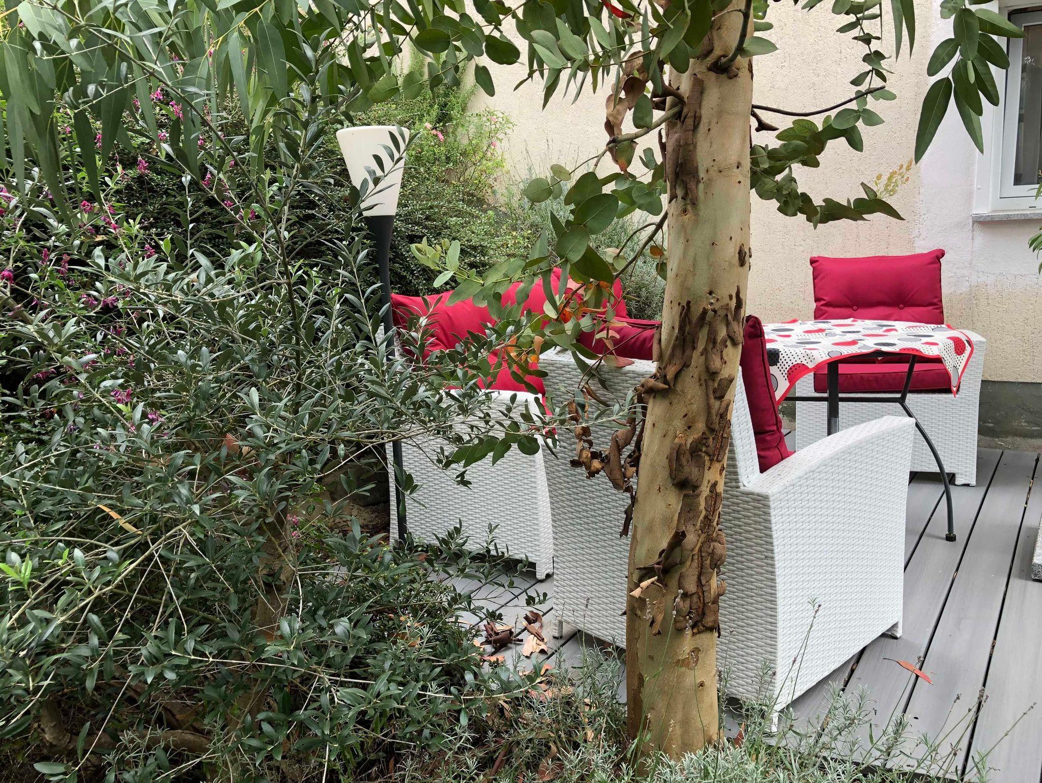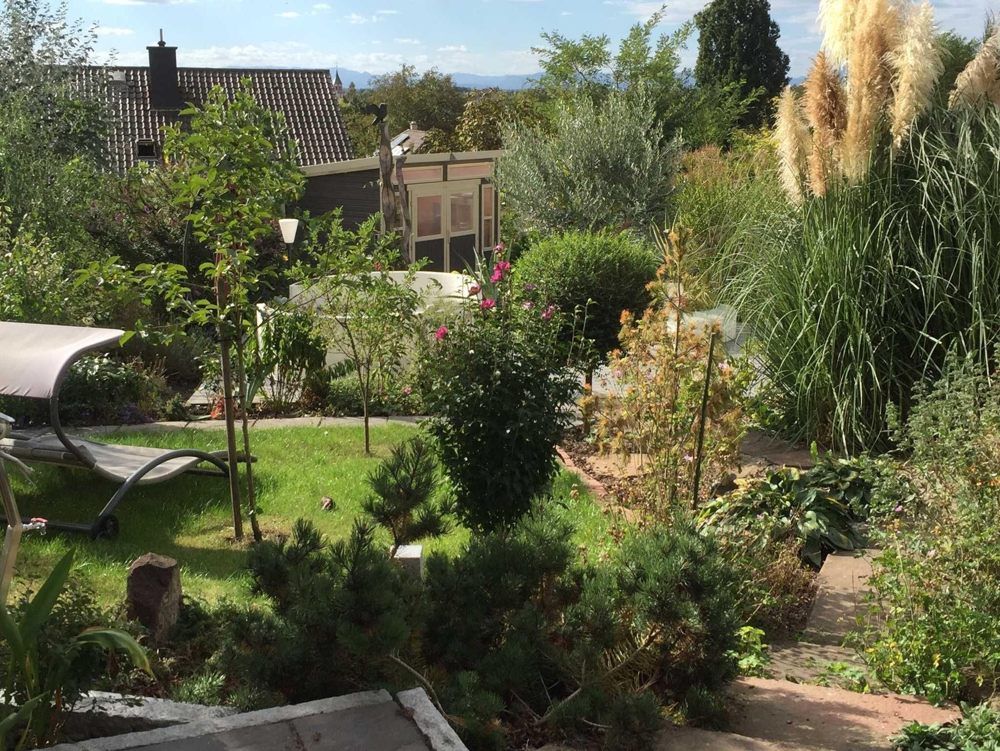Die Terrasse hat Gartenblick und ist mit einer schönen Sitzgruppe ausgestattet. Ein Gartenanteil mit einer Liege für zwei Personen steht auch zur Verfügung. Da kann man wunderbar entspannen und wenn das Wetter mitspielt einen wunderbaren Sonnenuntergang über den Vogesen genießen.