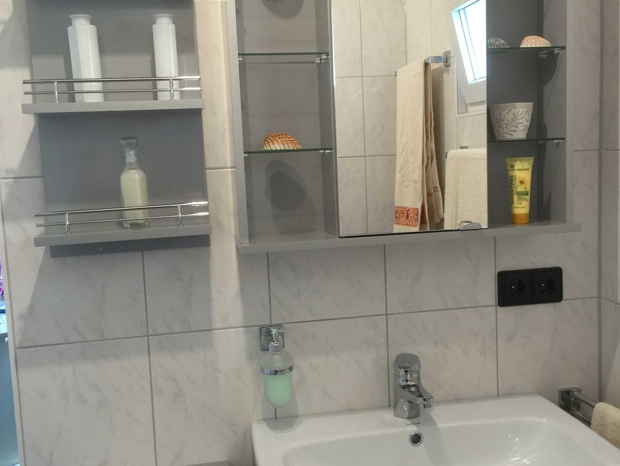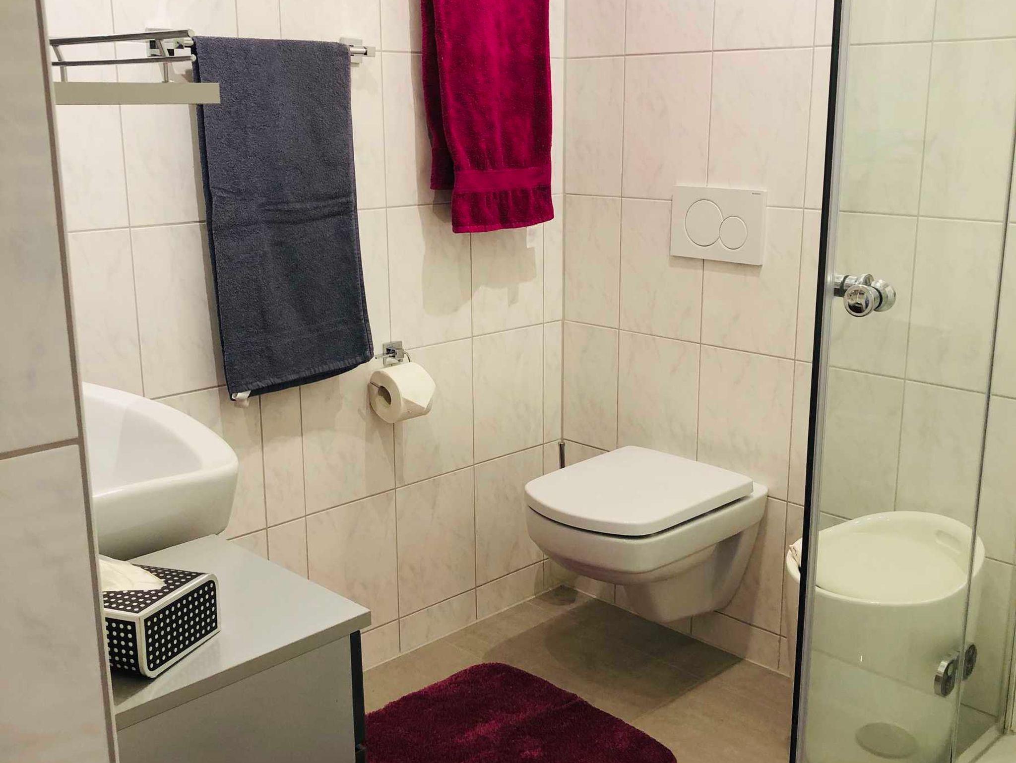 Das Badezimmer mit Fenster, komfortable Dusche, WC und Waschbecken ist durch eine Glastür abgetrennt. Genügend flauschige Handtücher sind auch vorhanden. Ebenso Shampoo, Pflegemittel ect.