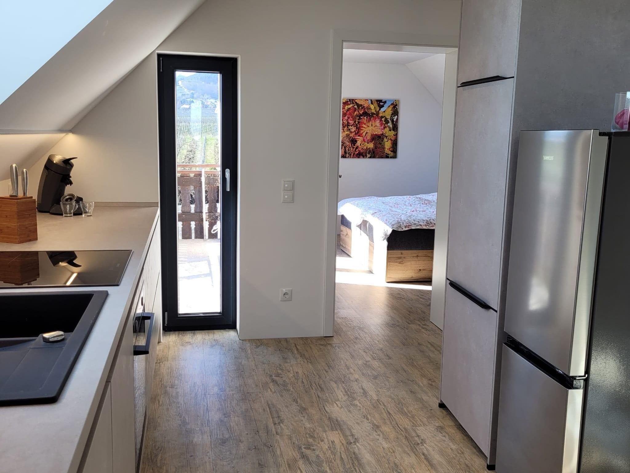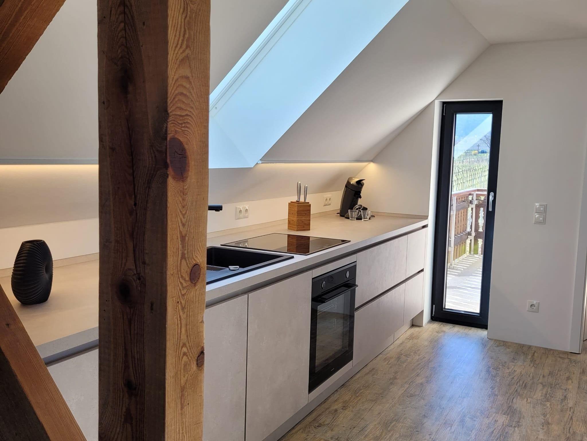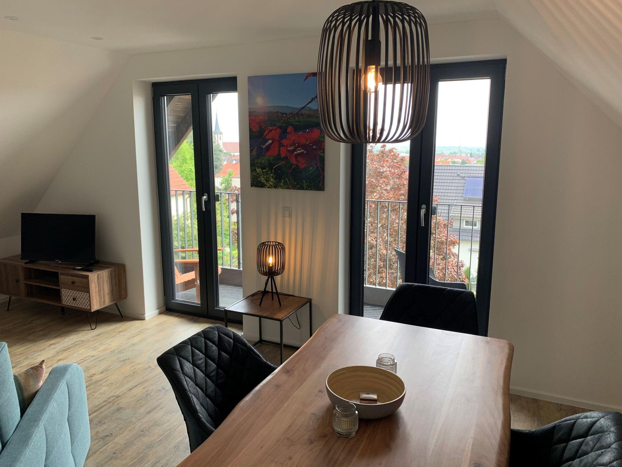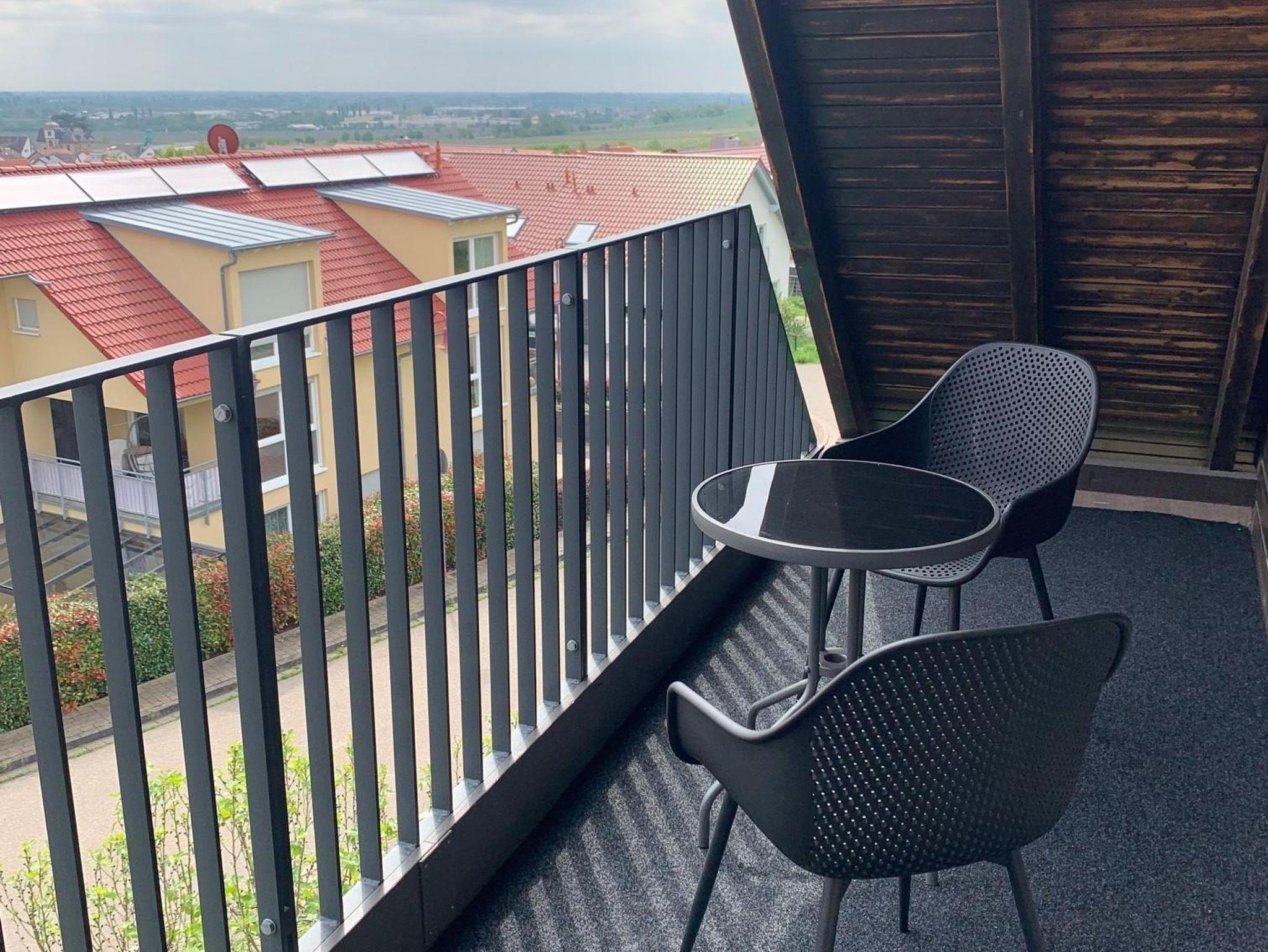 Modernes und gemütliches nach umfassender Kernsanierung mit Fussbodenheizung neu im März 2025 eingerichtes Studio-Appartement im DG. Das Appartement hat etwa 55 qm zzgl. überdachte Loggia mit Blick auf den südlichen Odenwald bzw. Nordschwarzwald und Balkon vor dem Schlafzimmer mit Blick über die Weinberge auf den Pfälzer Wald. 1 Wohnzimmer mit Smart-TV. 1 helle moderne Wohnküche mit Backofen, Induktionsceranfeld, Abzugshaube, Geschirrspüler, Wasserkocher, Toaster, Senseo-Kaffeemaschine, Mikrowelle, großer Kühlschrank mit Eisfach. 1 Schlafzimmer mit Boxspringbett (210x180). 1 Badezimmer mit Blick zum Hambacher Schloss.