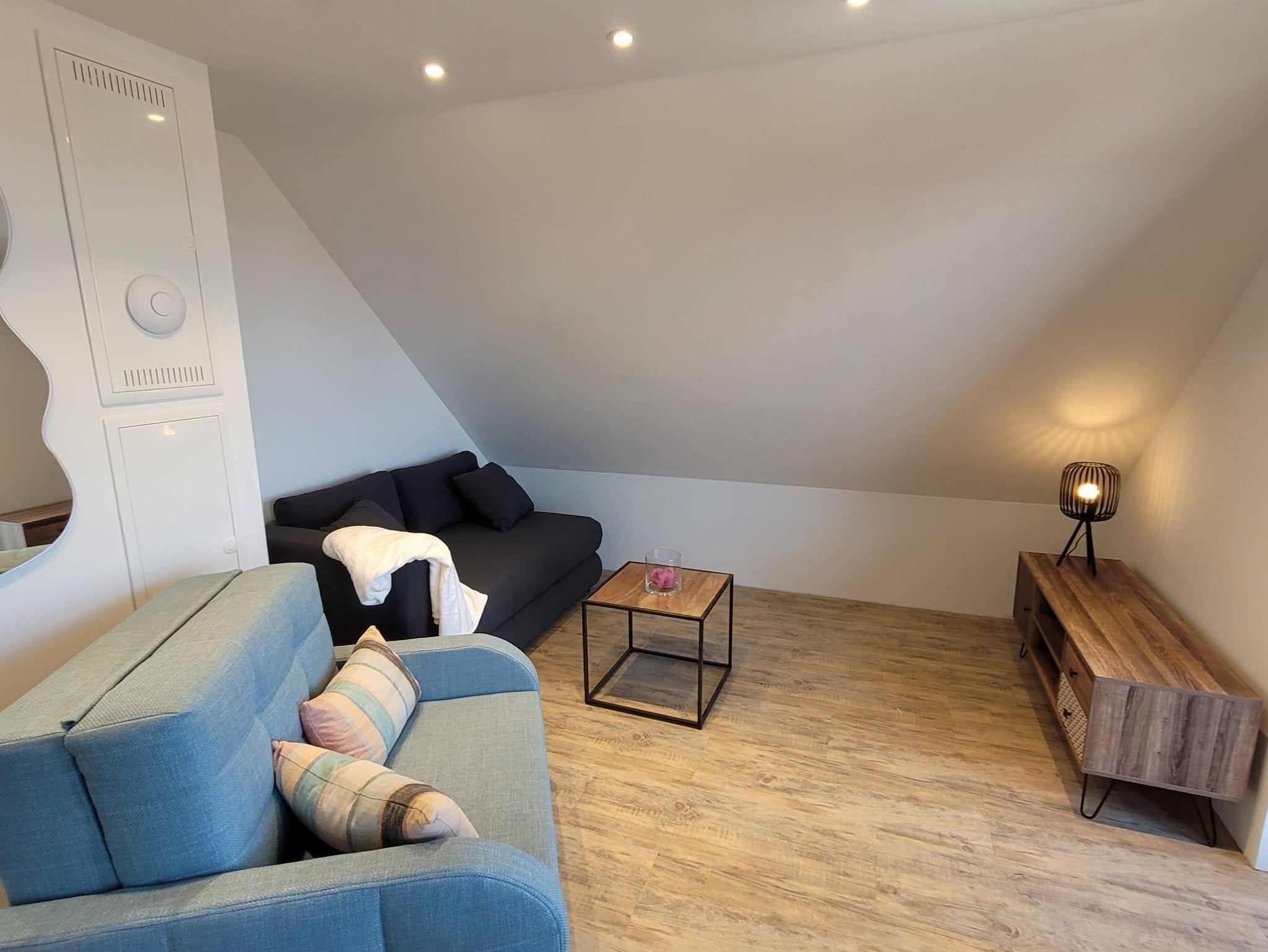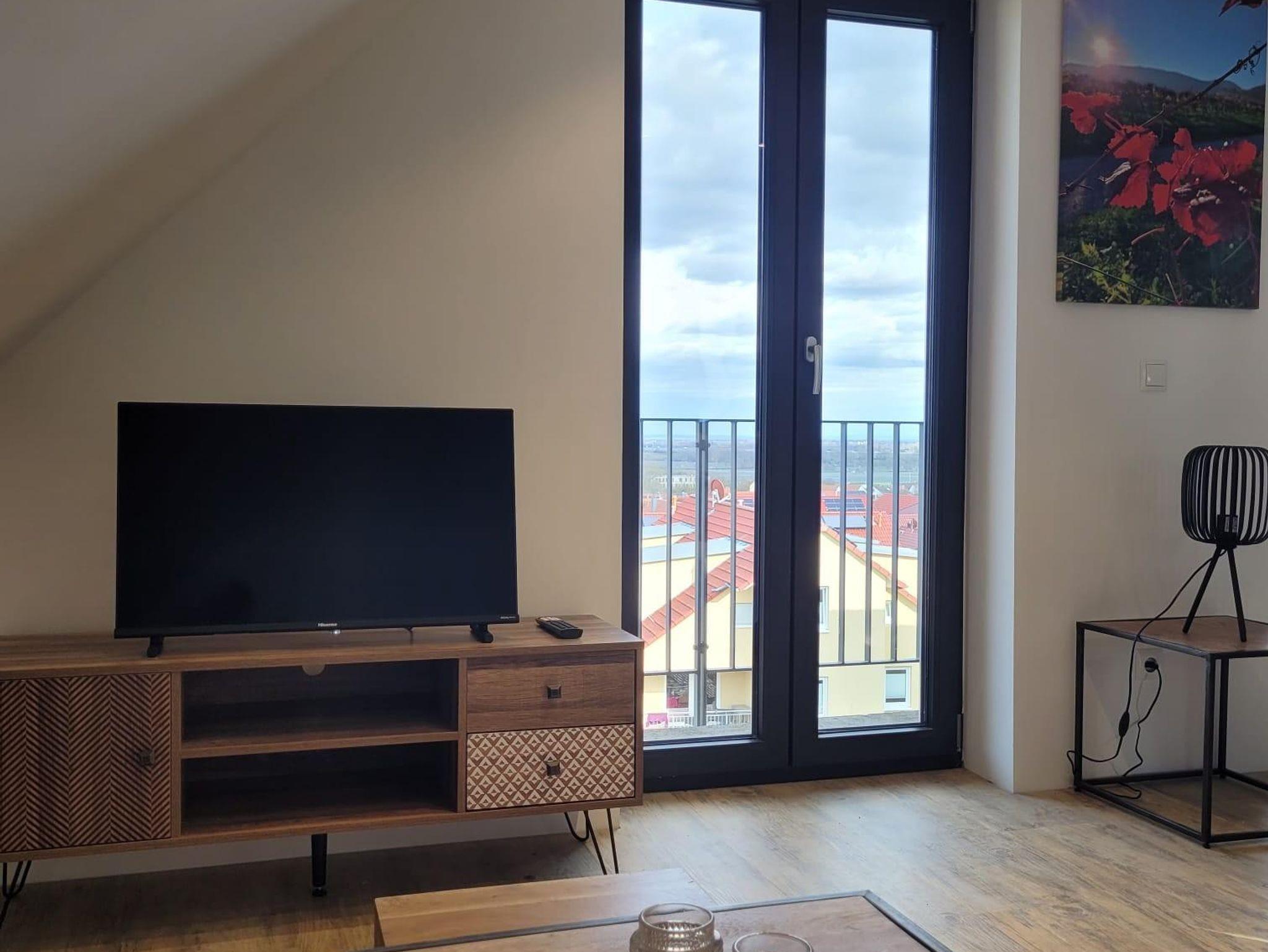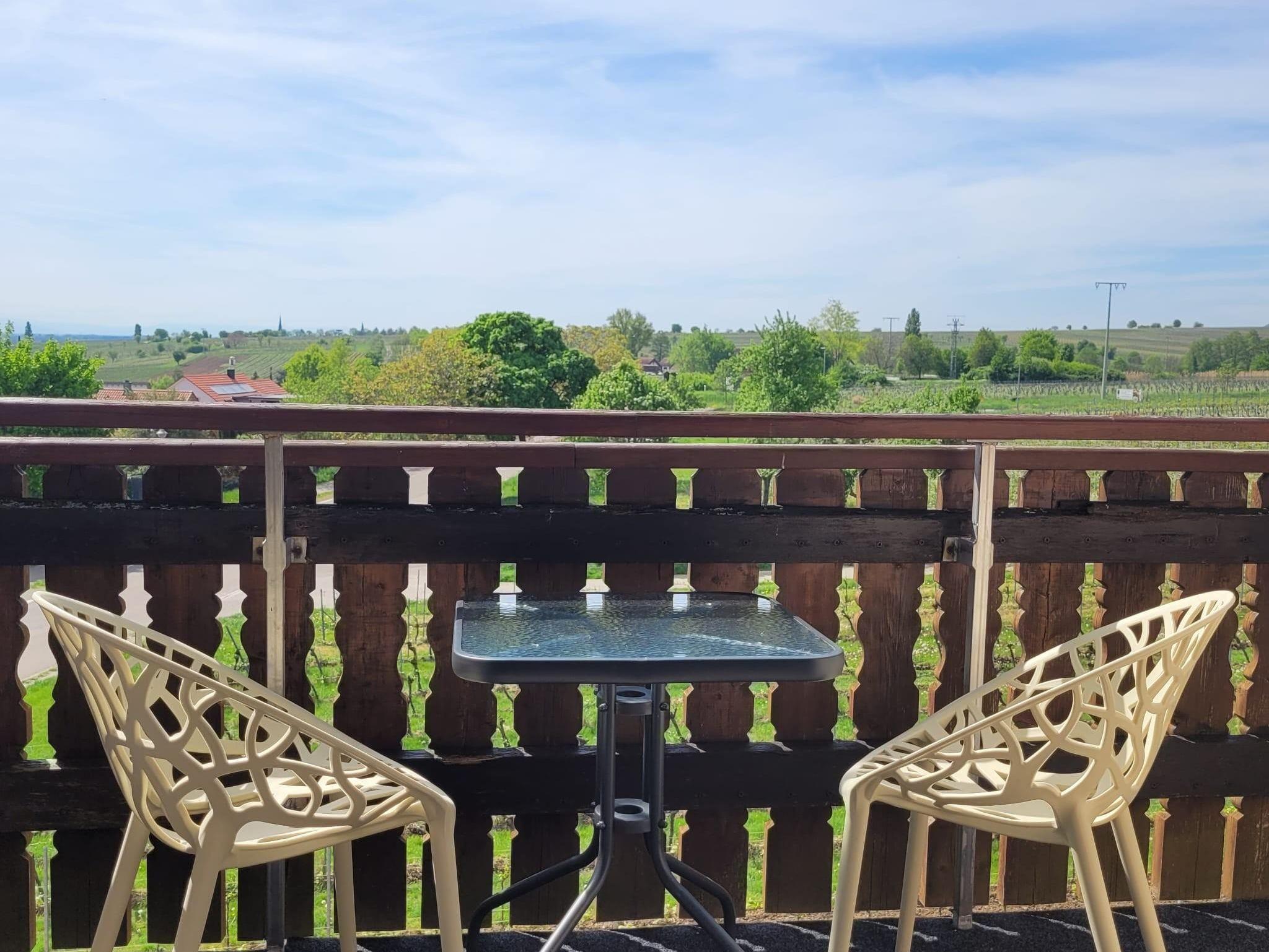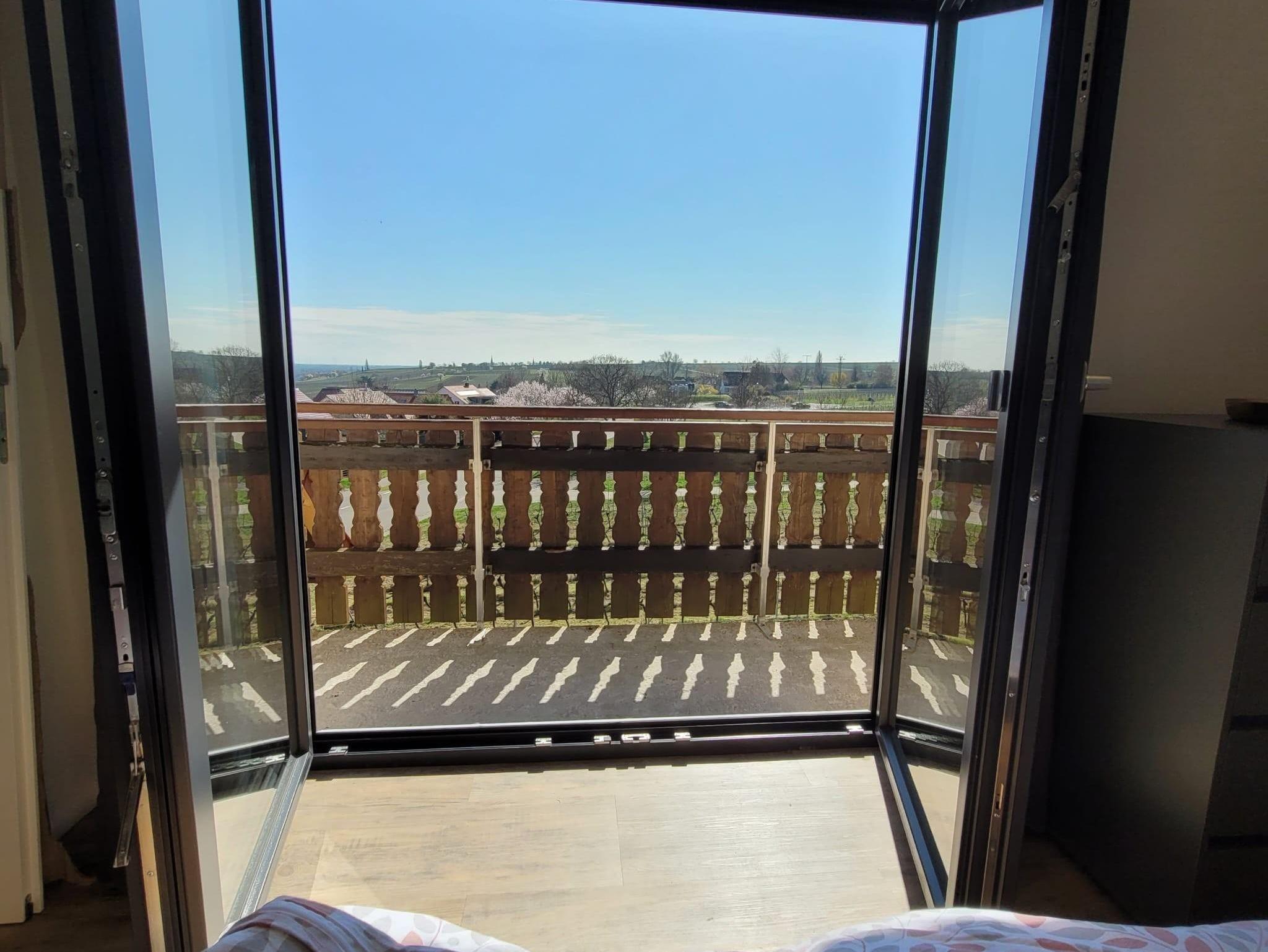 Modernes und gemütliches nach umfassender Kernsanierung mit Fussbodenheizung neu im März 2025 eingerichtes Studio-Appartement im DG. Das Appartement hat etwa 55 qm zzgl. überdachte Loggia mit Blick auf den südlichen Odenwald bzw. Nordschwarzwald und Balkon vor dem Schlafzimmer mit Blick über die Weinberge auf den Pfälzer Wald. 1 Wohnzimmer mit Smart-TV. 1 helle moderne Wohnküche mit Backofen, Induktionsceranfeld, Abzugshaube, Geschirrspüler, Wasserkocher, Toaster, Senseo-Kaffeemaschine, Mikrowelle, großer Kühlschrank mit Eisfach. 1 Schlafzimmer mit Boxspringbett (210x180). 1 Badezimmer mit Blick zum Hambacher Schloss.