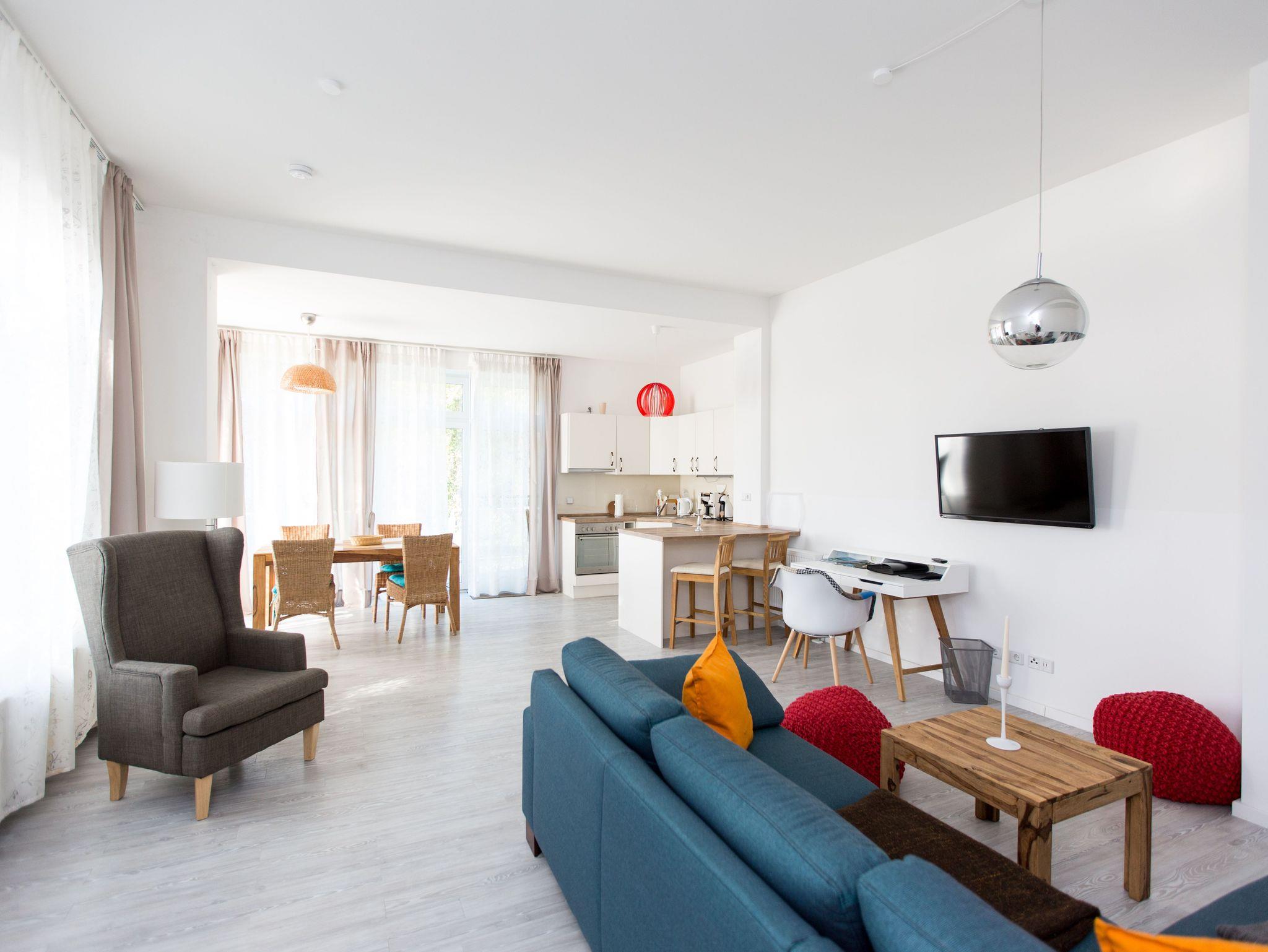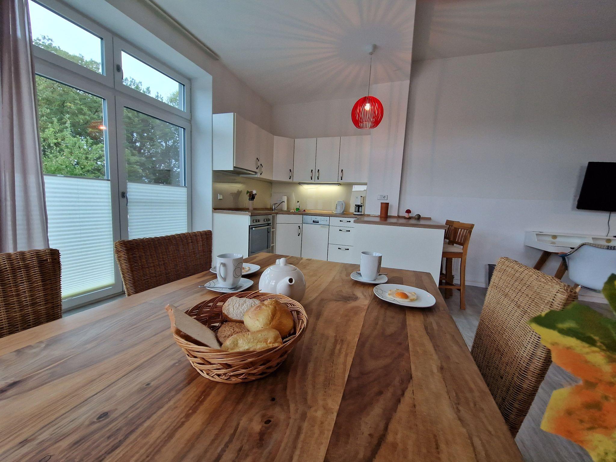 Insgesamt verfügt das Gutshaus über 5 sehr helle und großzügig geschnittene Wohnungen von 50qm bis zu 78qm. Die drei größeren Wohnungen 1-3 liegen im Erdgeschoss und haben alle eine eigene große Terrasse mit direktem Zugang zum 5000m² großen Park. Alle Wohnungen sind mit modernem hochwertigem Möbel und komplett ausgestatteten Einbauküchen inkl. Geschirrspüler eingerichtet. Erstklassige Boxspringbetten sorgen für einen erholsamen Schlaf. Jedes der großen Wannenbäder hat Fußbodenheizung und verfügt über eine separate Dusche und einen Föhn. Ferienwohnungen 1 - 3 haben zudem einen Kaminofen im Wohnzimmer.