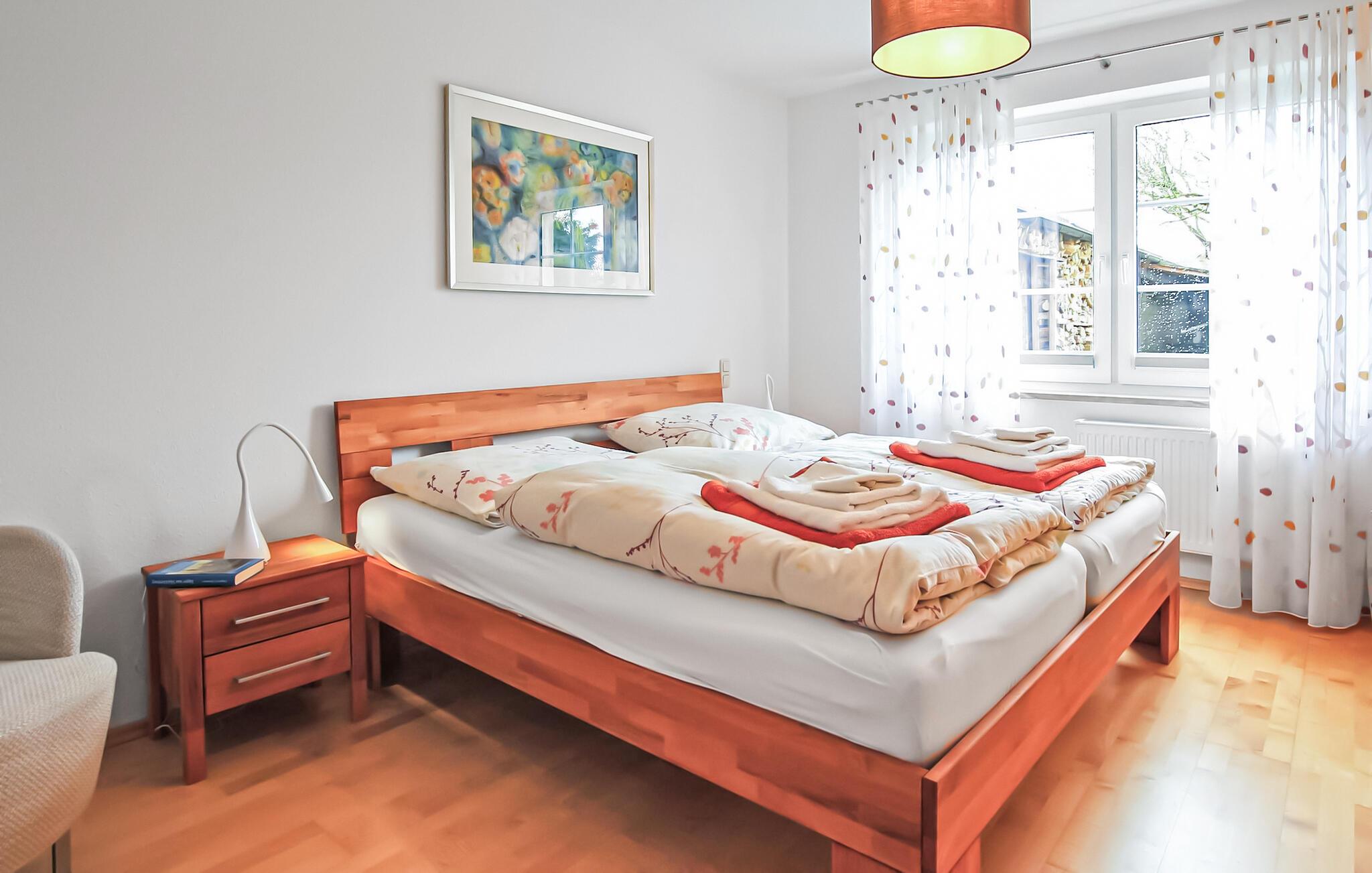 Den ca. 36 kvm store ikke-ryger lejlighed, som er totalrenoveret til høj standard i 2021 og er centralt opvarmet og har insektbeskyttelse på vinduerne, har køkken-alrum (sovesofa, opredning til 1 person, flad-. skærm-tv, spisebord) med et komplet tekøkken (elkomfur med ovn, køleskab med fryser, opvaskemaskine, mikroovn, brødrister, kedel), et soveværelse (dobbeltseng), et stort badeværelse (bruser i gulvniveau, toilet, hårtørrer), en gang og en gang i indgangspartiet Der er også flere siddemuligheder i haven - en af ??dem overdækket, liggestole, grill, parkeringsplads, cykelrum, højstol og gratis WiFi. Derudover kan to cykler og to stand-up paddle boards benyttes gratis og i samråd med ejerne kan deres sauna benyttes mod betaling. En kajak/kanokøje kan stilles til rådighed efter anmodning.