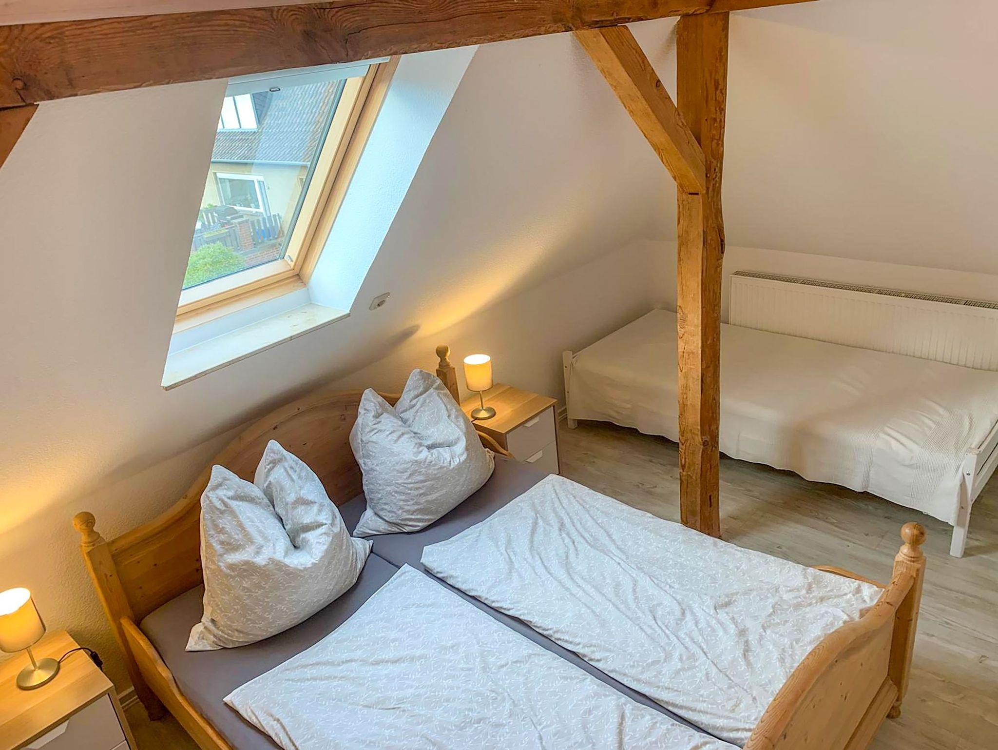 Die gemütliche Ferienwohnung Inge erwartet dich im Dachgeschoss eines Einfamilienhauses und bietet im idyllischen Inselstädtchen Malchow einen idealen Rückzugsort für bis zu 3 Personen. Der offene Wohn- und Essbereich ist mit einem bequemen Ecksofa, einem Sessel und einem TV für gemütliche Abende ausgestattet und lädt zum Entspannen ein. In der modernen und offen gestalteten Küche findest du alles, was du für einen gemeinsamen Kochabend brauchst. Das Schlafzimmer verfügt über ein großzügiges Doppelbett und ein Einzelbett, sodass du und deine Mitreisenden eine erholsame Nacht habt. Ein kleiner Nebenraum bietet zusätzlichen Stauraum für Koffer, Schuhe und Kleidung. Einen erfrischenden Start in den Tag bietet dir das Bad mit einer Dusche, WC und Waschbecken. Diese Ferienwohnung verbindet Gemütlichkeit mit praktischen Annehmlichkeiten und ist somit der perfekte Ort für einen erholsamen Urlaub. Runde deinen Tag im kleinen Garten ab, wo eine Sitzmöglichkeit mit Sonnenschirm auf dich wartet. Hier kannst du den Abend entspannt ausklingen lassen.