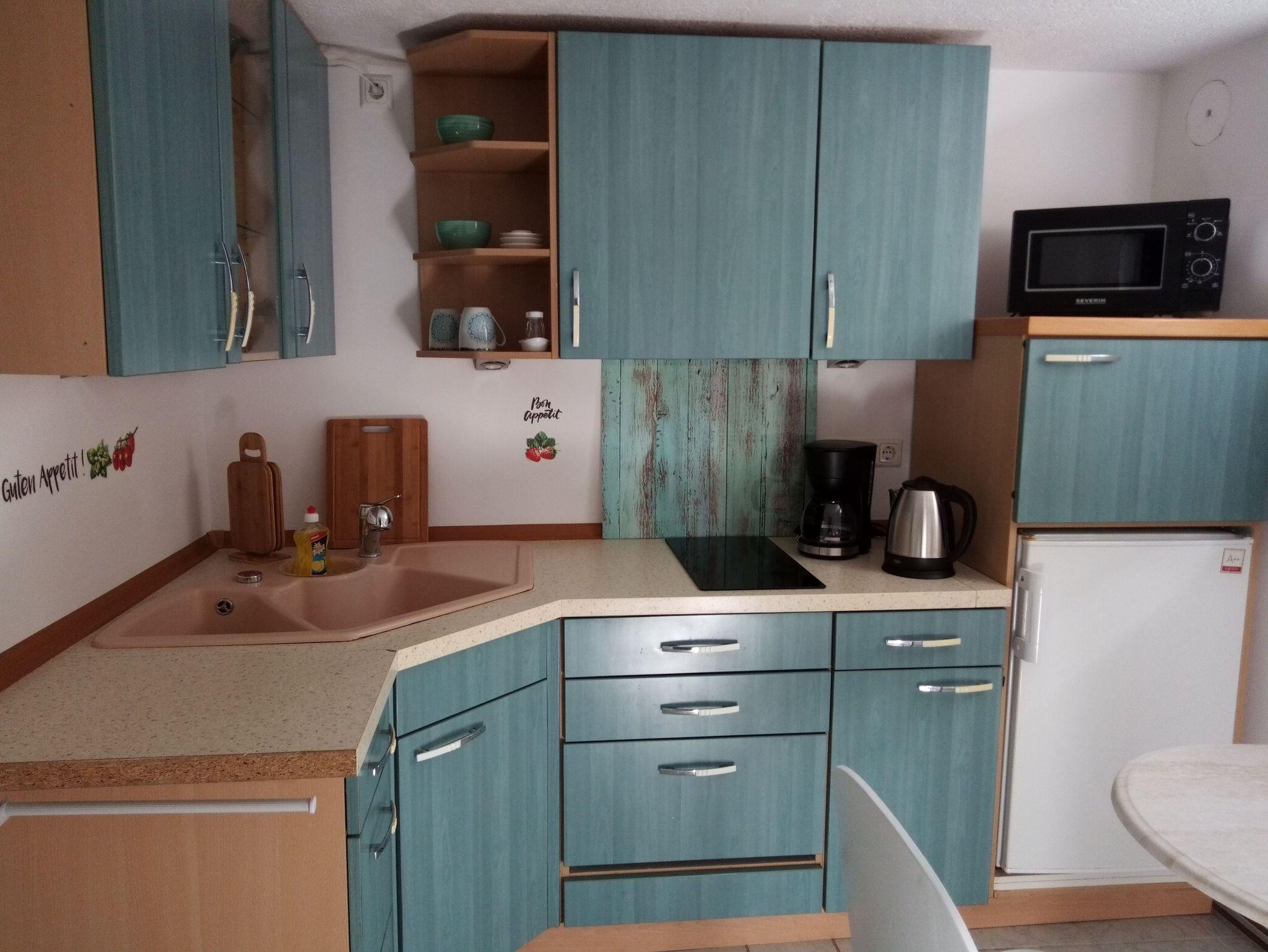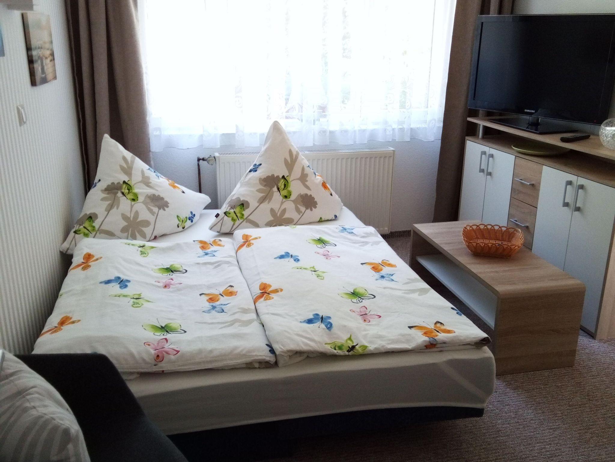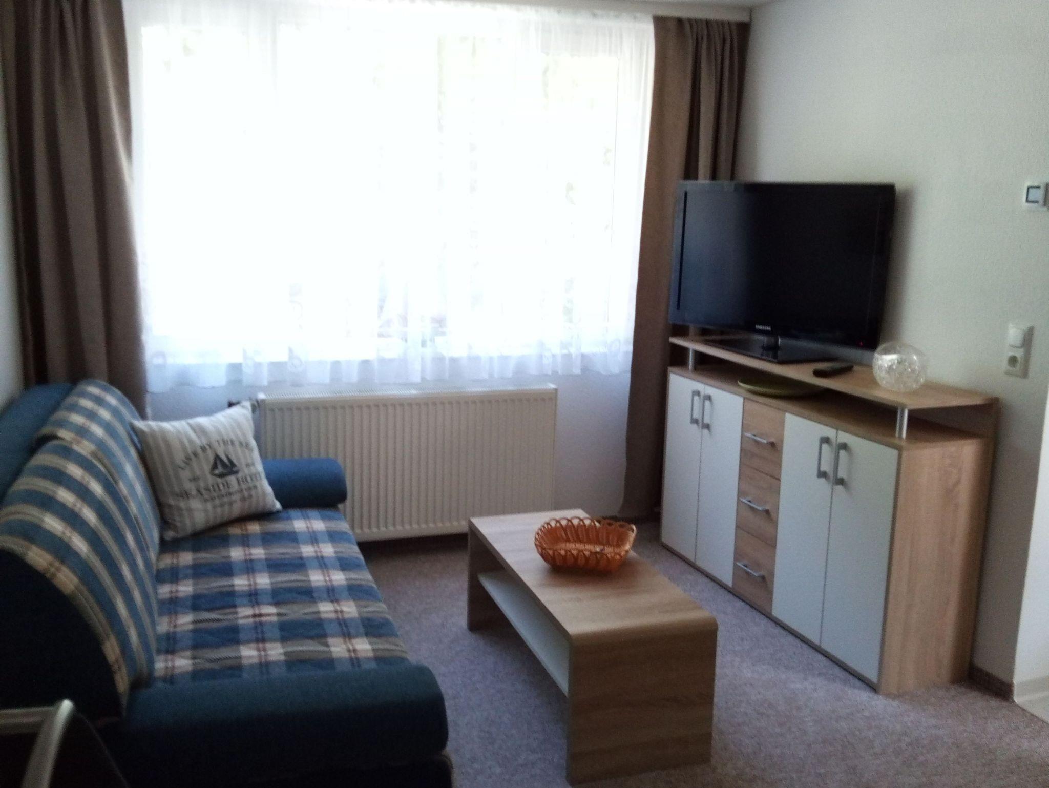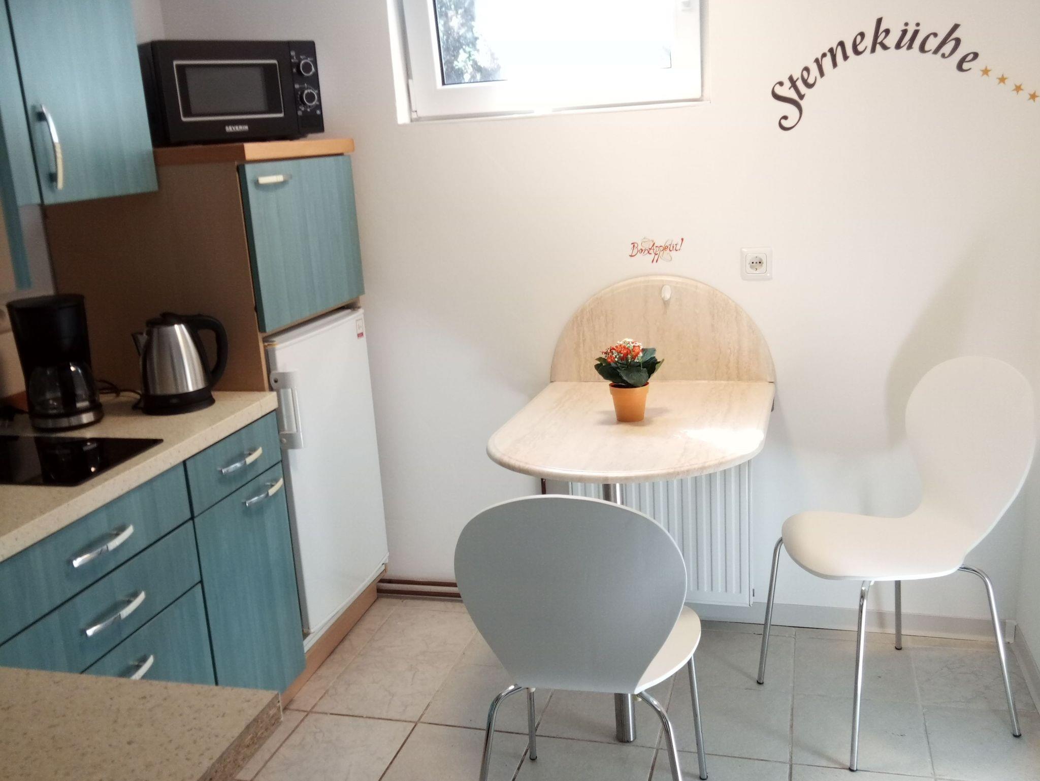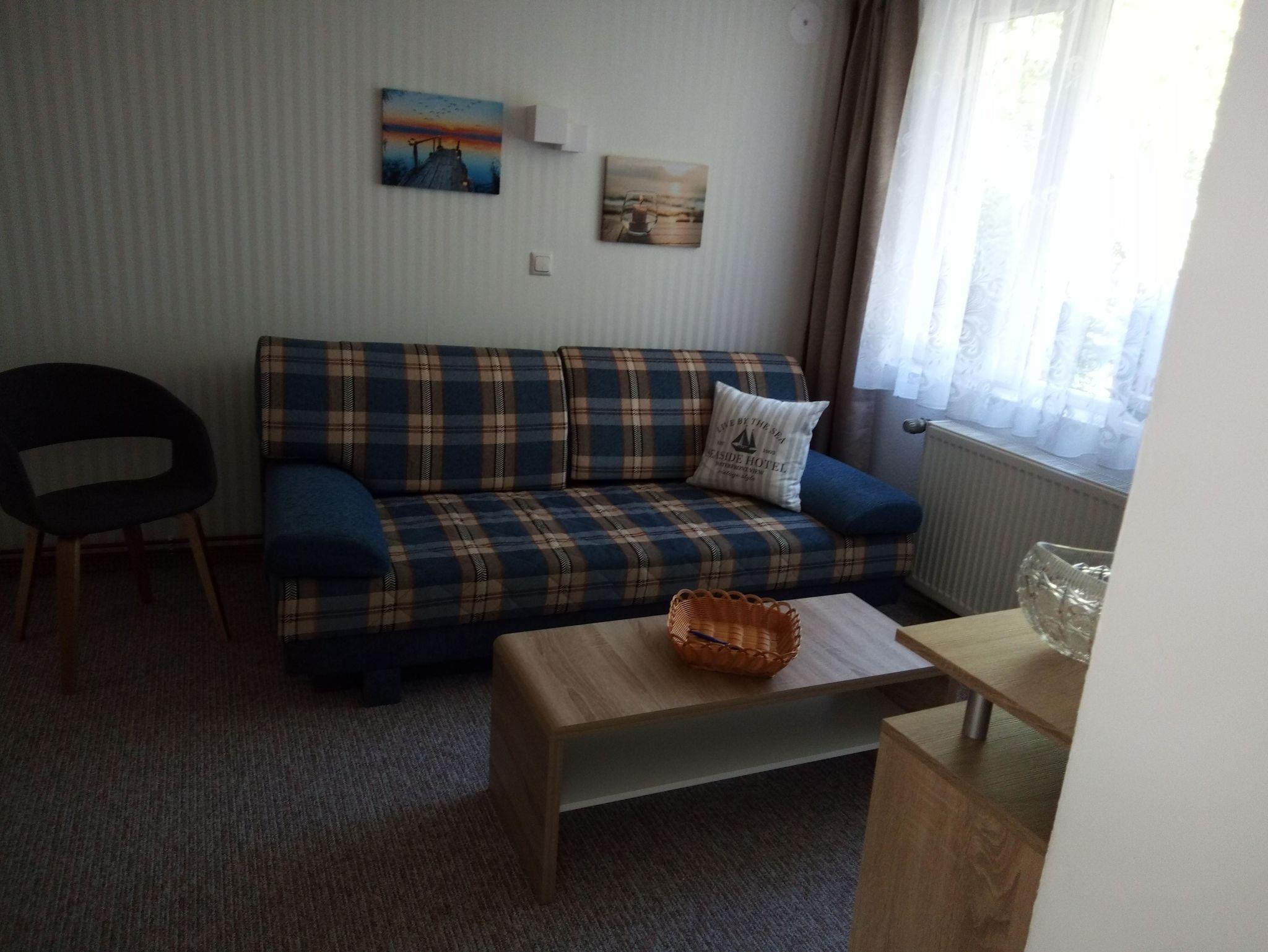 Die kleine Ferienwohnung (ca. 25 m² groß) mit einem kombiniertem Wohn-/Schlafraum bietet Platz für 2 Personen & ein Kleinkind bis zu 3 Jahren. Ein Schlafsofa dient als Schlafplatz und für das Kleinkind kann ein Reisebett aufgestellt werden. Die Küche ist zum Wohnzimmer offen und ist mit allen notwendigen Küchenutensilien ausgestattet. Im Bad befindet sich eine Dusche/Waschtisch und WC (ebenerdige Dusche). Eine gemütliche Sitzgelegenheit mit Bank und kleinem Tisch befindet sich vor dem Eingang der Ferienwohnung und so können Sie den Abend an der frischen Luft ausklingen lassen. Den Strand erreichen Sie in ca. 150 m.