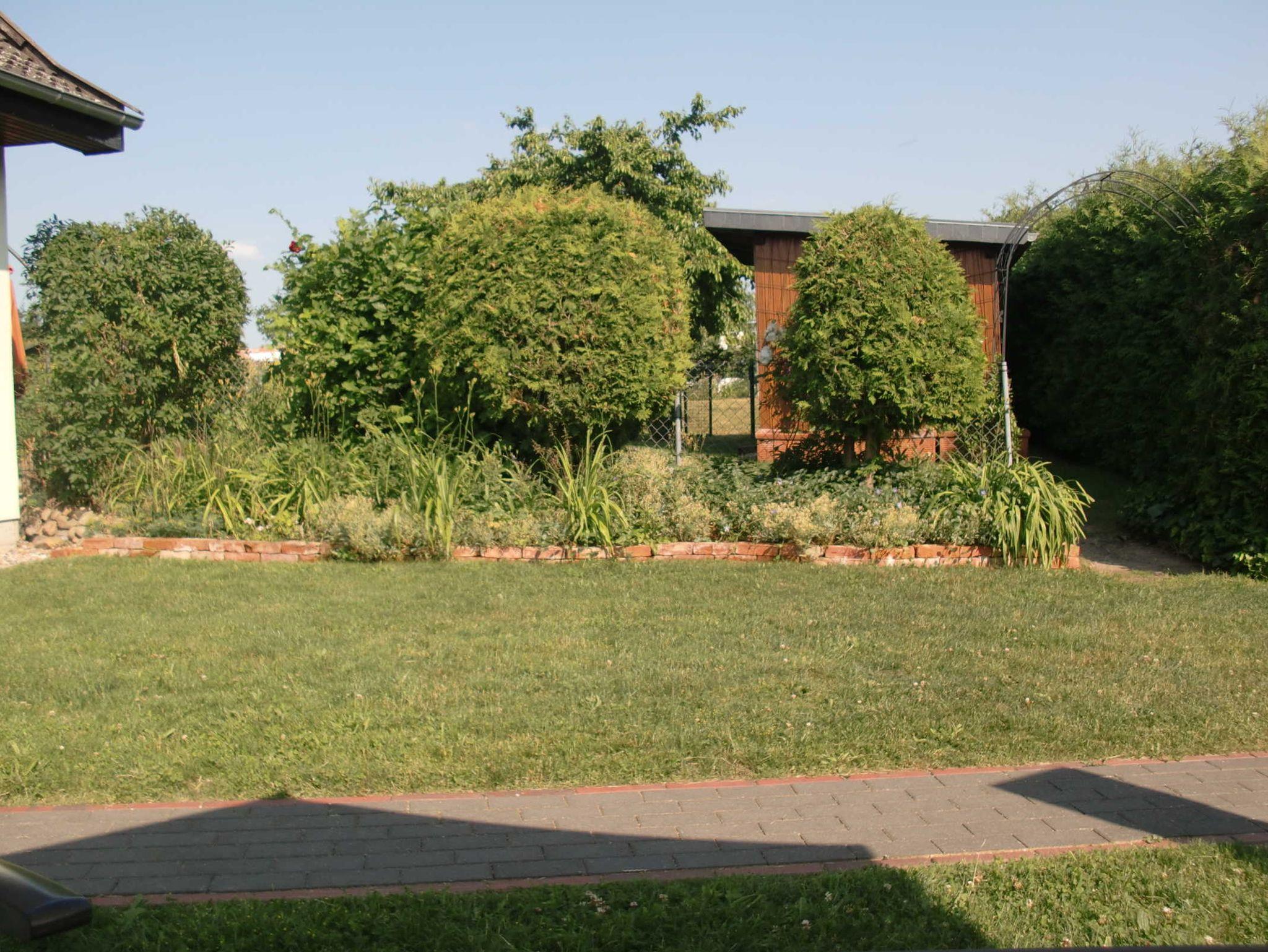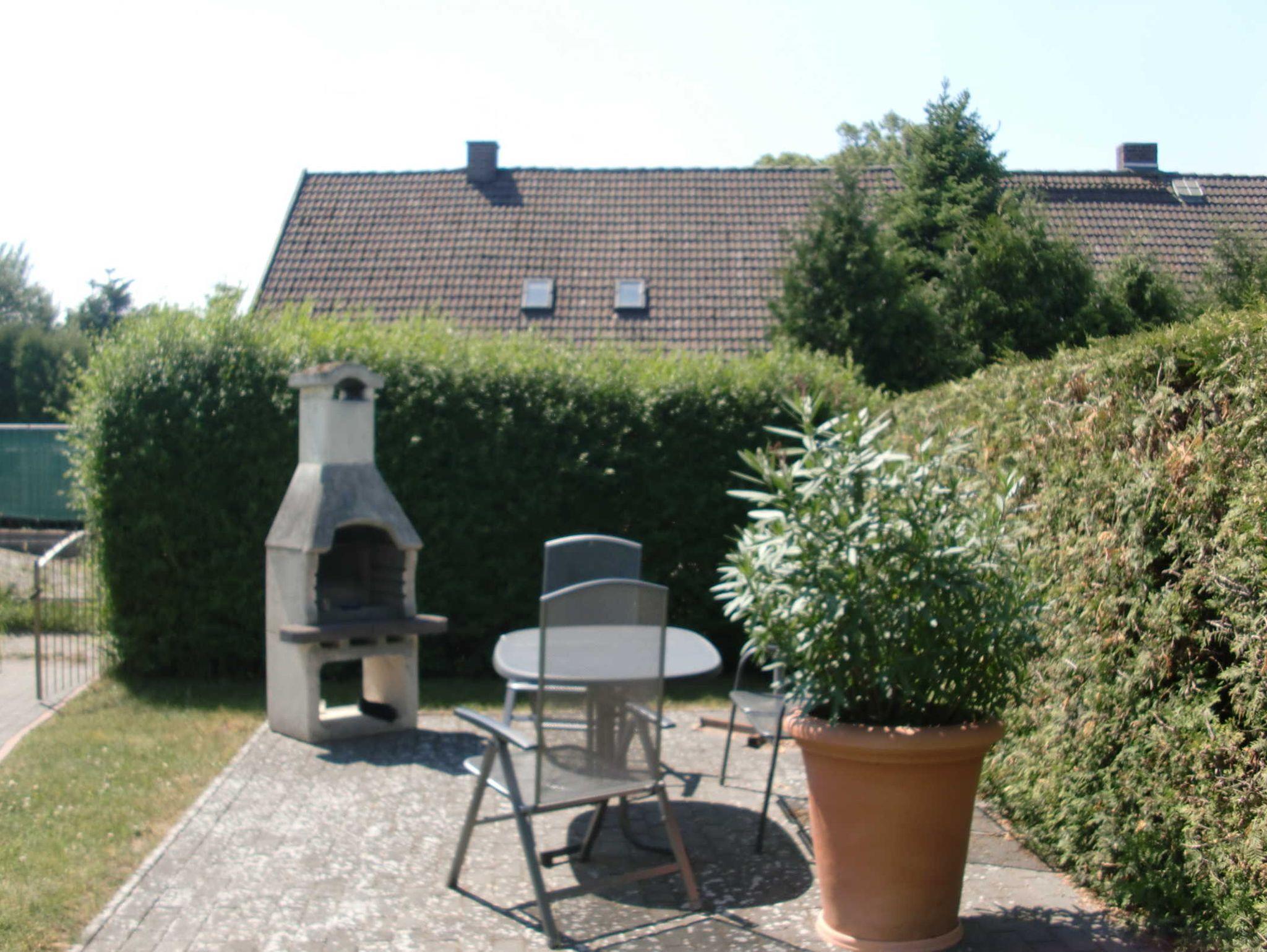 Im Erdgeschoß befindet sich die offene Küche mit Sitzgruppe, sowie das Duschbad. Die obere Etage besteht aus Wohnbereich und Schlafzimmer. Zur Wohnung gehört eine Terrasse mit Grillkamin und einer Liegewiese