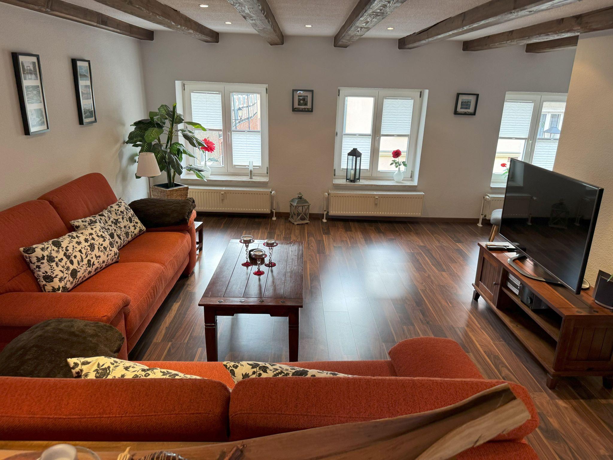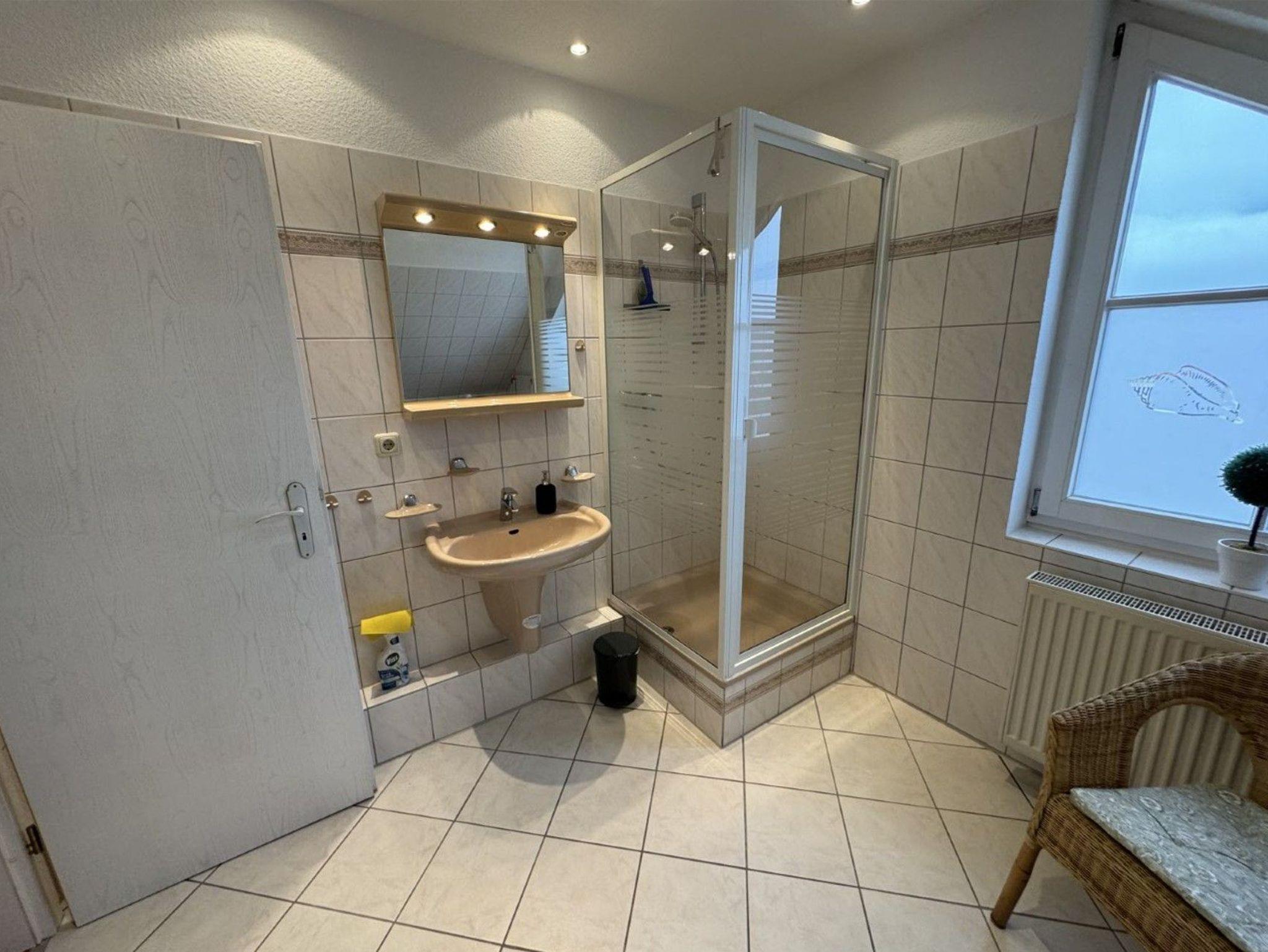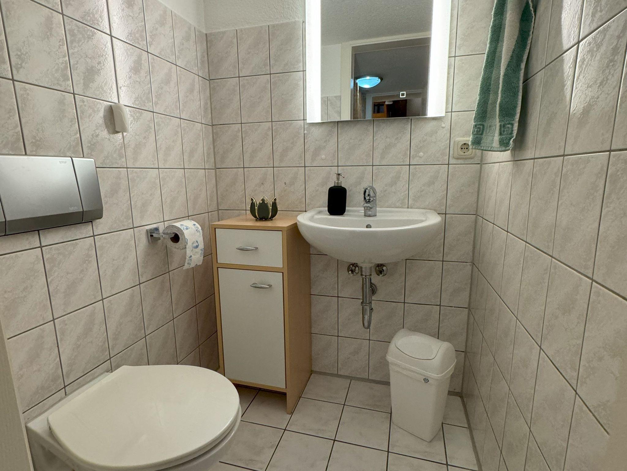 Die Ferienwohnung verfügt über zwei komfortable Schlafzimmer. Ein Schlafzimmer ist mit einem Doppelbett ausgestattet, das bei Bedarf auch getrennt werden kann, während das zweite Schlafzimmer zwei Einzelbetten bietet. Der offene Wohn- und Essbereich schafft eine helle und freundliche Atmosphäre und grenzt direkt an den Balkon an. Das Badezimmer ist mit einer Dusche und einem WC ausgestattet. Zusätzlich steht ein separates Gäste-WC zur Verfügung, was den Wohnkomfort abrundet.