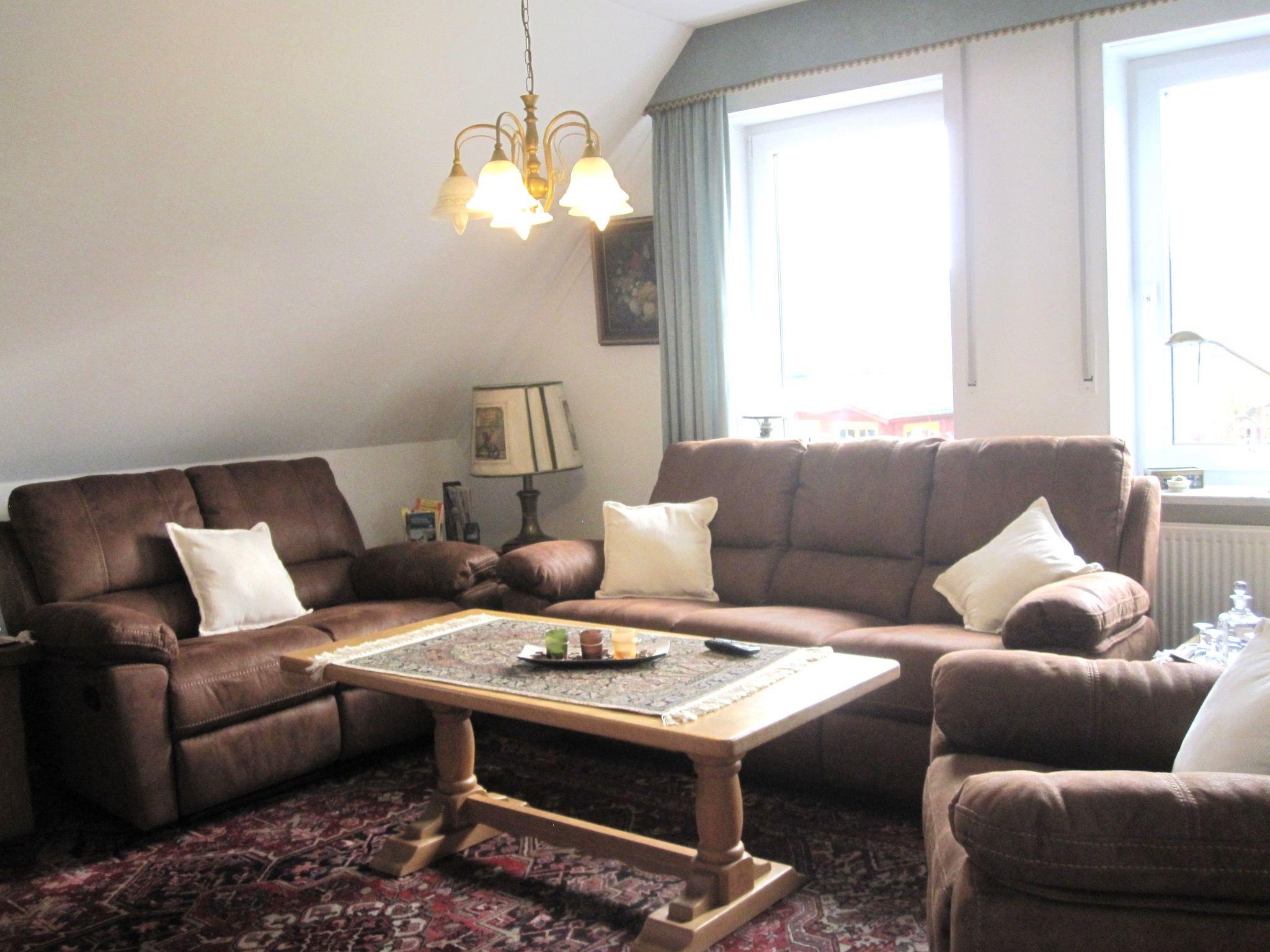 The interior of our holiday flats leaves nothing to be desired. The spacious living/dining area is furnished with fine furniture, including a high-quality upholstered suite, an antique oak table and a hand-crafted oak wardrobe. A luxurious box-spring bed and ample storage space await you in the bedroom. The kitchen is fully equipped and the elegantly tiled bathroom offers modern amenities. In addition, satellite TV, free Wi-Fi and a carefully selected selection of books are available to round off your high-quality living experience.