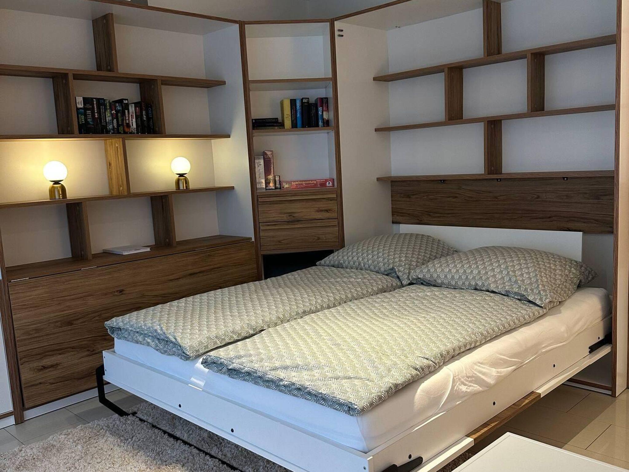 Die gemütliche 1-Zimmer-Ferienwohnung mit separater Küche befindet sich im Erdgeschoss eines Mehrparteienhauses. Sie verfügt über einen Wohnraum mit Sofaecke, TV, Schreibtisch und Schrankbett, ein Badezimmer mit Dusche und WC, eine Küche mit Kaffeevollautomat und Essplatz und eine Terrasse. Auf der Terrasse stehen Sitzmöbel und eine Hängematte zur Verfügung. Waschmaschine und Trockner stehen gegen Gebühr im Gemeinschaftstrockenkeller zur Verfügung.