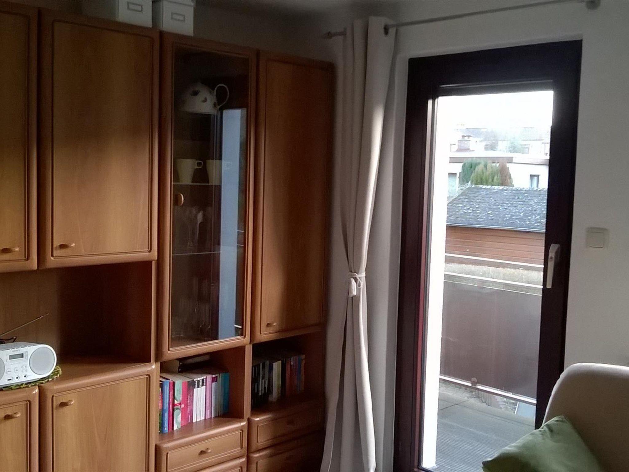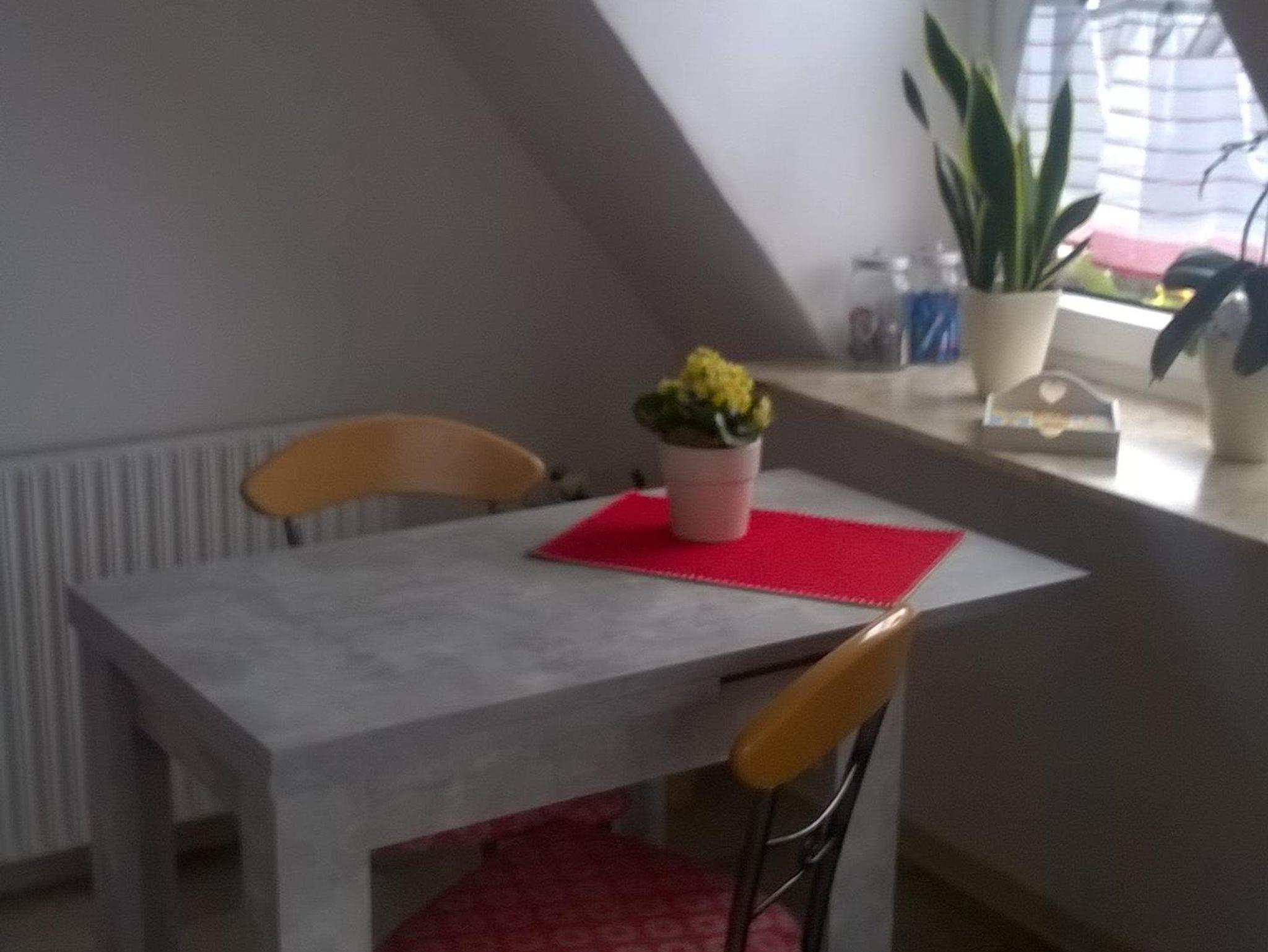 Die 50 m² große Ferienwohnung besteht aus einem Wohnzimmer, einem Schlafzimmer, einer Küche mit Essplatz und einem Duschbad. Der Balkon geht zum Garten raus (Südseite) und ist sowohl vom Wohnzimmer als auch vom Schlafzimmer aus zugänglich. Die Küche hat eine Küchenzeile mit Backofen und Mikrowelle.