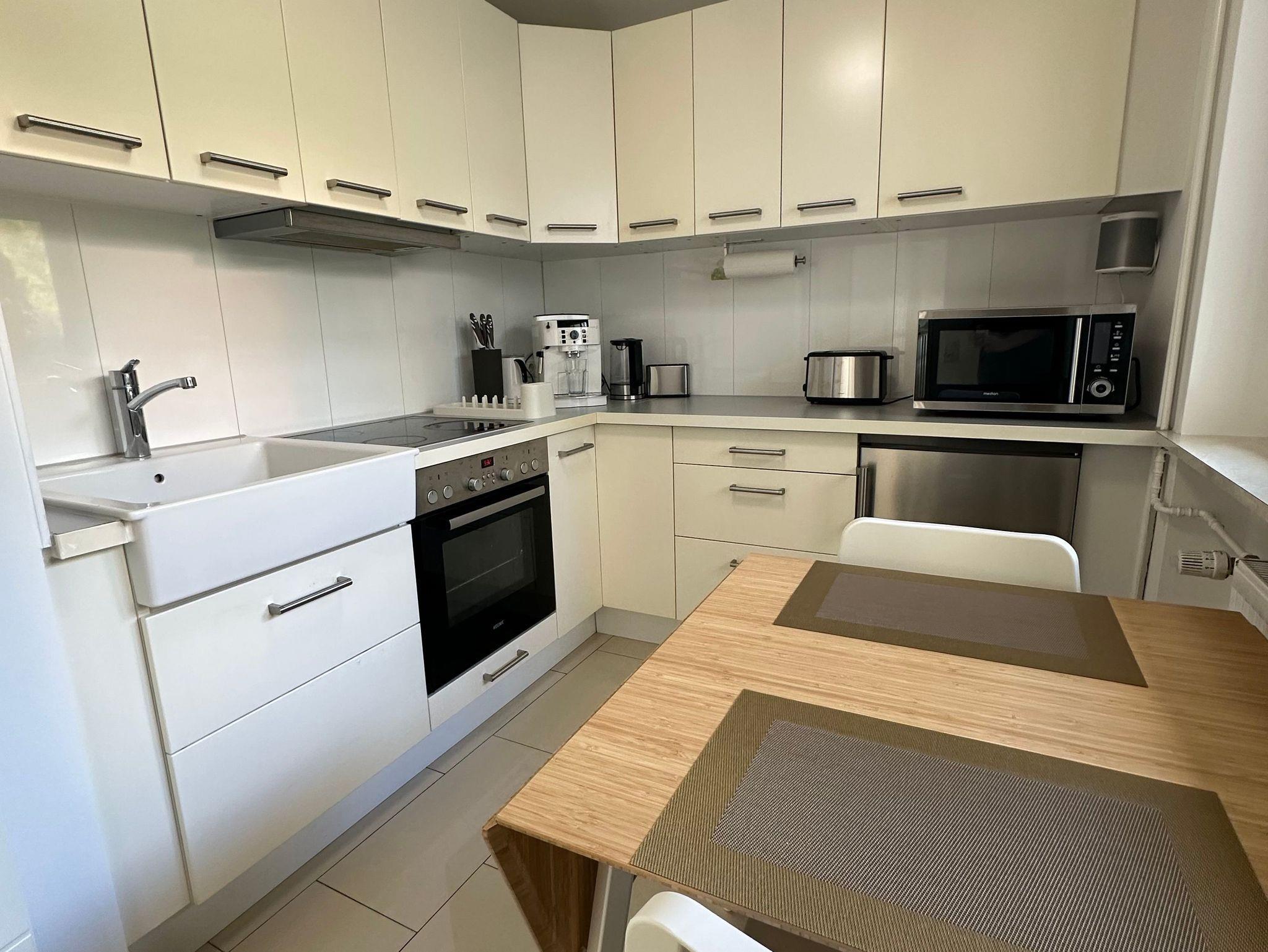 Die voll ausgestattete Küche mit Essbereich ist inkl. Kaffeevollautomaten, Kaffeemaschine, Wasserkocher, Kindergeschirr und Mixer. Zusätzlich sind ein Babyreisebett, ein Hochstuhl, eine Babywanne und ein Babyphone vorhanden.