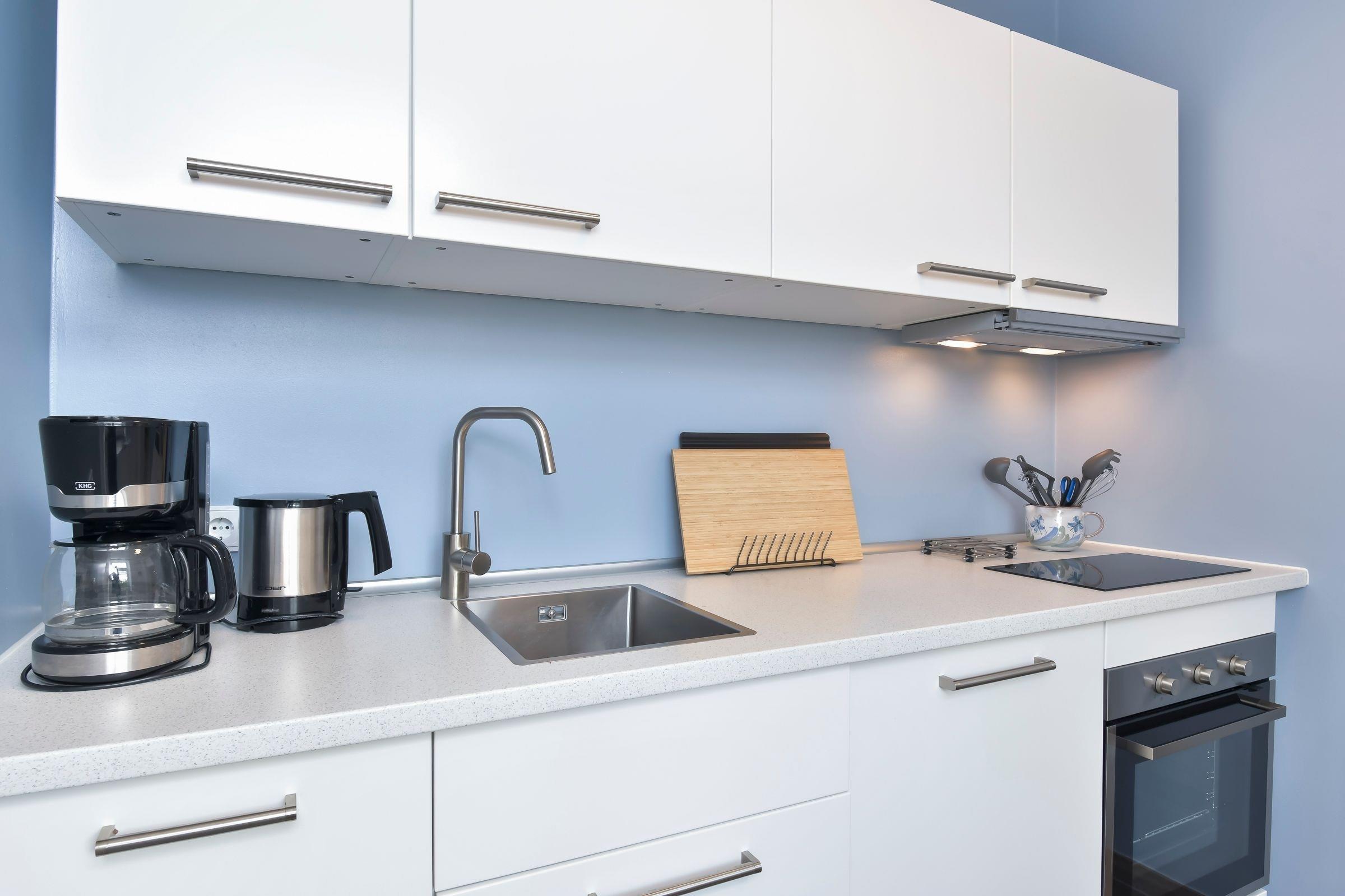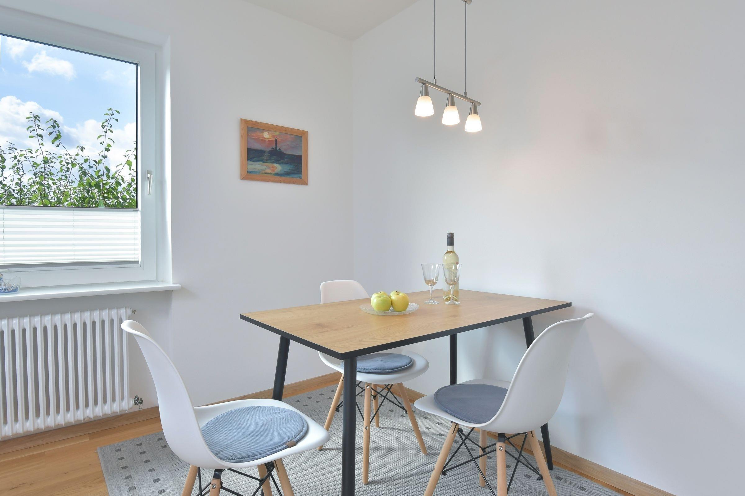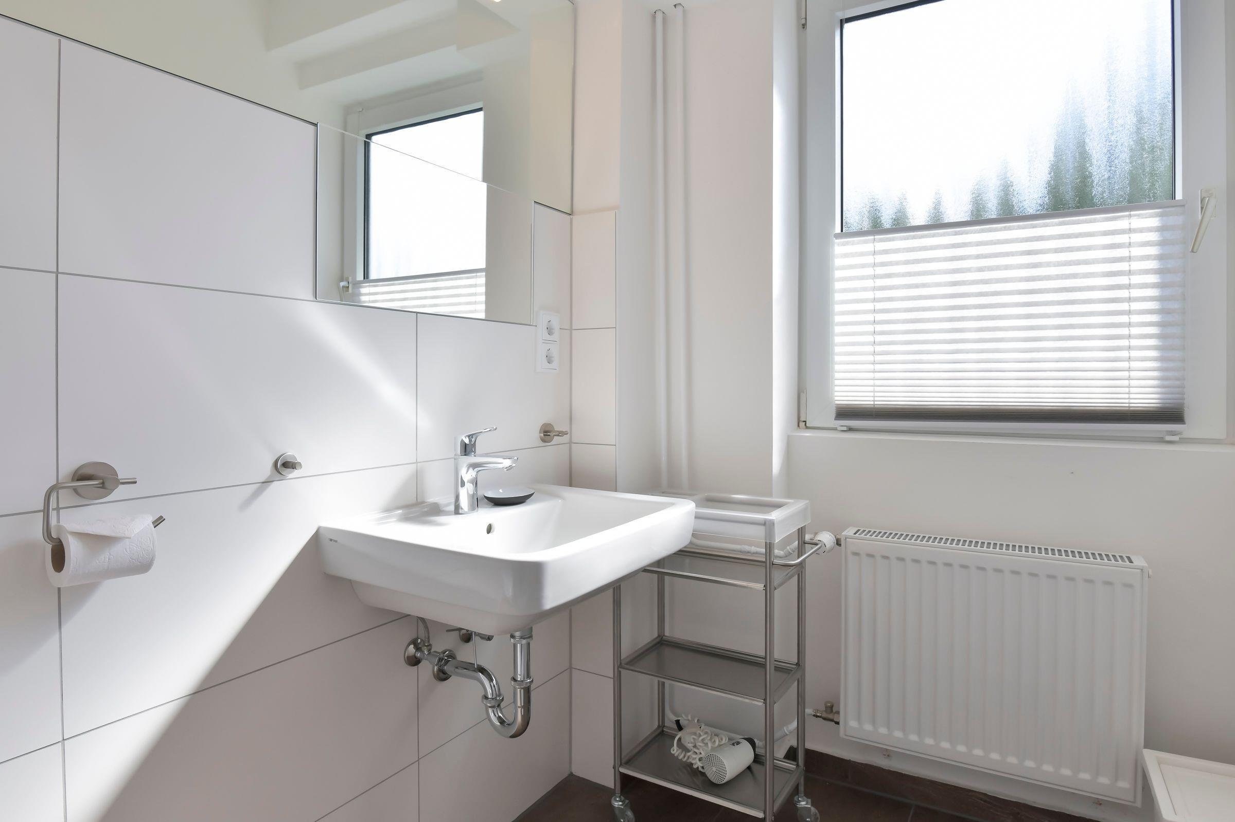 Das Schlafzimmer ist mit einem bequemen Doppelbett (2x 90x200cm) und einem geräumigen Kleiderschrank ausgestattet, im Wohnzimmer befindet sich ein gemütliches Schlafsofa (Liegefläche ca. 140x200 cm), Rollos und Plissees dienen als Verdunklung. Hier ist auch Platz für ein Kinderreisebettchen. Für die kleinen Gäste ist sowohl ein Kinderreisebettchen als auch ein Hochstuhl vorhanden. In der modernen, separaten Küche lassen sich mit Induktionsherd mit 2 Kochfeldern und Backofen leckere Urlaubsgerichte zaubern, die Spülmaschine kümmert sich um den Abwasch. Das elegante Tageslichtbad ist hell gefliest und mit Dusche, Hänge-WC, Waschbecken und Spiegel komfortabel ausgestattet.