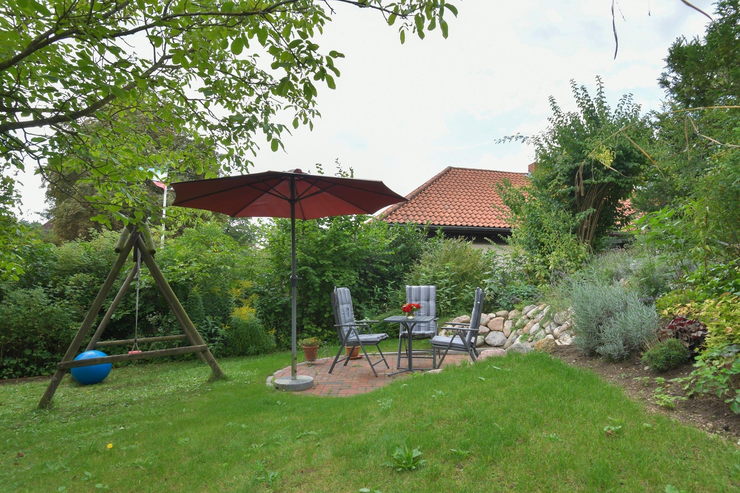 Im malerisch angelegten Gemeinschaftsgarten stehen zwei gemütliche Sitzecken und eine Kinderschaukel zur Nutzung für alle Gäste bereit.