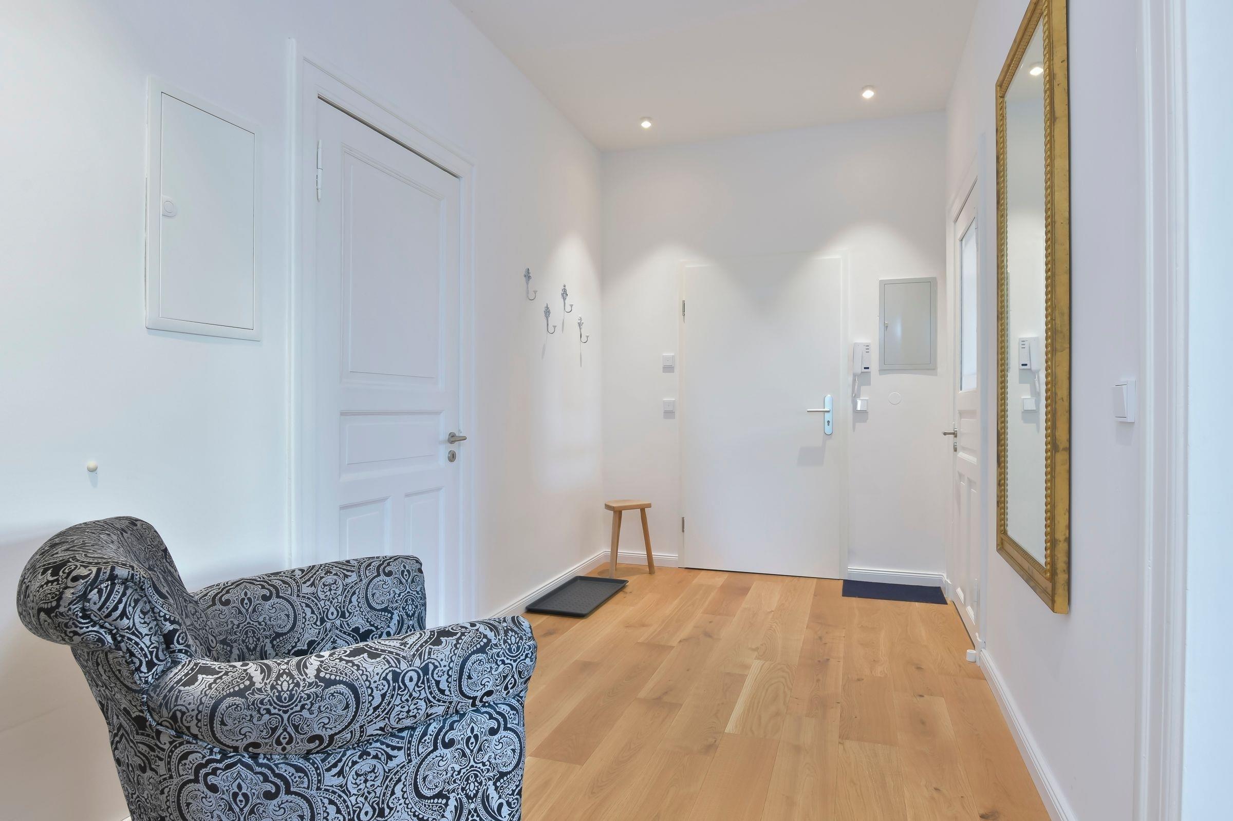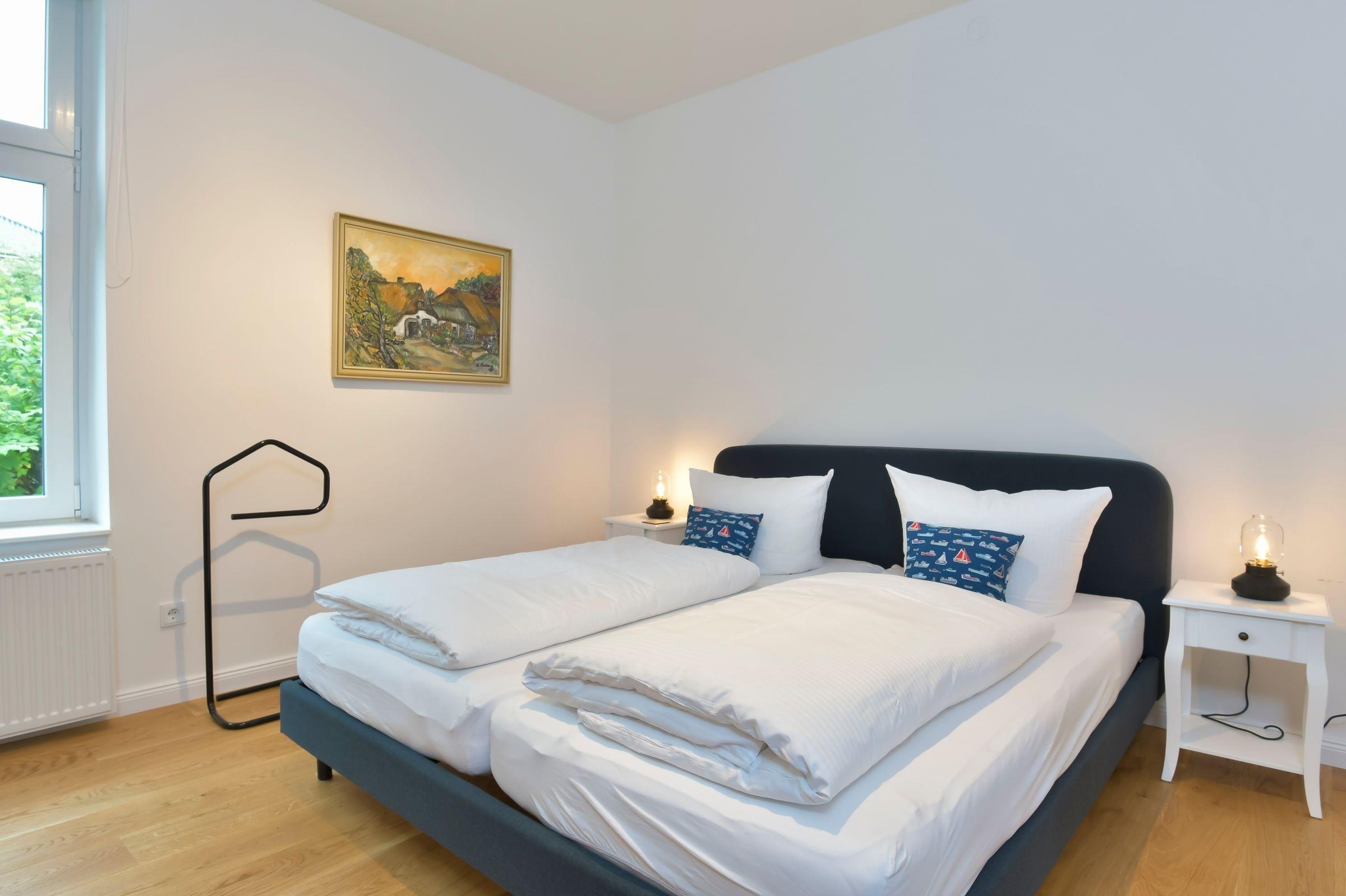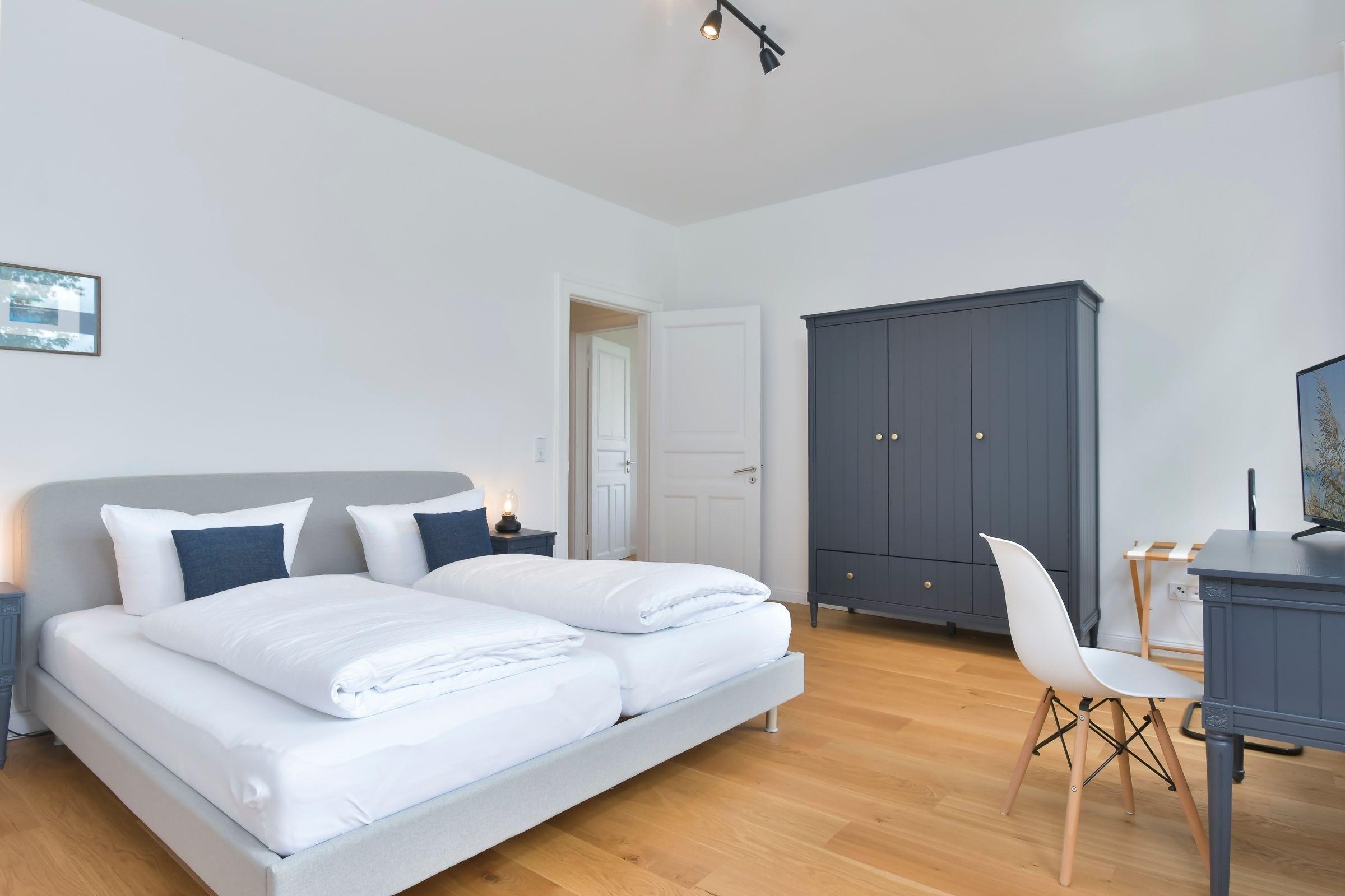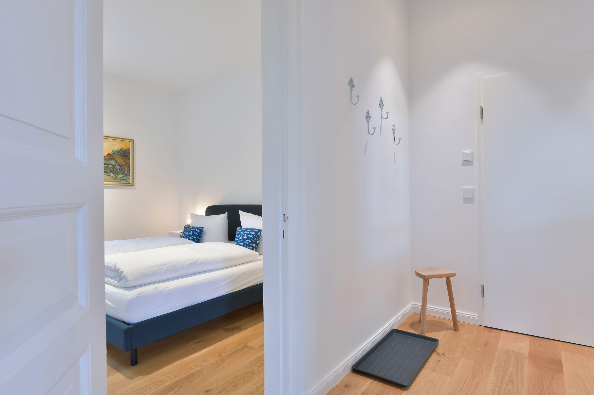 Der einladende Flur mit Garderobenbereich, Spiegel und Sessel führt zu allen Räumen. Das erste separate Schlafzimmer ist mit hochwertigem Doppelbett (2x 90x200 cm), Kleiderschrank und Flatscreen-TV möbliert, ein Black-out-Rollo sorgt für angenehme Verdunkelung zur Nacht. In diesem Zimmer wäre bei Bedarf auch Platz für ein Kinderreisebett. Ein besonderer Luxus ist das tageslichthelle Bad en Suite mit Dusche, WC und Handtuchheizung.