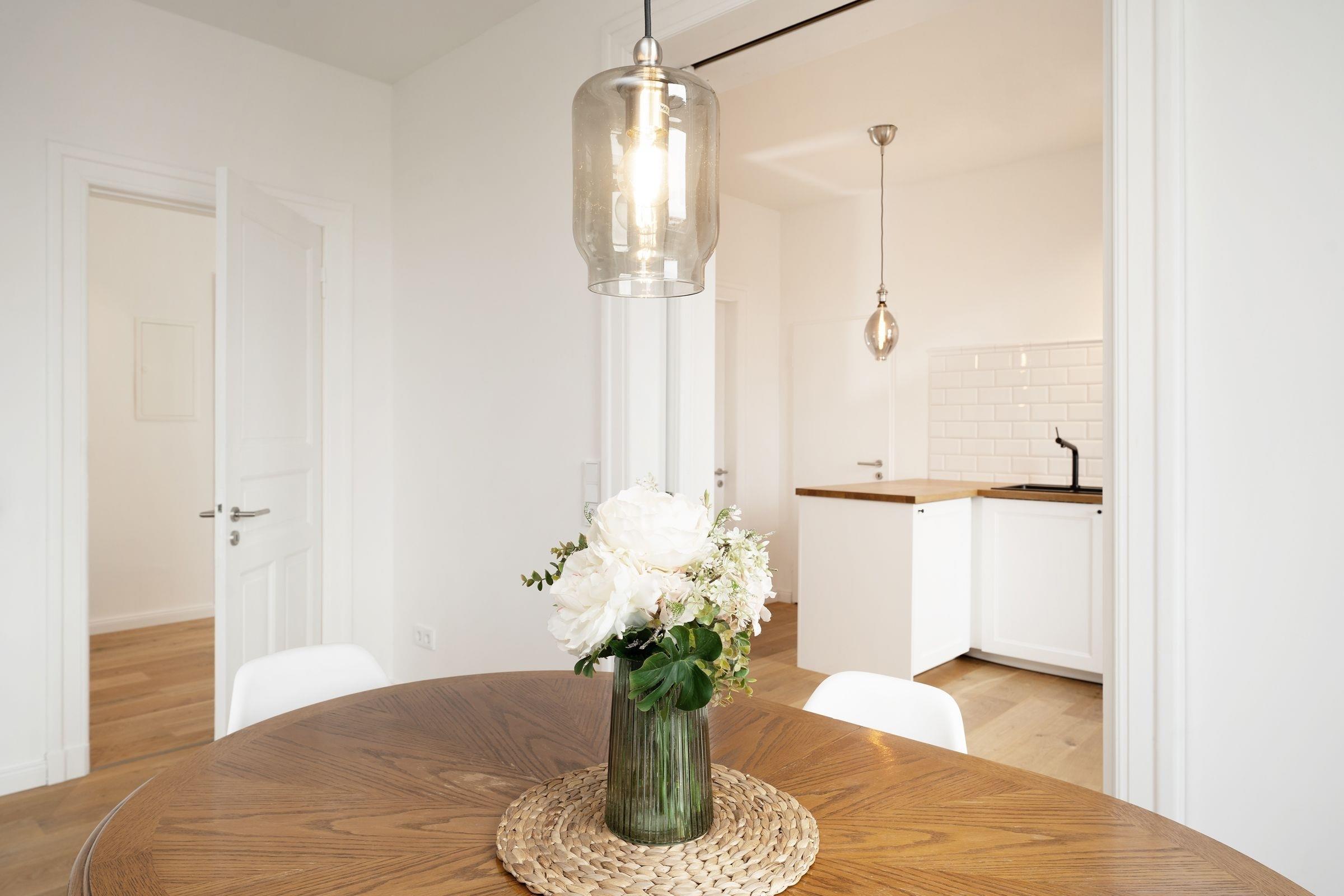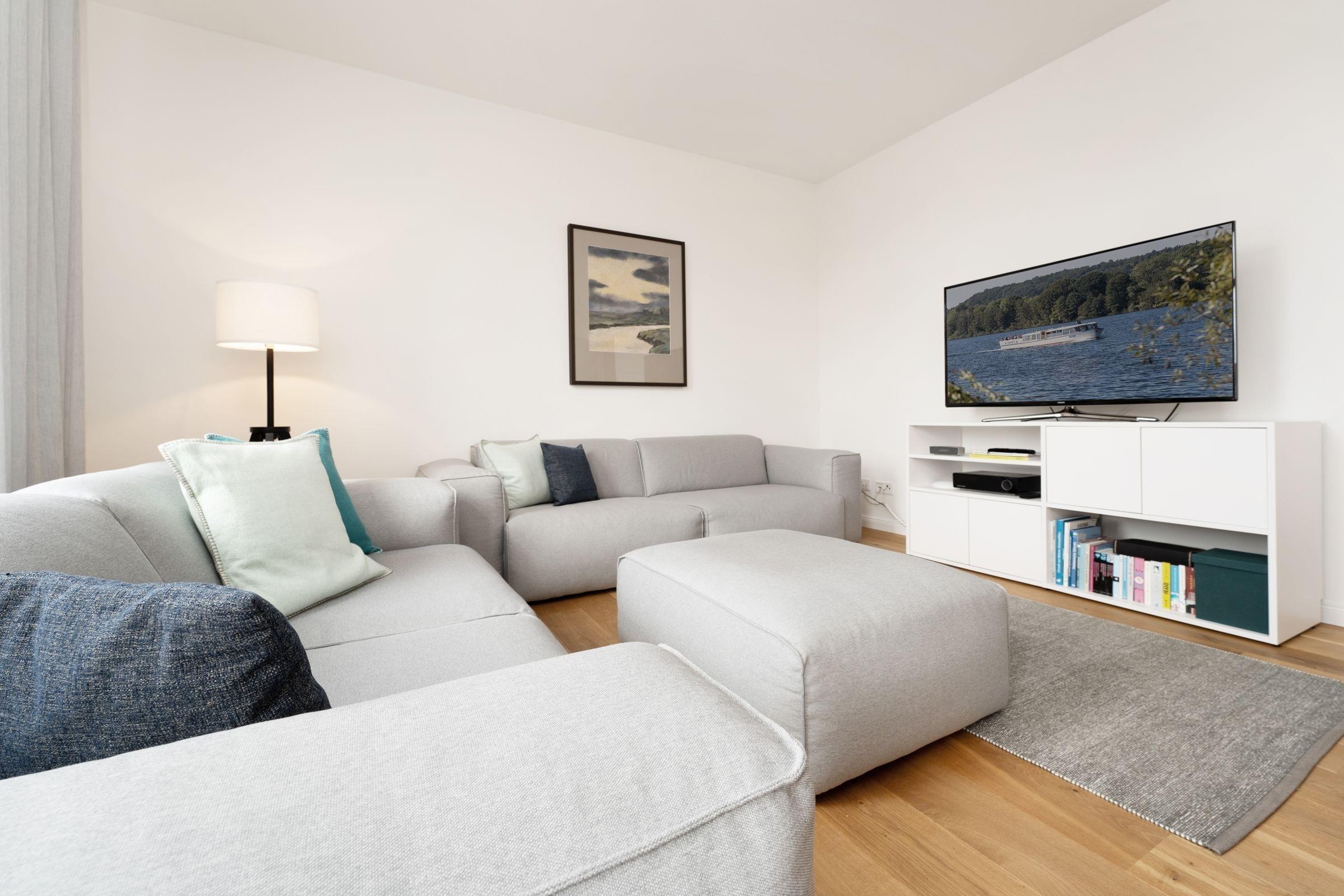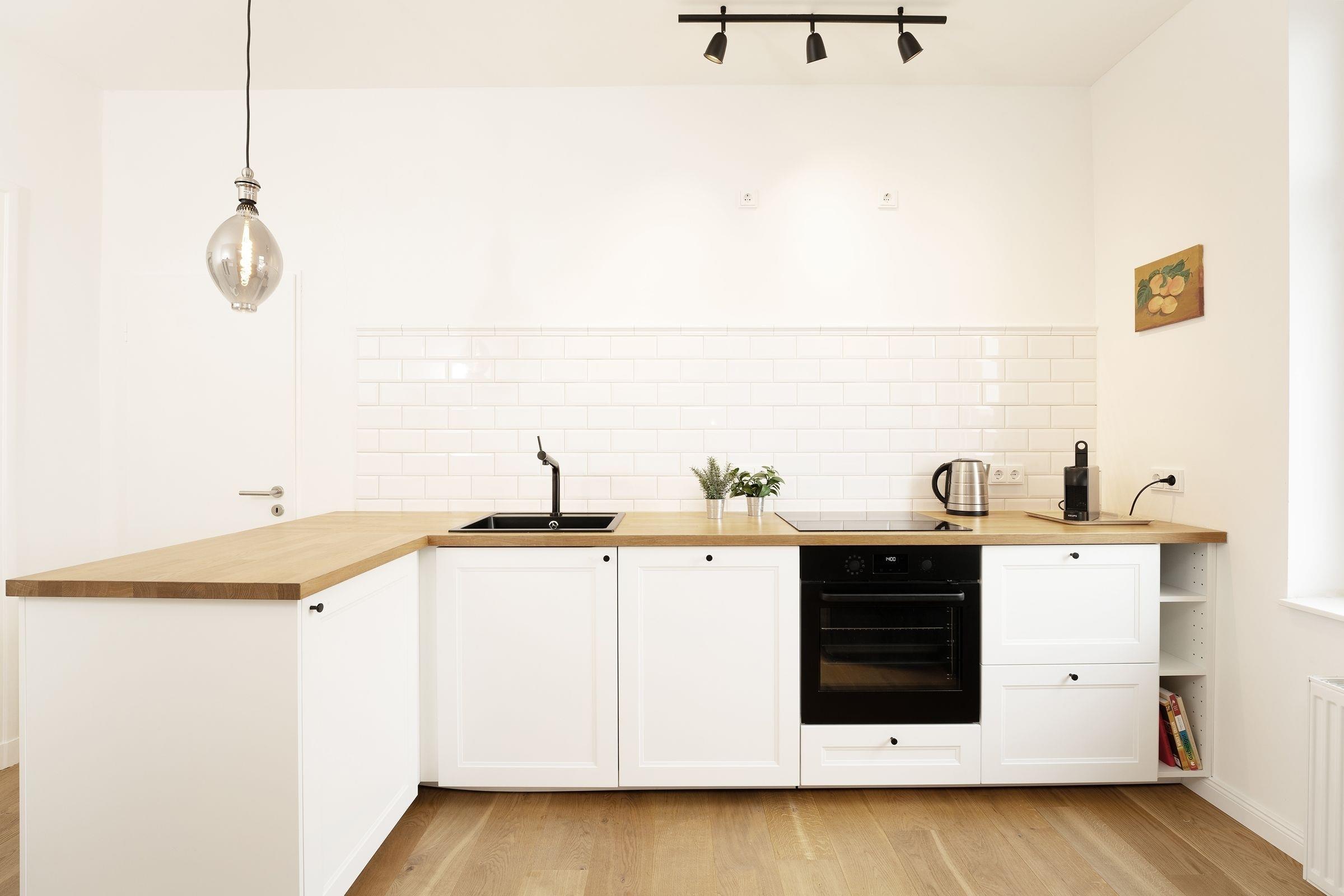 Der offene und geräumige Wohnraum ist stilsicher mit Sofa und Sesseln und großem Flatscreen-TV eingerichtet. Ein schöner Esstisch für vier lädt zu geselligen Runden ein. Vom Wohnbereich führt ein offener Durchgang zur Küche im modernen Landhausstil, helle Metrofliesen sorgen für zeitgemäßen Flair, Kochbegeisterte erfreuen sich am Induktionsherd mit 4 Kochfeldern und dem Backofen sowie dem großen Kühlschrank mit Gefrierfach.