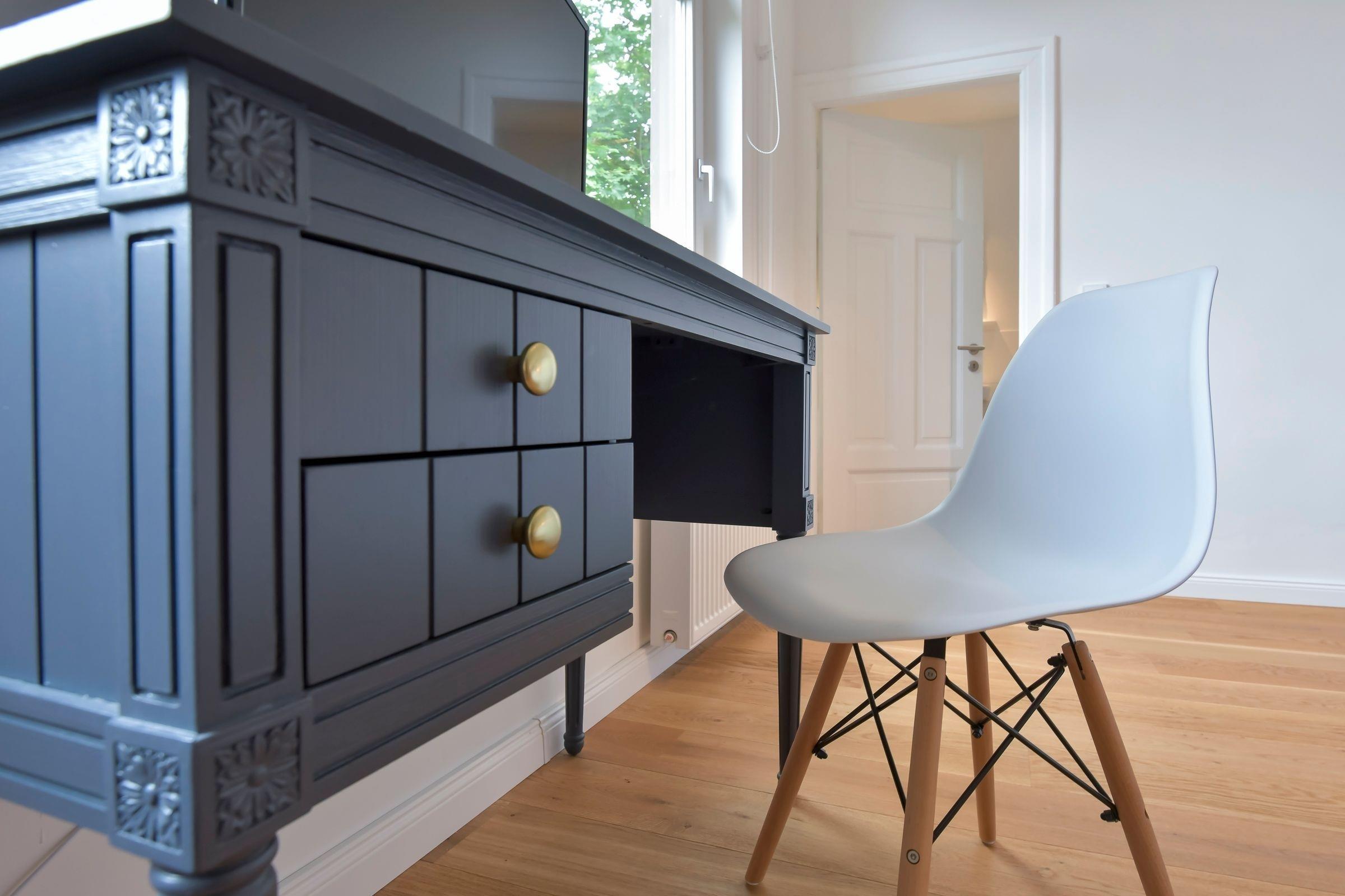 Schlafzimmer 1: 1 Doppelbett (2x 90x200 cm), Kleiderschrank, TV, Verdunkelung (Black-out-Rollo), Platz für Kinderbett.