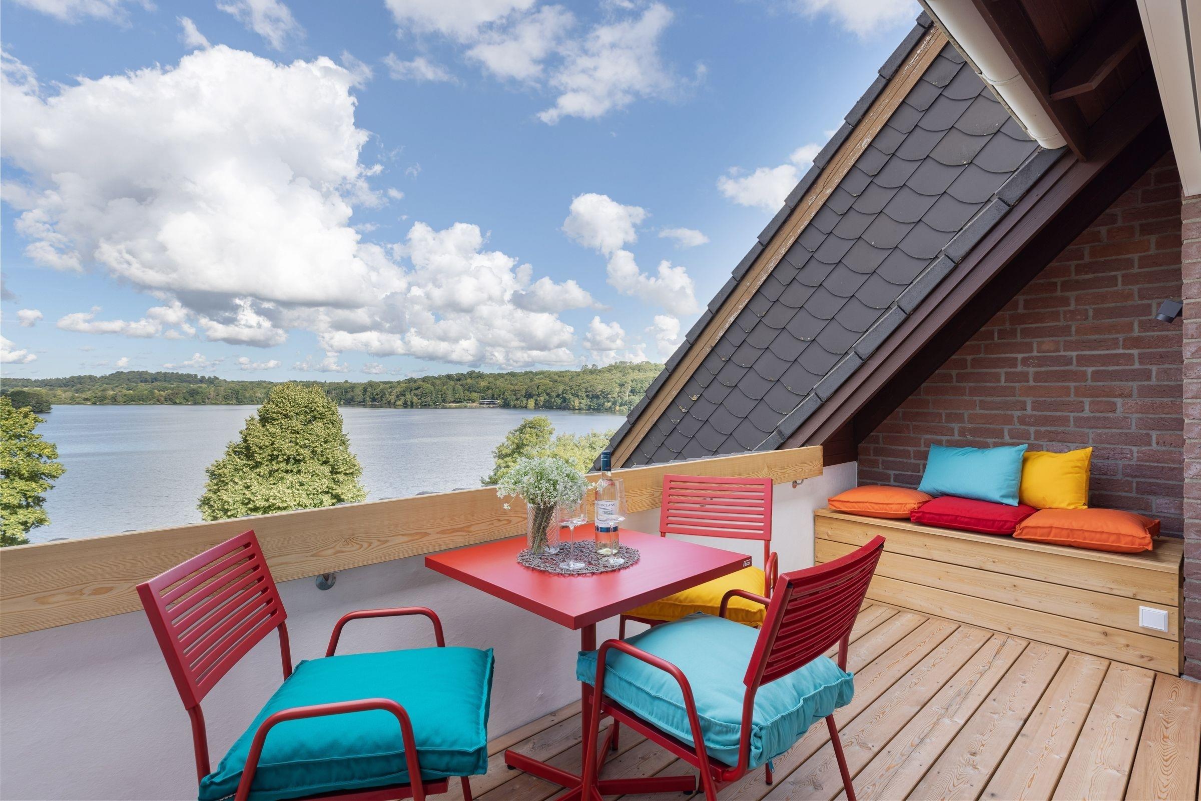 Verbringen Sie erholsame Sonnenstunden auf dem möblierten Balkon mit Nord-West-Ausrichtung. Von dort aus haben Sie einen traumhaften Ausblick auf den Dieksee, den Sie auf der praktischen Holzbank genießen können, die auch für eine Person als Liege genutzt werden kann.