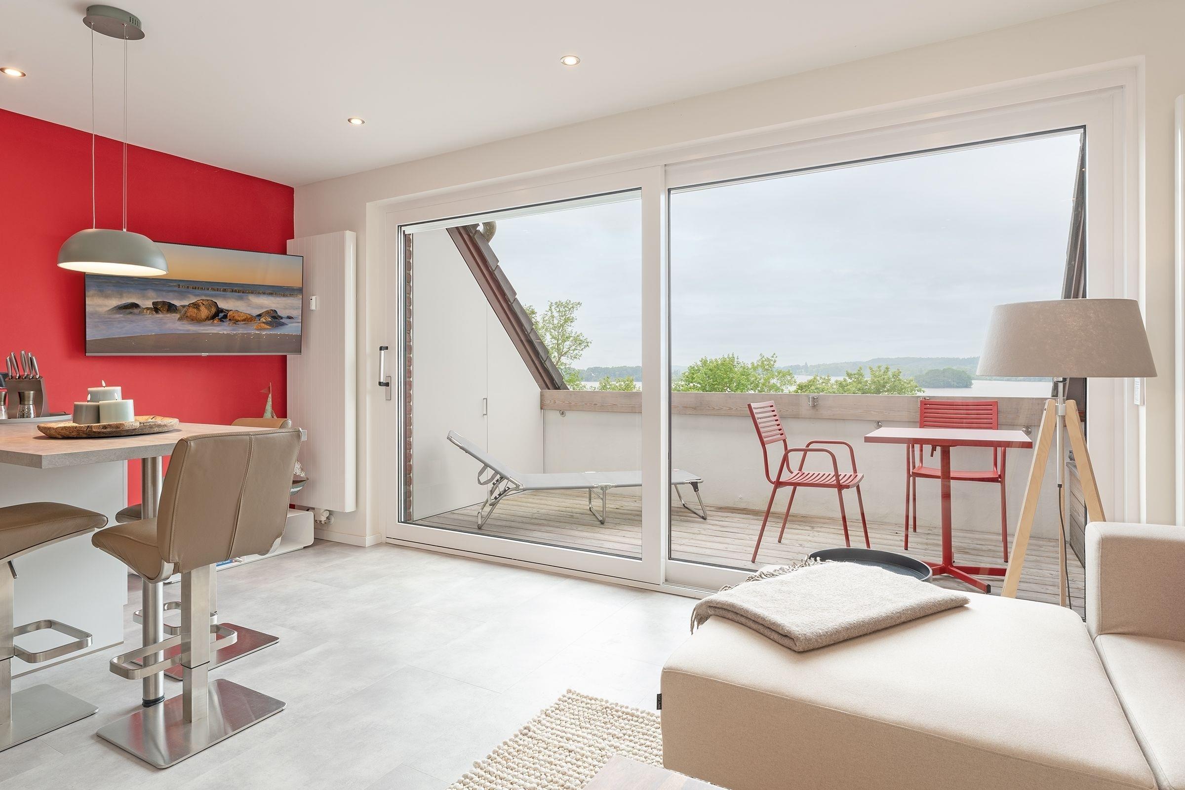Mit dem Fahrstuhl gelangen Sie unbeschwert in die 3. Etage Ihrer Ferienwohnung des Hauses Dieksee Holm. Im stilvoll eingerichteten Wohnbereich erwartet Sie ein komfortables Sofa und ein moderner Sessel, die zum Entspannen vor dem Flachbildfernseher einladen. Die offene und vollausgestattete Küche lädt zum Kochen von köstlichen Urlaubsmahlzeiten ein. Der integrierte Tresen bietet Platz für alle Gäste. Das separate Schlafzimmer ist mit einem Doppelbett (180x200 cm), Kleiderschrank und TV ausgestattet. Für mehr Platz lassen sich Ihre Koffer bequem unterhalb des Bettes verstauen.