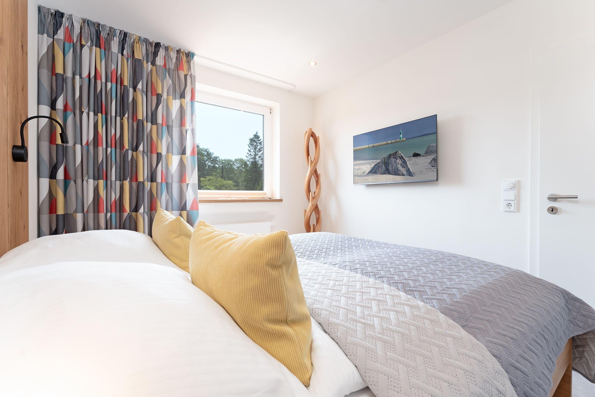 Schlafzimmer: 1 Doppelbett (180x200 cm), TV, Kleiderschrank, Sichtschutz: Plissee und Insektenschutz