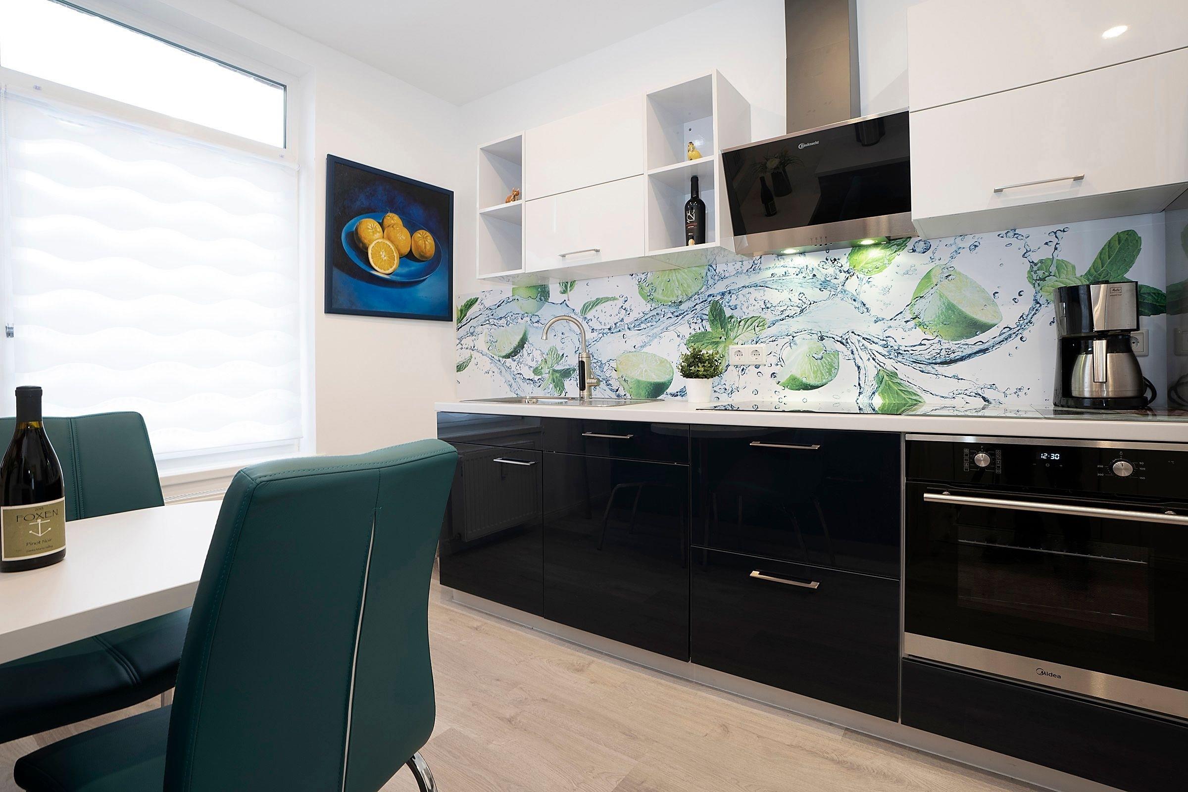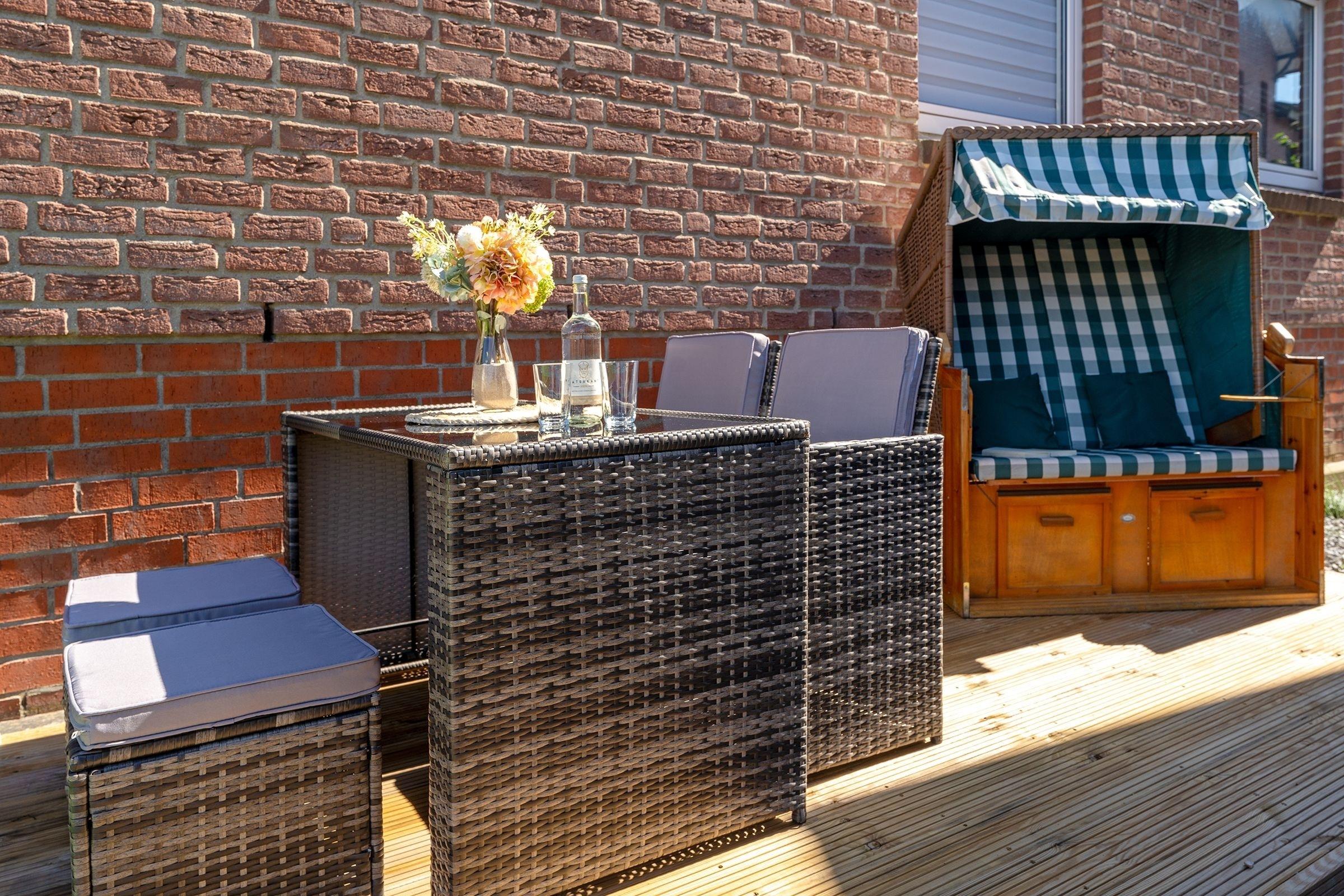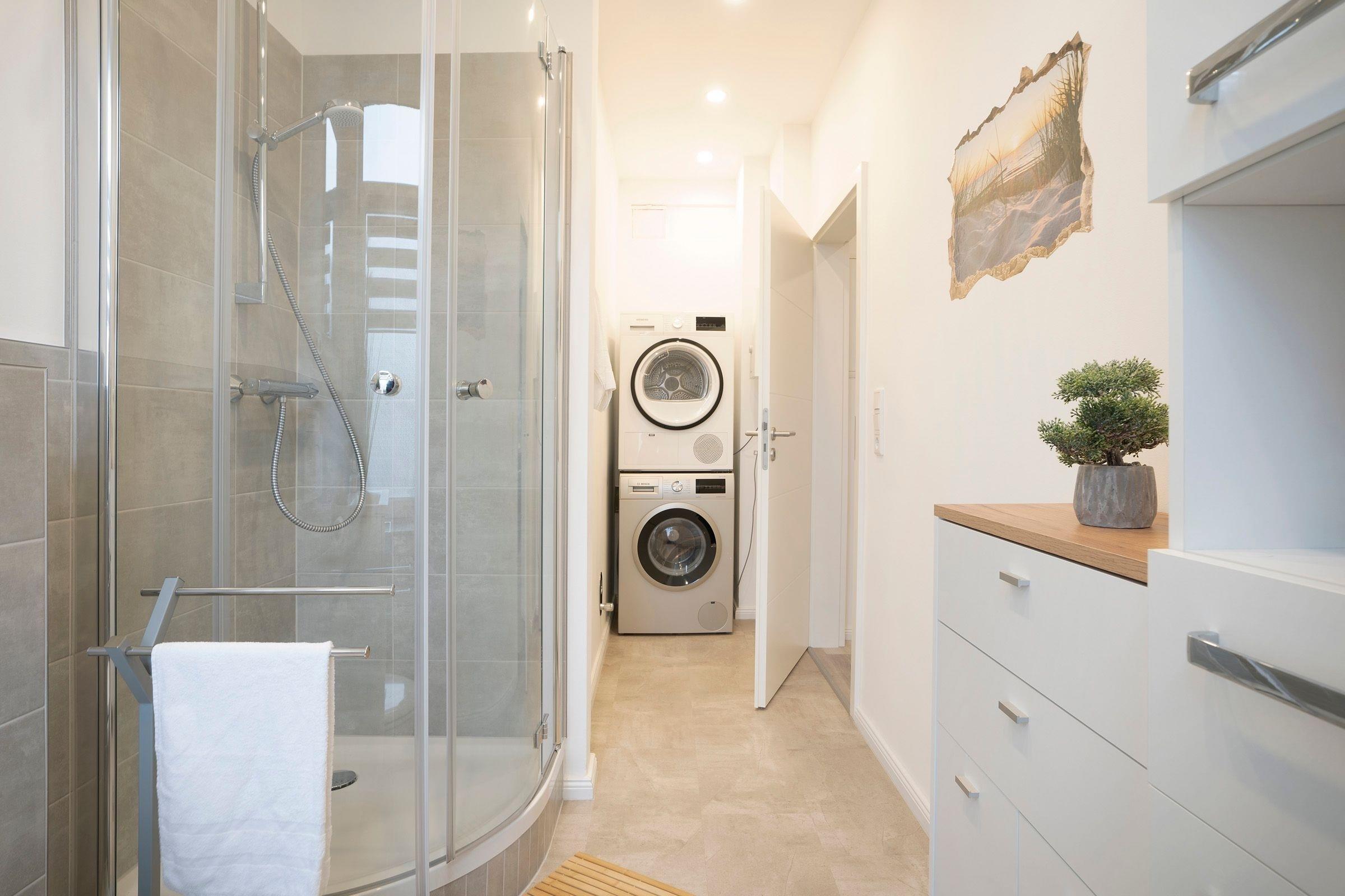 Vom Flur aus gelangen Sie in den stylischen Wohnbereich mit weiterem Zugang in das angrenzende Schlafzimmer. Hier verspricht das großzügige Doppelbett (2x 90x200 cm) erholsame Nächte. In einem weiteren kleinen Zimmer können Sie sich zum Lesen, Ausruhen und Entspannen auf der Recamiere zurückziehen. Die offen gestaltete Küche ist mit vielen Annehmlichkeiten ausgestattet und lädt zum Kochen am Induktionsherd und gemeinsamen Essen am angrenzenden Essplatz ein. Als besonderen Komfort verfügt diese Wohnung im hellen Tageslicht-Duschbad über eine eigene Waschmaschine und einen Trockner. Den perfekten Abschluss Ihrer Urlaubstage können Sie auf der gemeinschaftlich genutzten Terrasse im angrenzendem Gemeinschaftsgarten genießen.