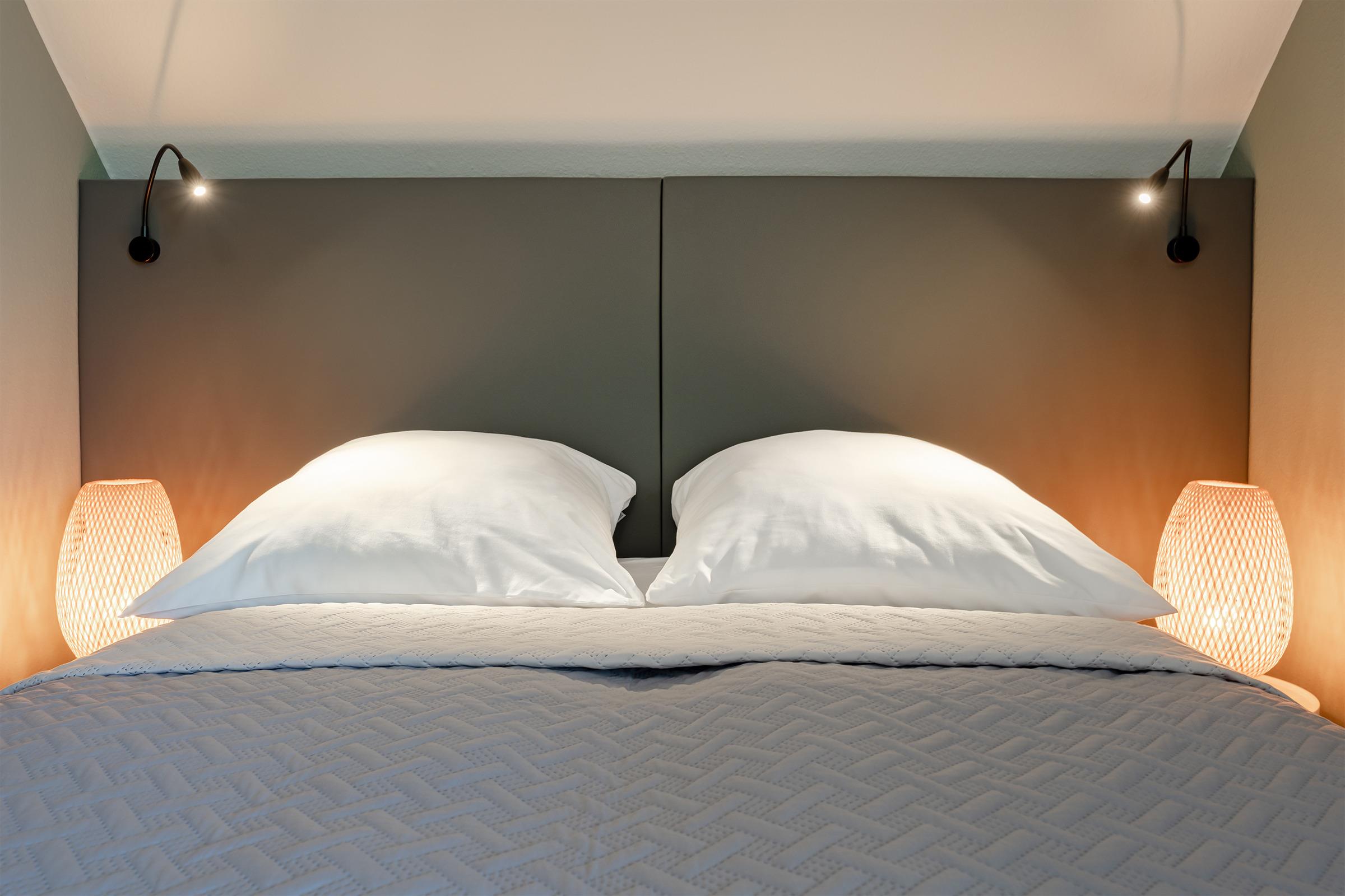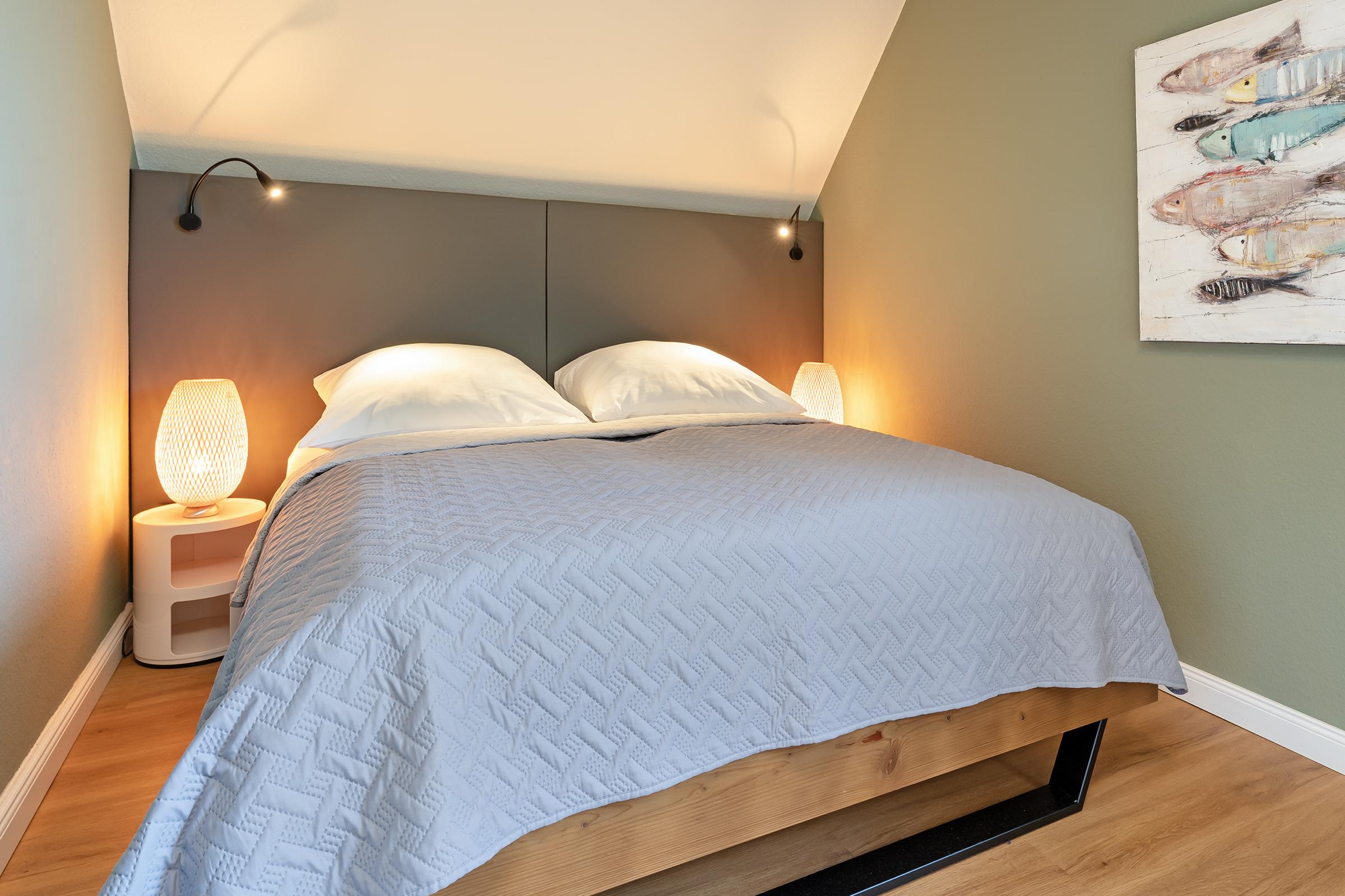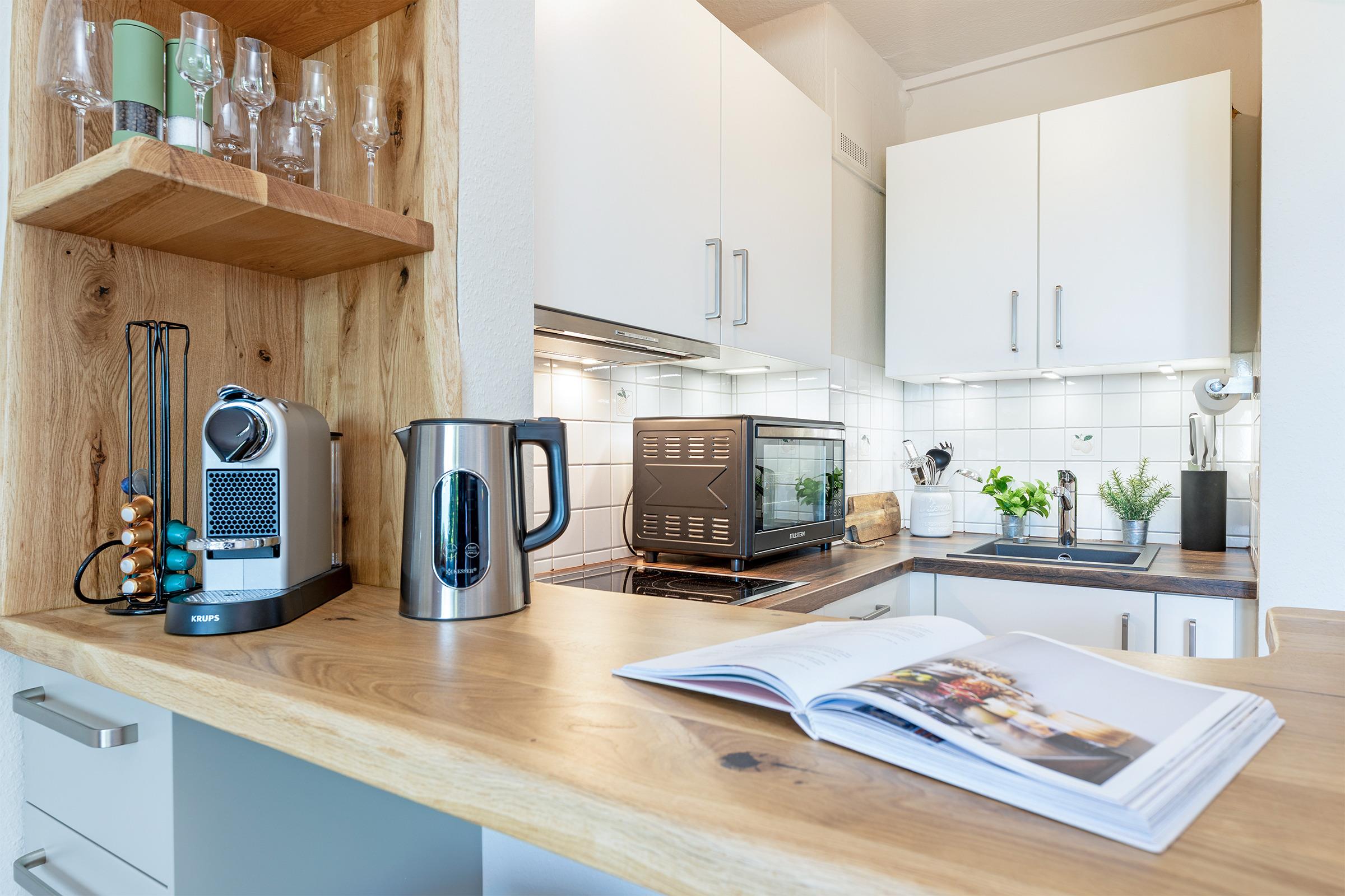 Die optisch vom Wohnbereich abgetrennte Küche offeriert neben einer guten Ausstattung einen zusätzlichen Delonghi-Kaffeevollautomat für den exklusiven Kaffeegenuss und einen Mini-Backofen. Im separaten Schlafzimmer genießen Sie erholsame Nächte im bequemen Doppelbett (2x 80x200 cm) und starten erholt im hell gefliesten Tageslicht-Duschbad in den neuen Urlaubstag.