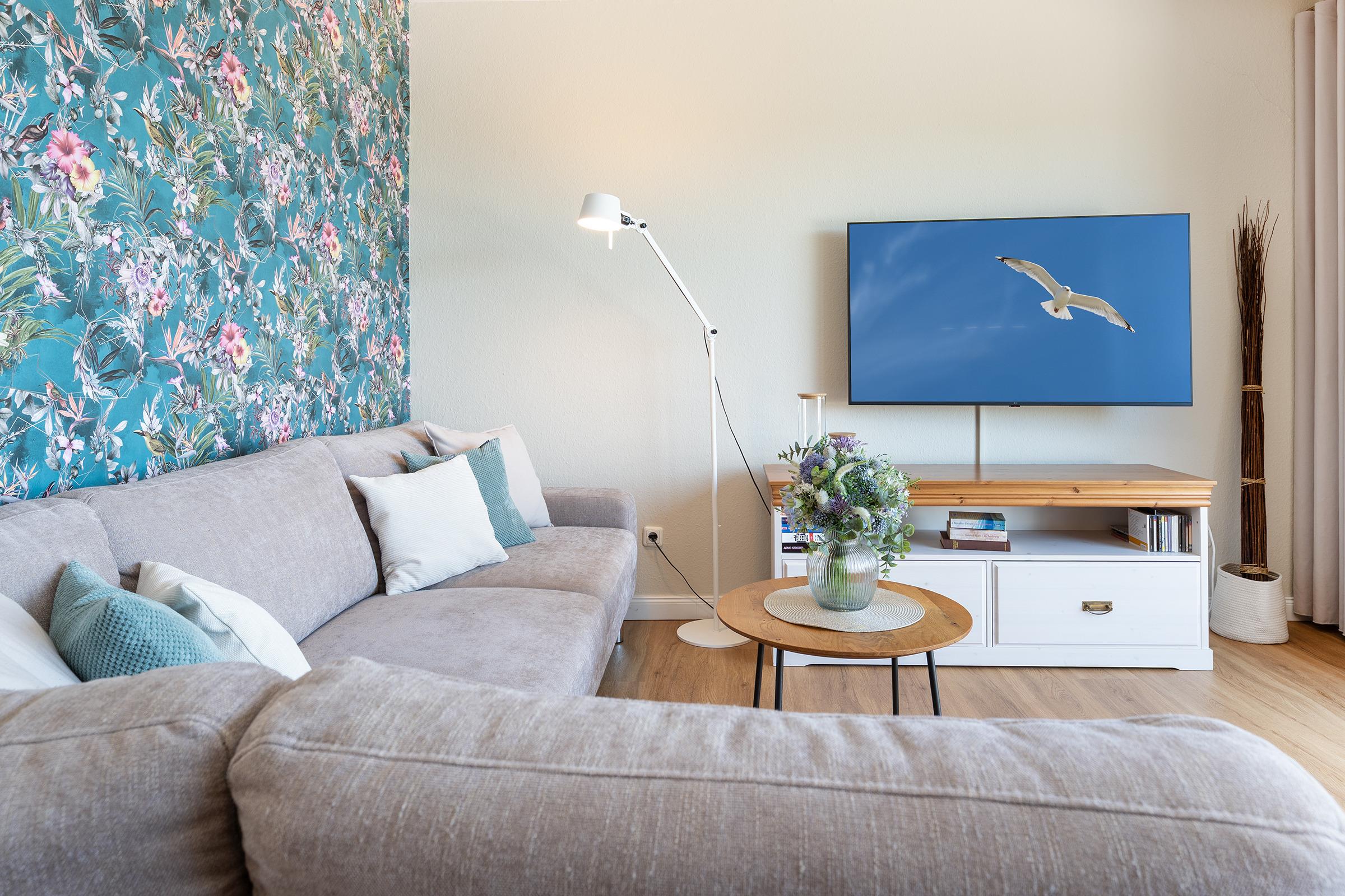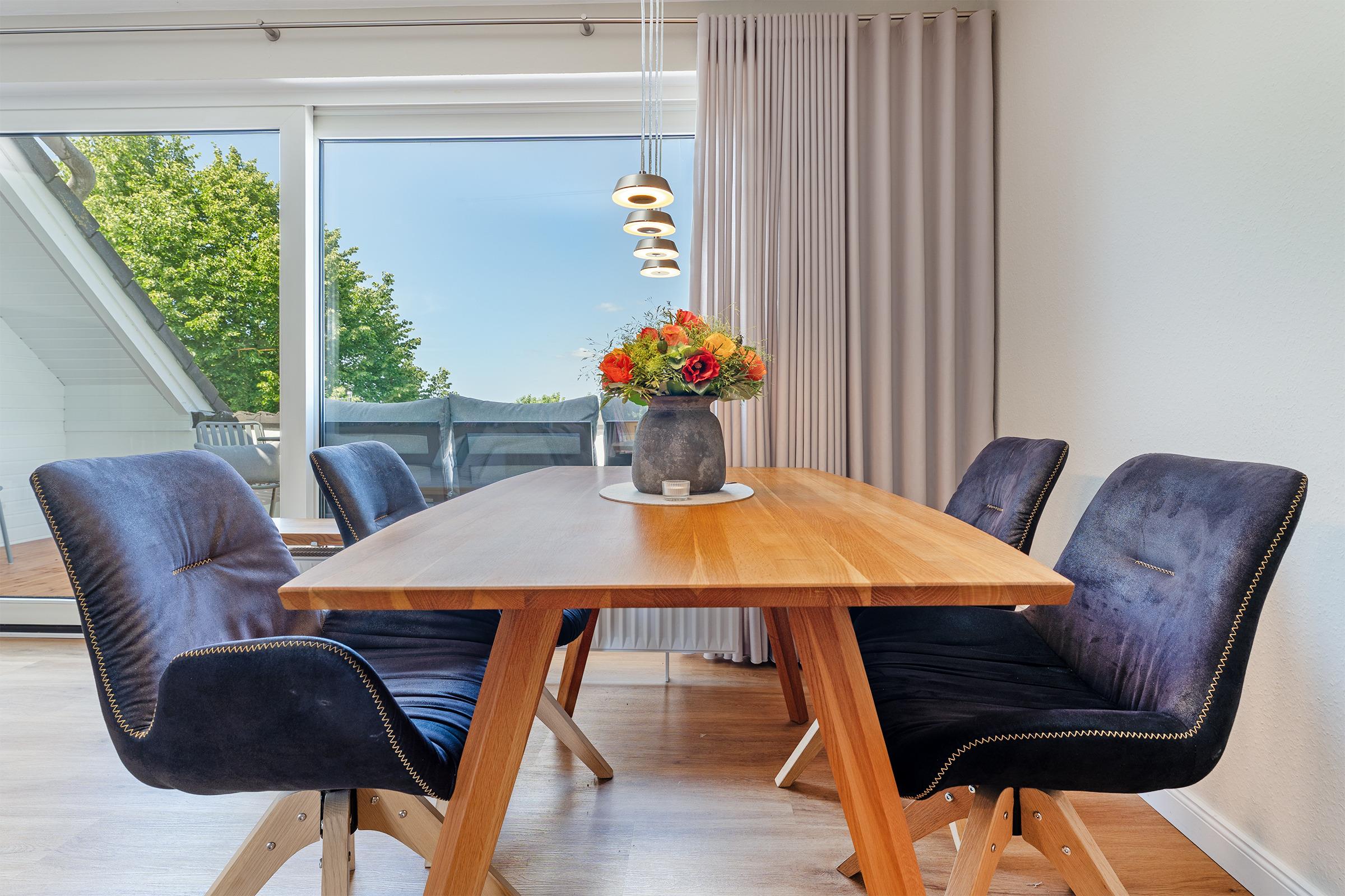 Ein Fahrstuhl bringt Sie bequem in Ihr Urlaubsdomizil. Hier werden Sie von dem hellen und gemütlich ausgestatteten Wohnbereich empfangen und können sich gleich wie zu Hause fühlen. Als Highlight erwartet Sie eine große Fensterfront und ein traumhafter Ausblick auf den Malenter Dieksee. Nehmen Sie Platz auf den gemütlichen Lounge-Möbeln und genießen den Sonnenuntergang bei einem guten Glas Wein an der frischen Luft auf dem Balkon.