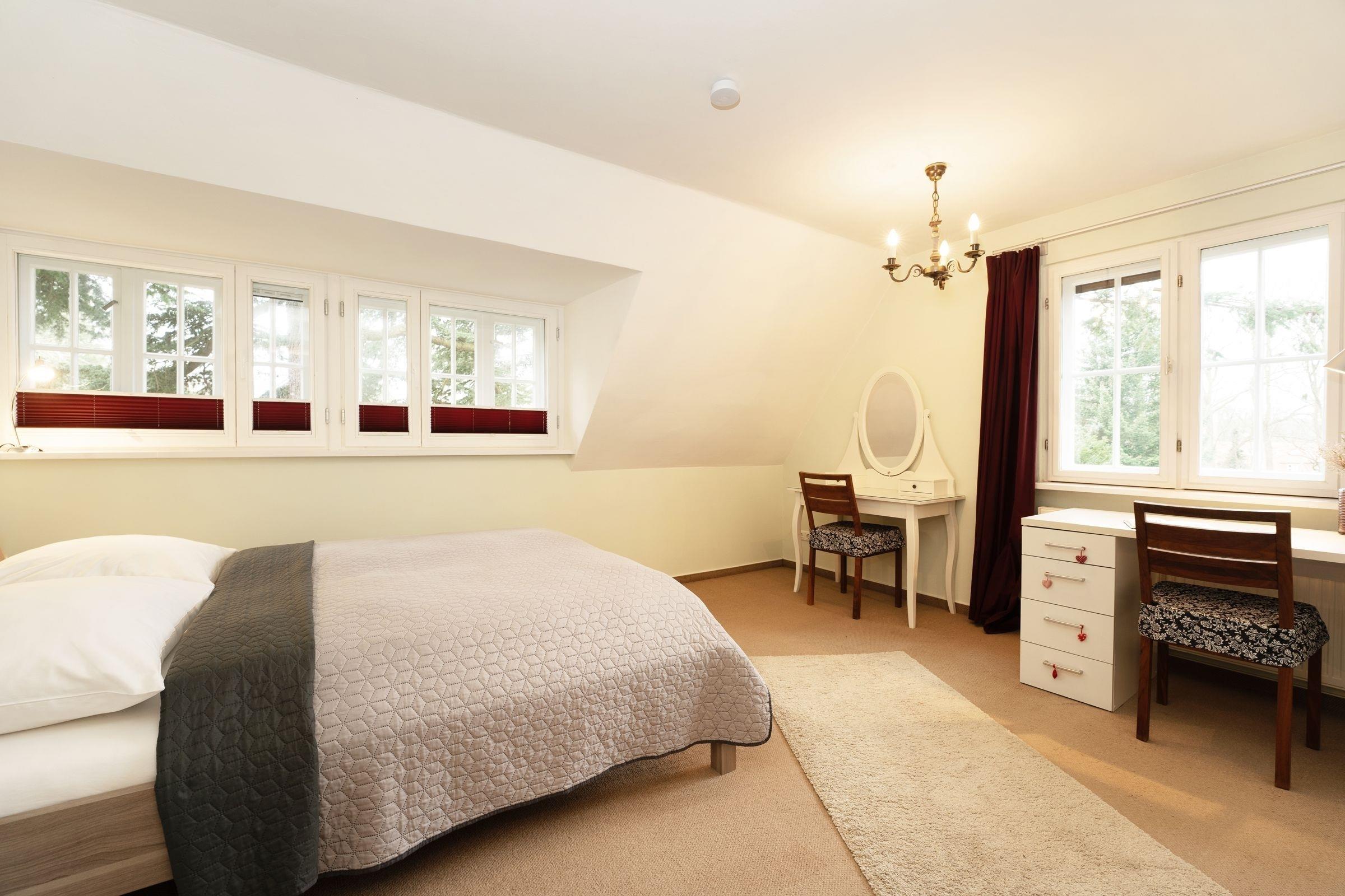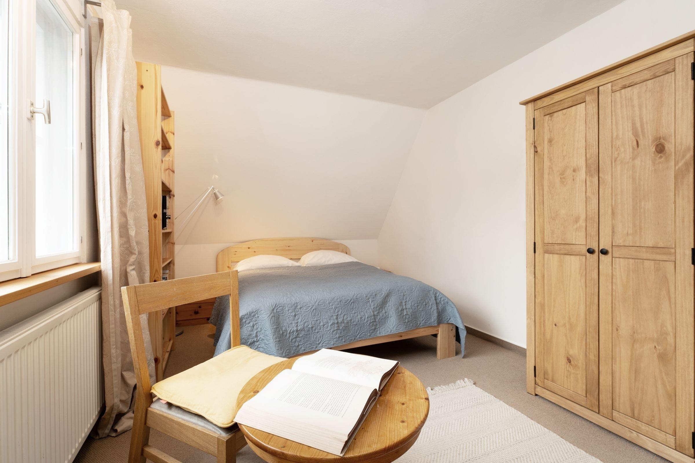 Schlafzimmer 2: Doppelbett (2x 80x200 cm), 1. OG, Verdunkelung: Vorhänge, kein Platz für Babybett vorhanden