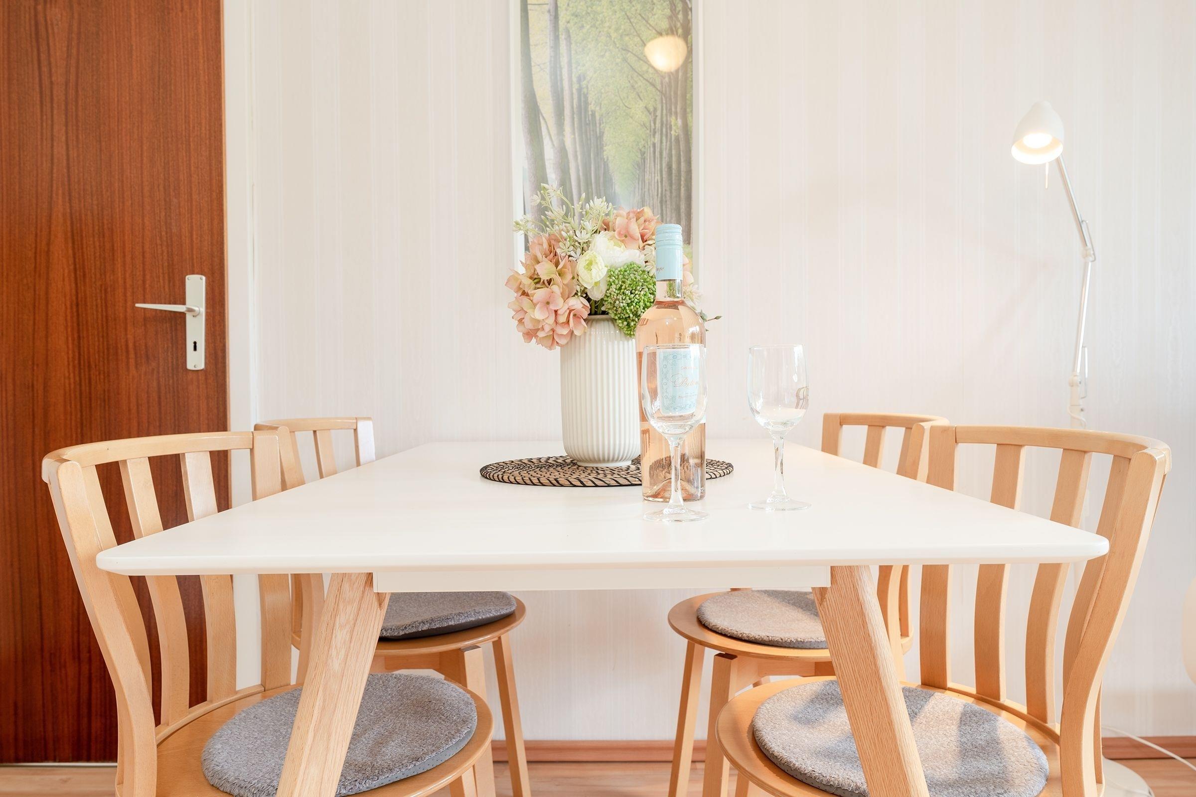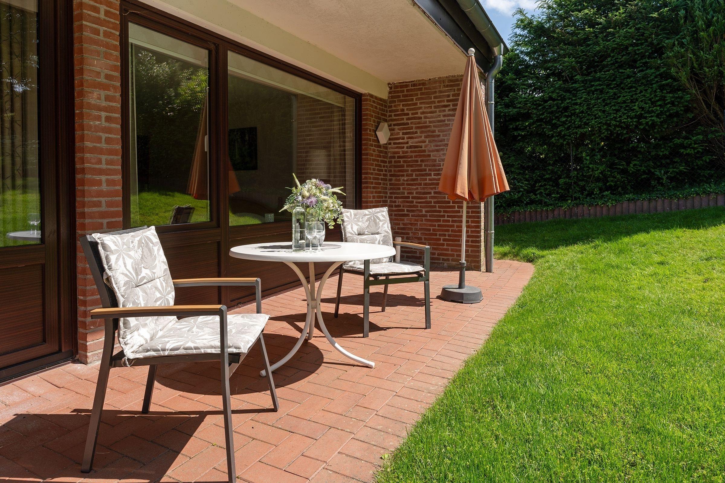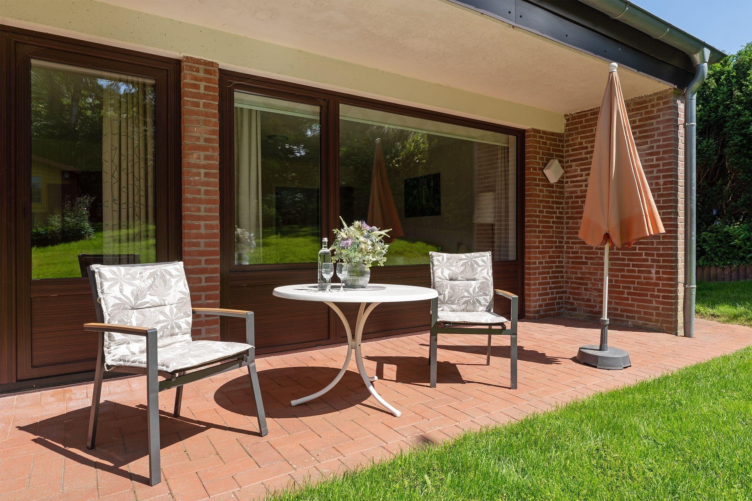 Eintreten und Wohlfühlen: Das Haus Matthiesen besticht mit einem lichtdurchfluteten Wohnbereich. Auf der bequemen Couch können Sie gemeinsam vor dem TV-Gerät entspannen. Sollte Appetit aufkommen, bietet die angrenzende Sitzecke viel Platz für zwei. Zum Zubereiten Ihrer Mahlzeiten eignet sich die separate, gut ausgestattete Küche inklusive Geschirrspüler. Sie nächtigen im Schlafzimmer in einem gemütlichen Doppelbett (2x 90 x 200 cm), abgedunkelt wird mit Rollos. Nachdem Sie sich morgens im Duschbad mit Fenster fertiggemacht haben, kann der nächste Urlaubstag beginnen. Treten Sie hinaus auf die großzügige überdachte Außenterrasse und genießen Sie die frische Luft.