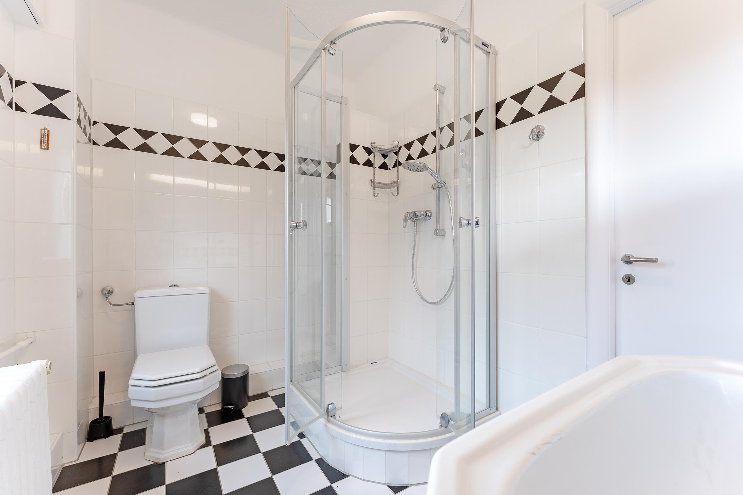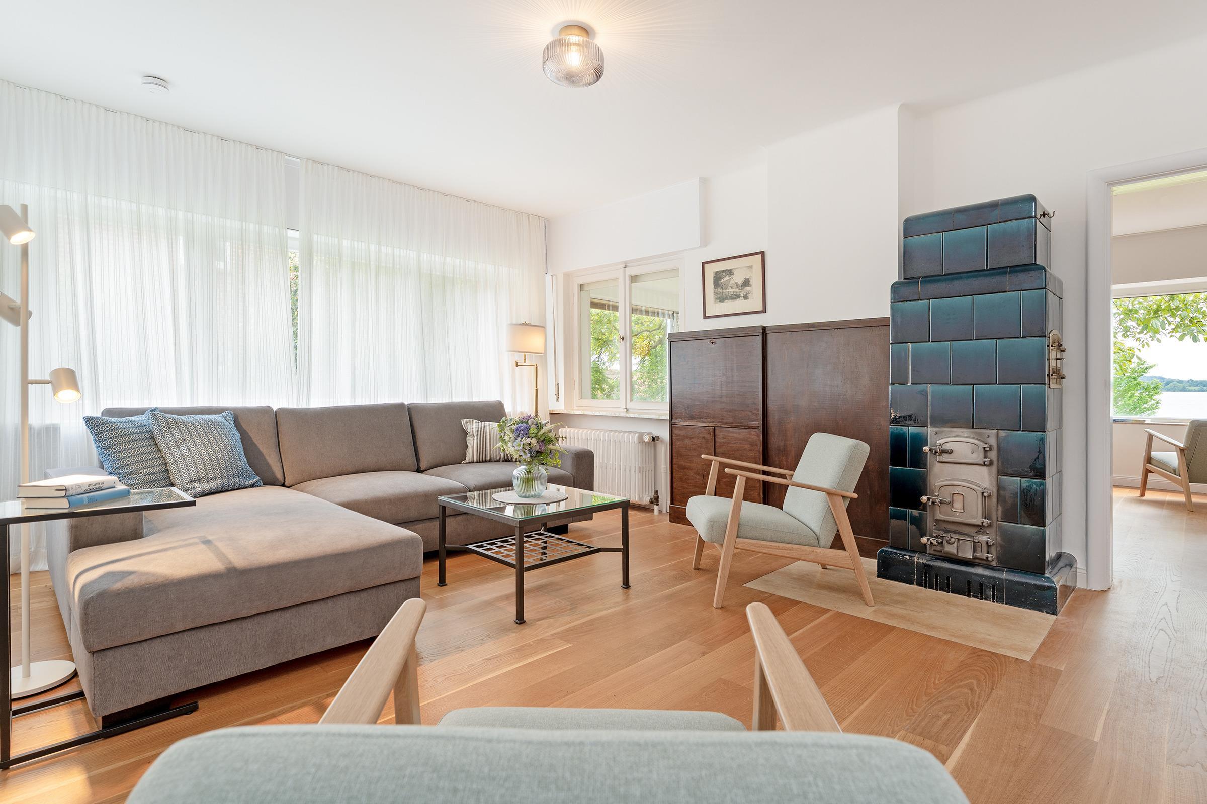 Der helle Wohnbereich mit Kaminofen lädt zu entspannten Abenden ein. Großzügige Fensterfronten eröffnen den Blick ins Grüne und auf den nahegelegenen See. Direkt angrenzend genießen Sie auf der nach Westen ausgerichteten Terrasse sonnige Nachmittage oder lauschige Abende. Gartenmöbel, ein Sonnenschirm und ein Strandkorb stehen Ihnen zur Verfügung. Die separate Küche ist hochwertig ausgestattet: Ceranfeld, Backofen, Mikrowelle, extra Gefrierschrank, Kühlschrank, Kaffeemaschine, Toaster und Wasserkocher lassen keine Wünsche offen. Gemeinsam speisen Sie in einem separaten Essbereich mit Ausblick auf das Seegeschehen. Fünf Schlafzimmer bieten Platz für bis zu acht Personen und sind gemütlich und stilvoll eingerichtet. Zwei Bäder im Obergeschoss sorgen für Komfort: eines ist mit einer Dusche, das andere mit einer Badewanne ausgestattet. Zwei Gäste-WCs im Erdgeschoss runden das Angebot ab.