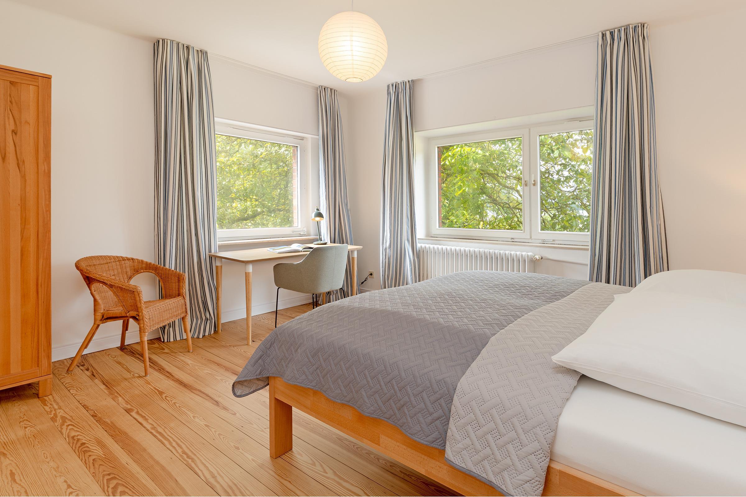 Schlafzimmer 1: Doppelbett (2x 90x200 cm), Kleiderschrank, Verdunklungsmöglichkeit: Vorhänge und Rollläden, Platz für Babybett vorhanden