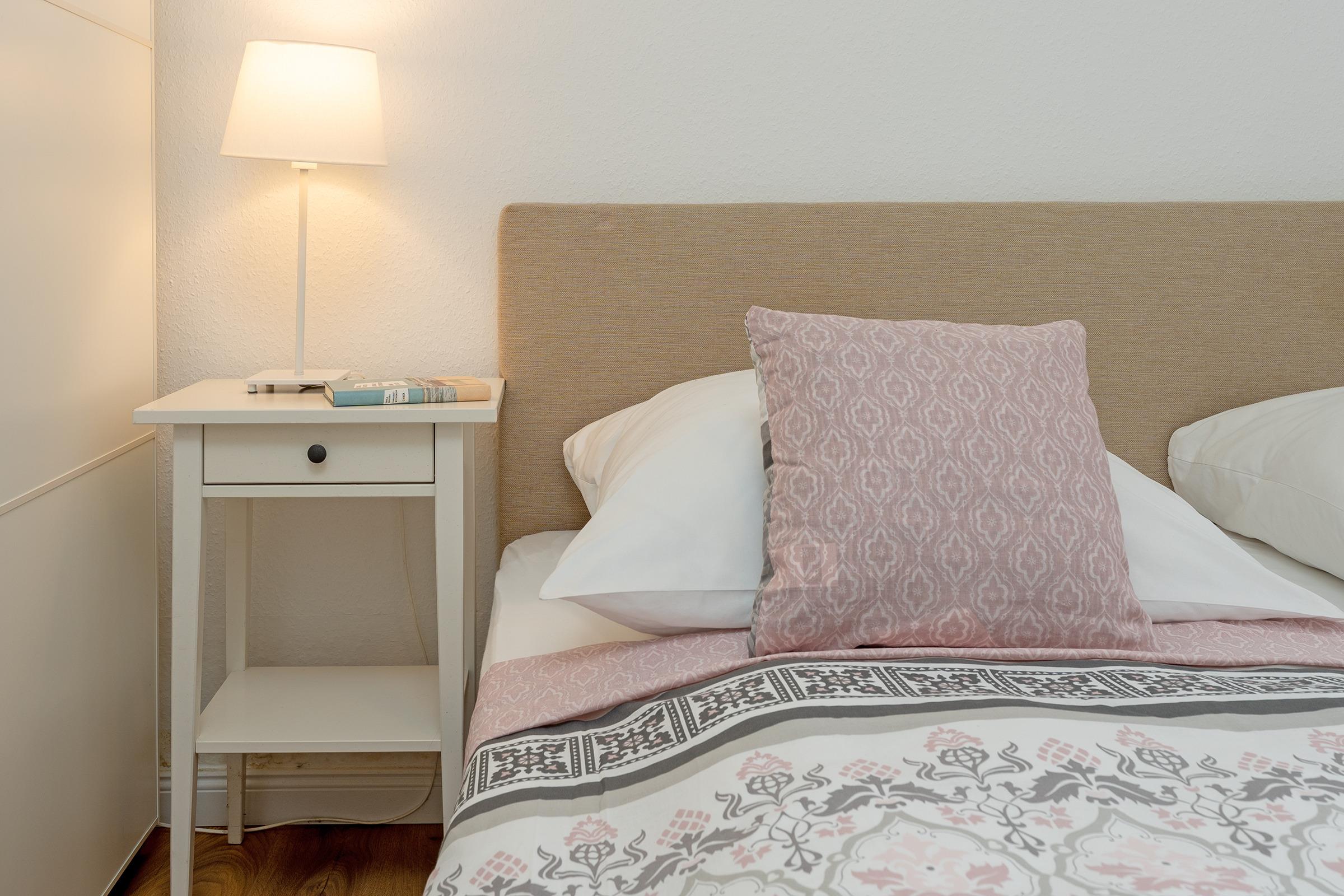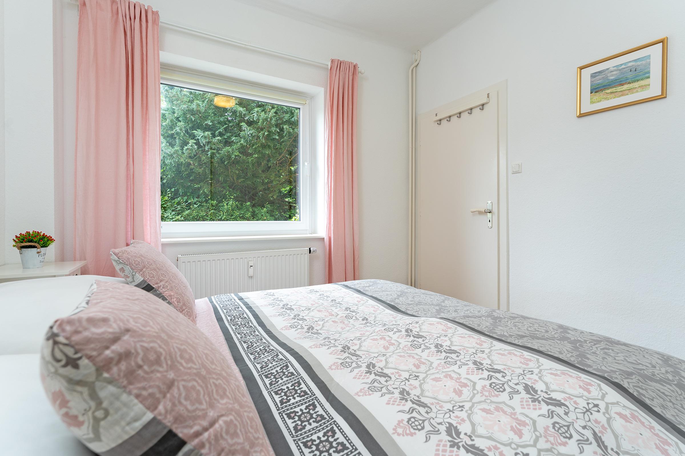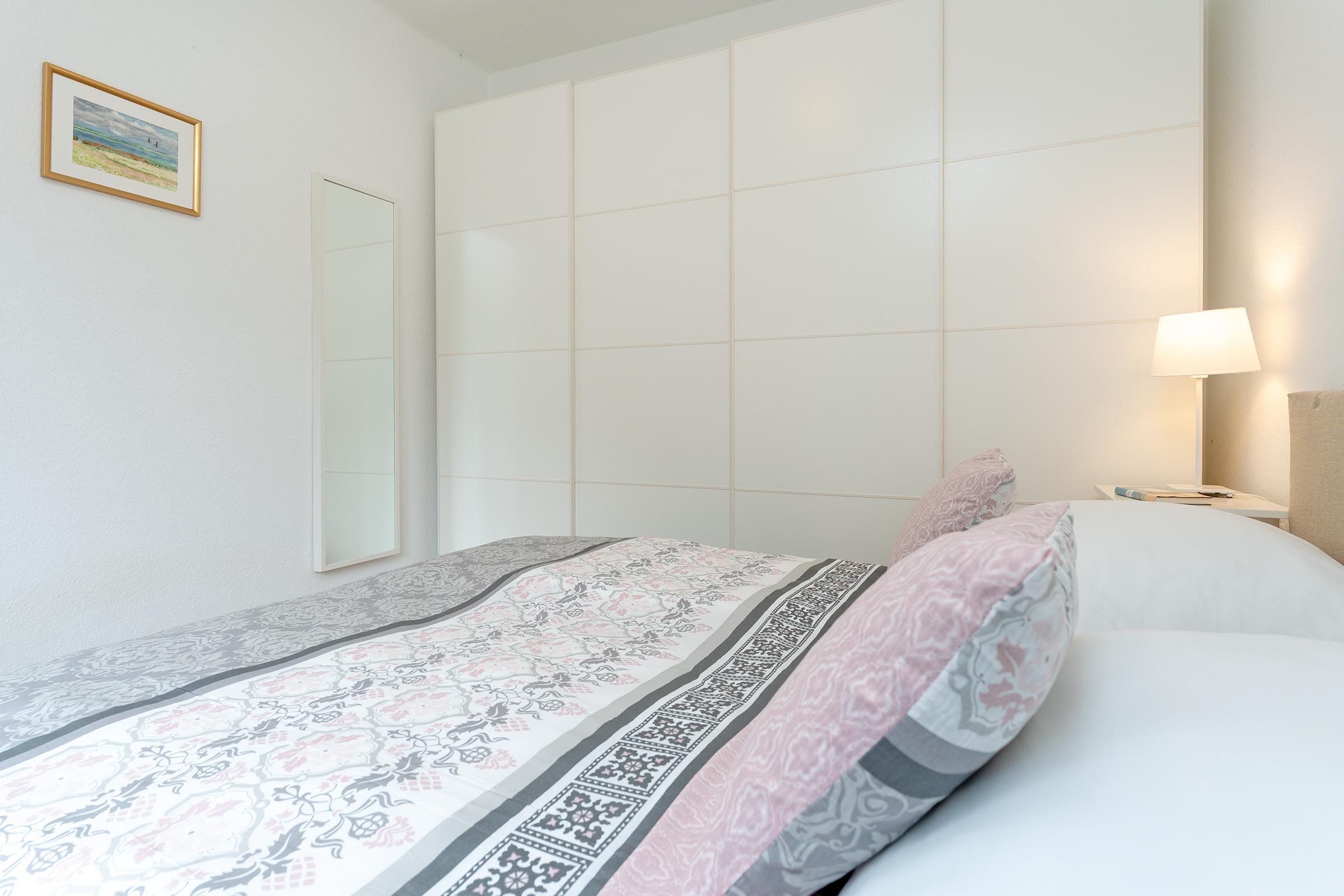 Schlafzimmer: 1 Doppelbett (2x 90x200cm), Kleiderschrank, Verdunkelung: Vorhang, Platz für ein Babybett vorhanden