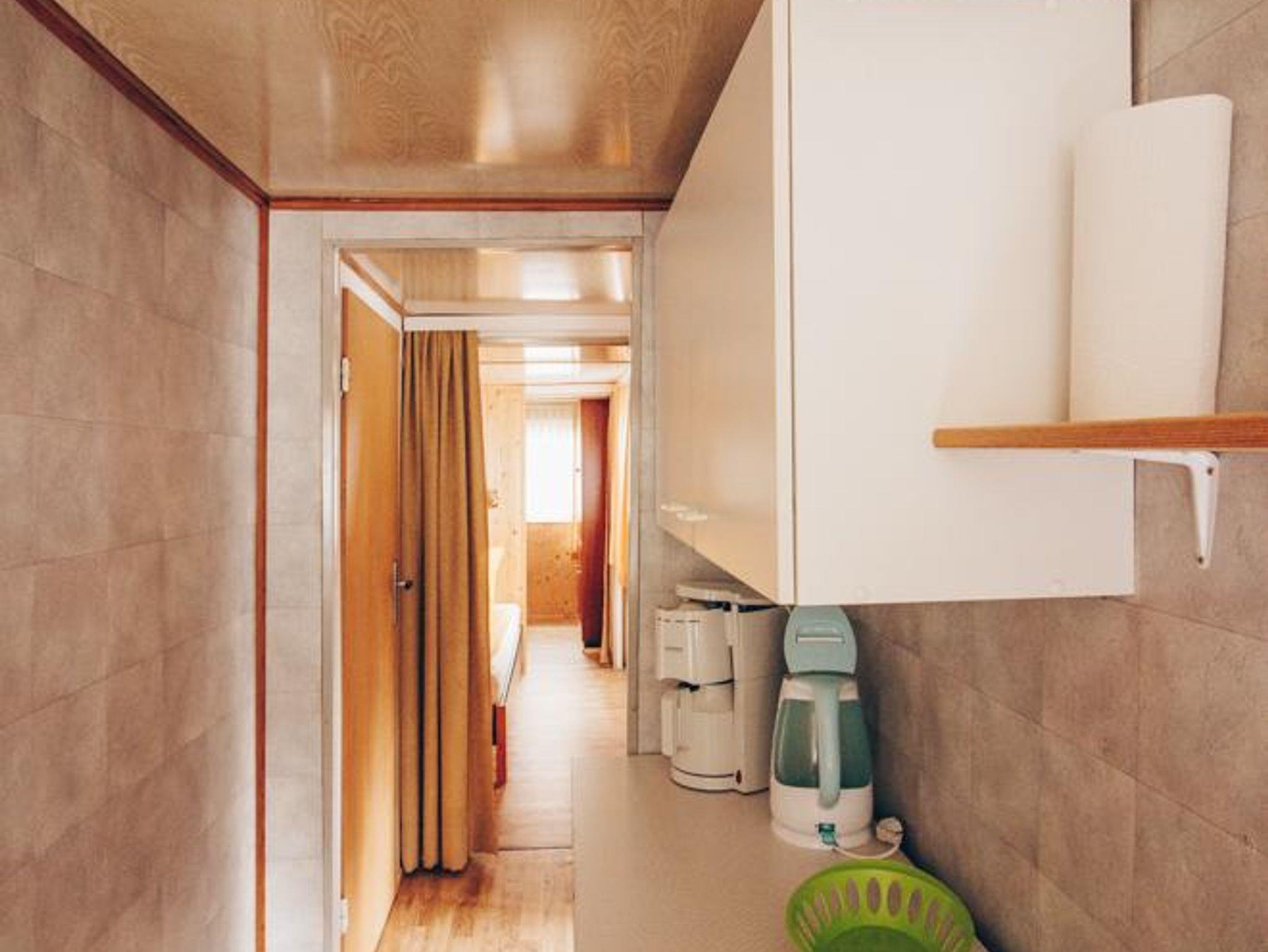 Es sind 5 Schlafmöglichkeiten vorhanden. Zwei Schlafzimmer, die durch eine Schiebetür getrennt sind, besitzen je ein Doppelbett. In einem getrennten Schlafraum befindet sich ein Einzelbett. Das Sofa im Wohnzimmer kann nötigenfalls als zusätzliche Aufbettung genutzt werden. Der Bungalow ist mit einem Bad mit WC ausgestattet. Eine Dusche verfügt der Bungalow nicht. Daher wird dieser preisgünstiger angeboten. Zum Duschen können die Gemeinschaftsanlagen des Campingplatzes genutzt werden. Vor dem Eingang befindet sich eine überdachte Terrasse.