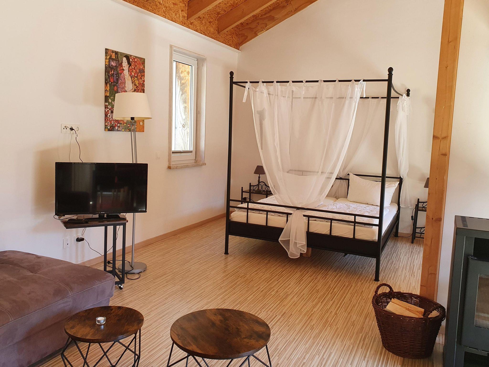 Der großzügige und offene Wohn- und Schlafbereich mit romantischem Himmelbett, einem großen Ecksofa und dem wärmendem Kamin sorgen für Gemütlichkeit. Das ausziehbare Sofa bietet gegebenenfalls Platz für zwei weitere Personen zum Schlafen. Der Küchenbereich ist mit einem Herd und Backofen ausgestattet. Direkt daran grenzt der offene Essbereich. Von dort aus gelangt man außerdem direkt auf die angrenzende und sichtgeschützte Terasse. Das moderne Bad bietet eine Dusche und ein WC. Direkt vor dem Haus gibt es außerdem einen Parkplatz für alle, die mit dem PKW anreisen.