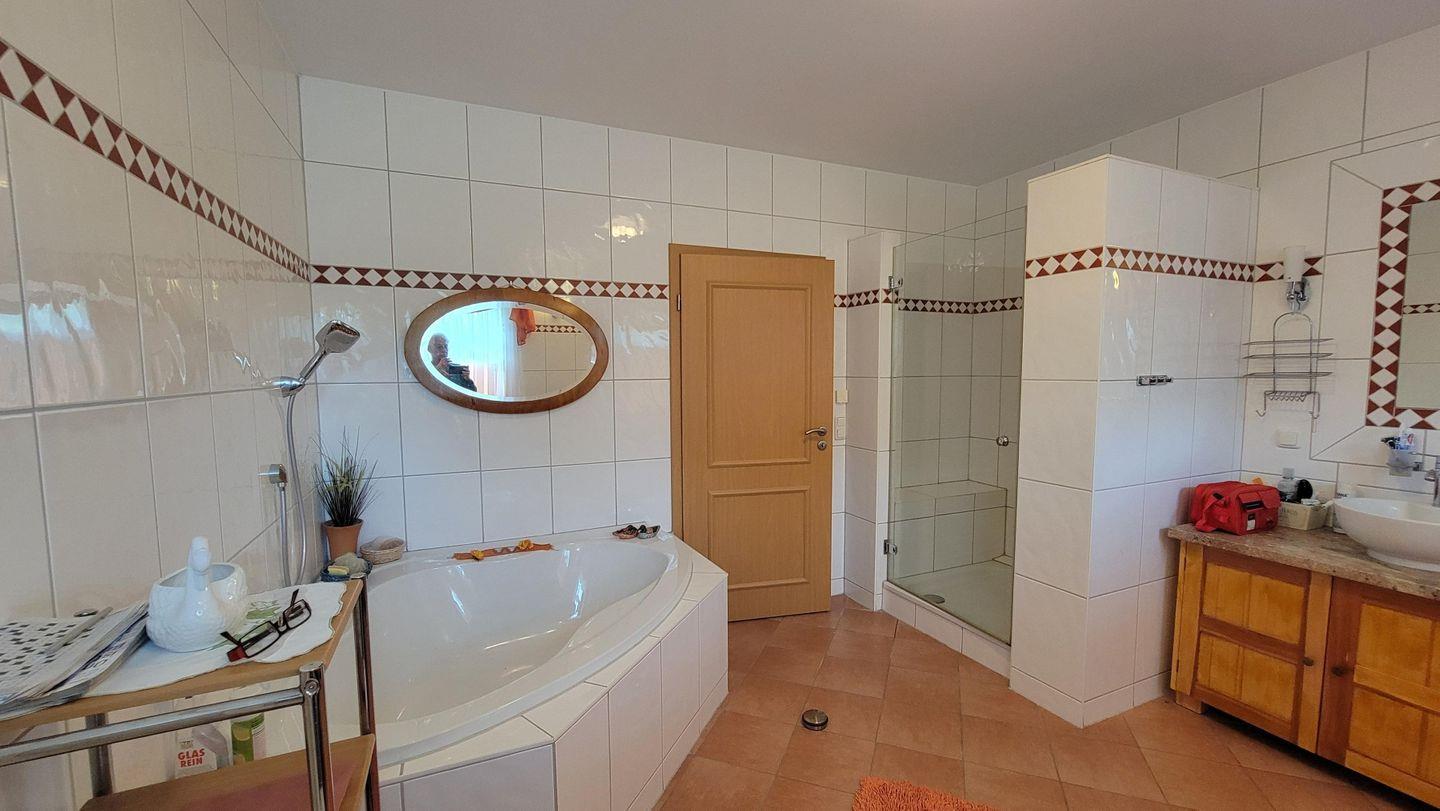 Großes Badezimmer mit Eckbadewanne, Doppelwaschbecken, Dusche und WC