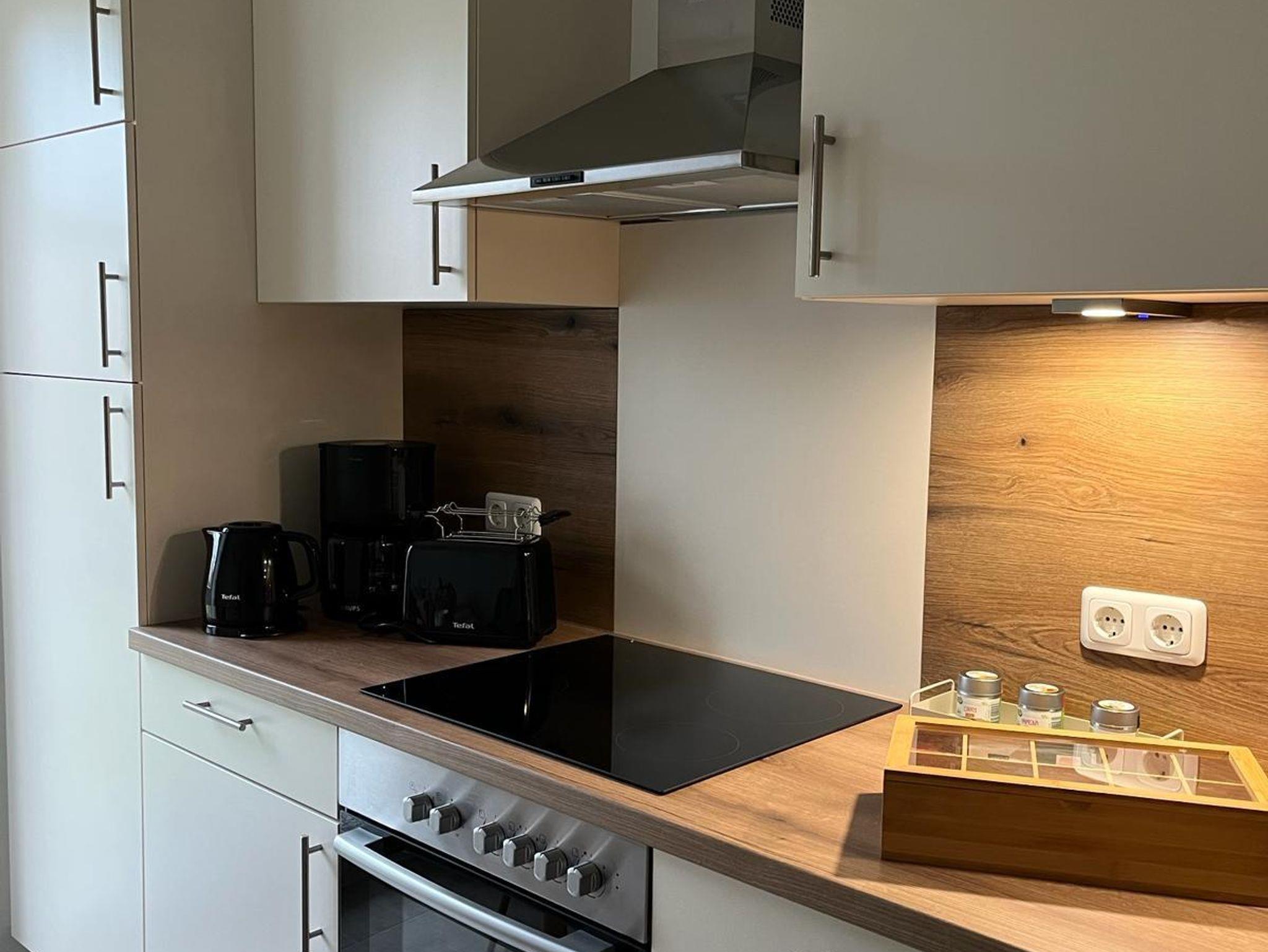 1 Einbauküche mit Ceranfeld, Backofen, Geschirrspüler, Kühlschrank, Gefrierschrank, Mikrowelle, Kaffeemaschine, Toaster, Wasserkocher
