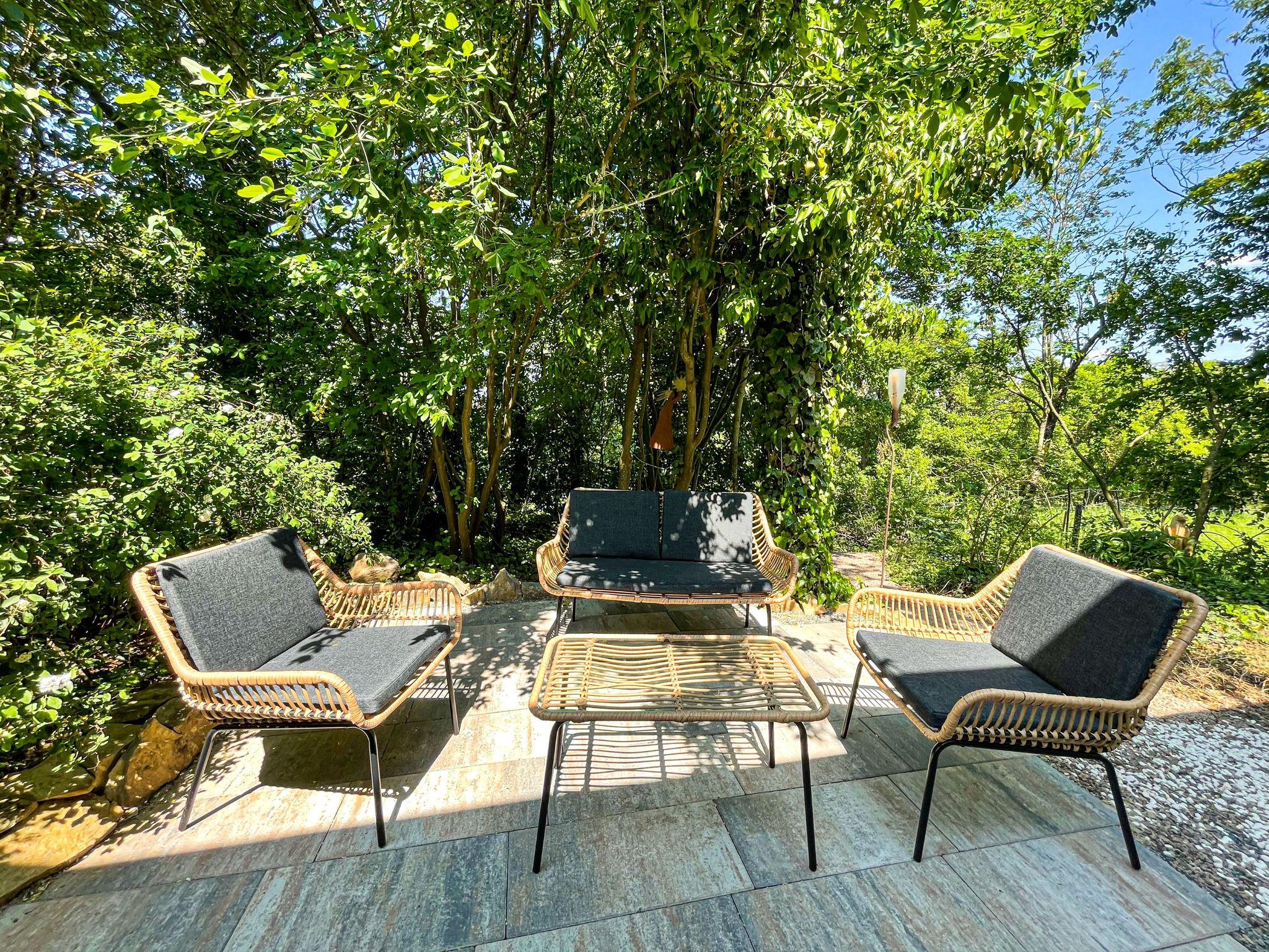 AUSSENBEREICH:2 Terrassen mit Gartenmöbeln / eigener separater Gartenbereich mit Ausblick in die Natur / Feuerstelle / Liegestühle / Sonnenschirm / E-Bike-Ladestation / Parkplatz (nur für Gäste und Gastgeber)